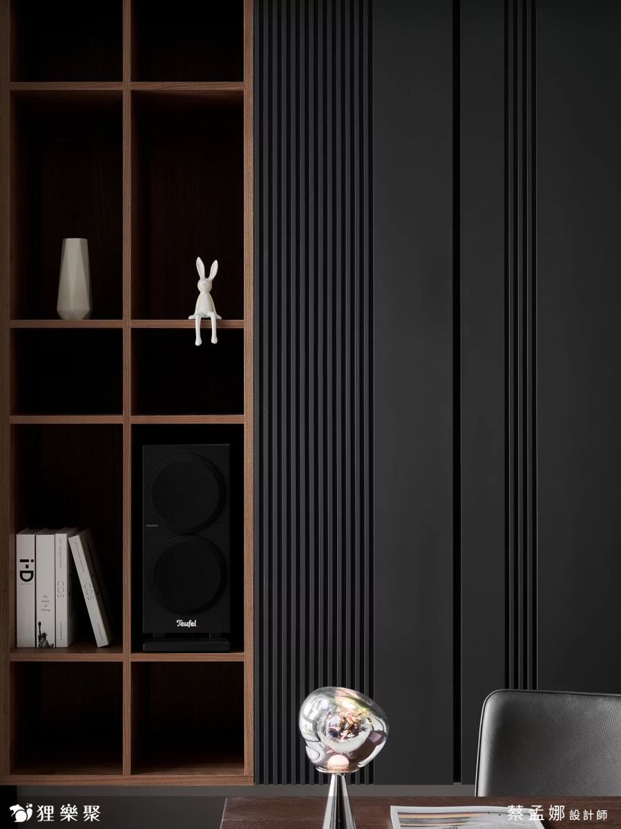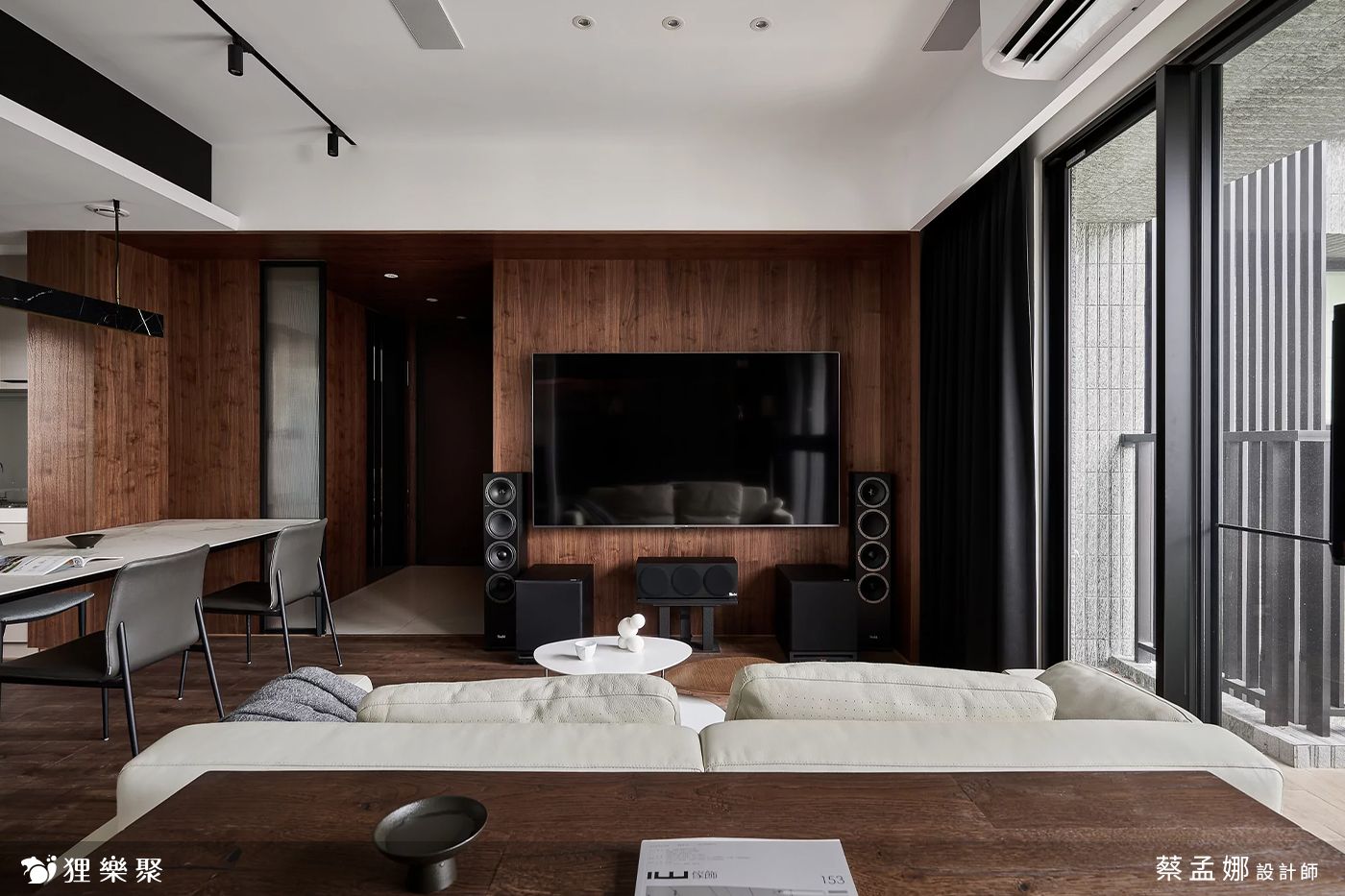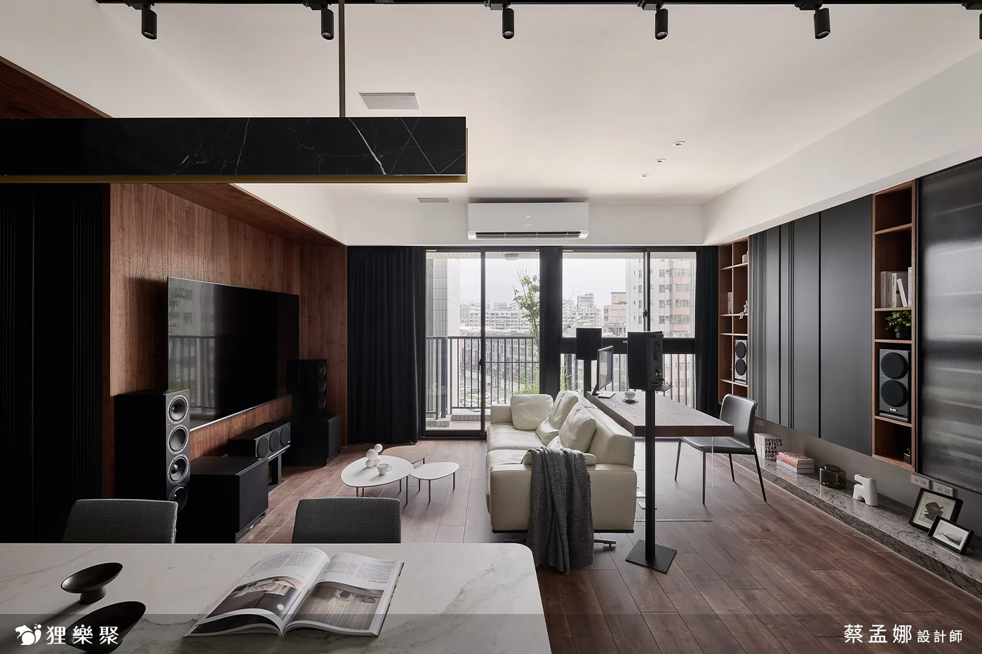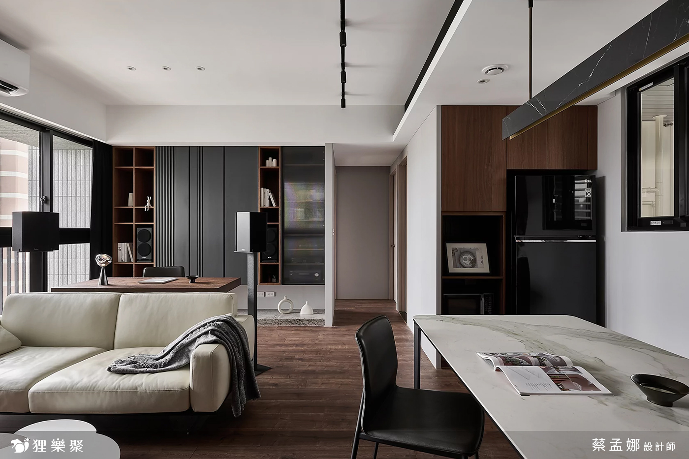 由於原始玄關將客廳與廚房牆面隔開,使空間變得破碎不完整,因此設計師將玄關的木材質延續至客餐廳牆面,同時利用玄關鞋櫃的深度,加寬客廳電視牆面,使整體視覺感一致。將一房格局打開變成開放式書房,讓公領域變得更加寬敞開闊,打造能閱讀、工作、觀影的高機能視聽宅。