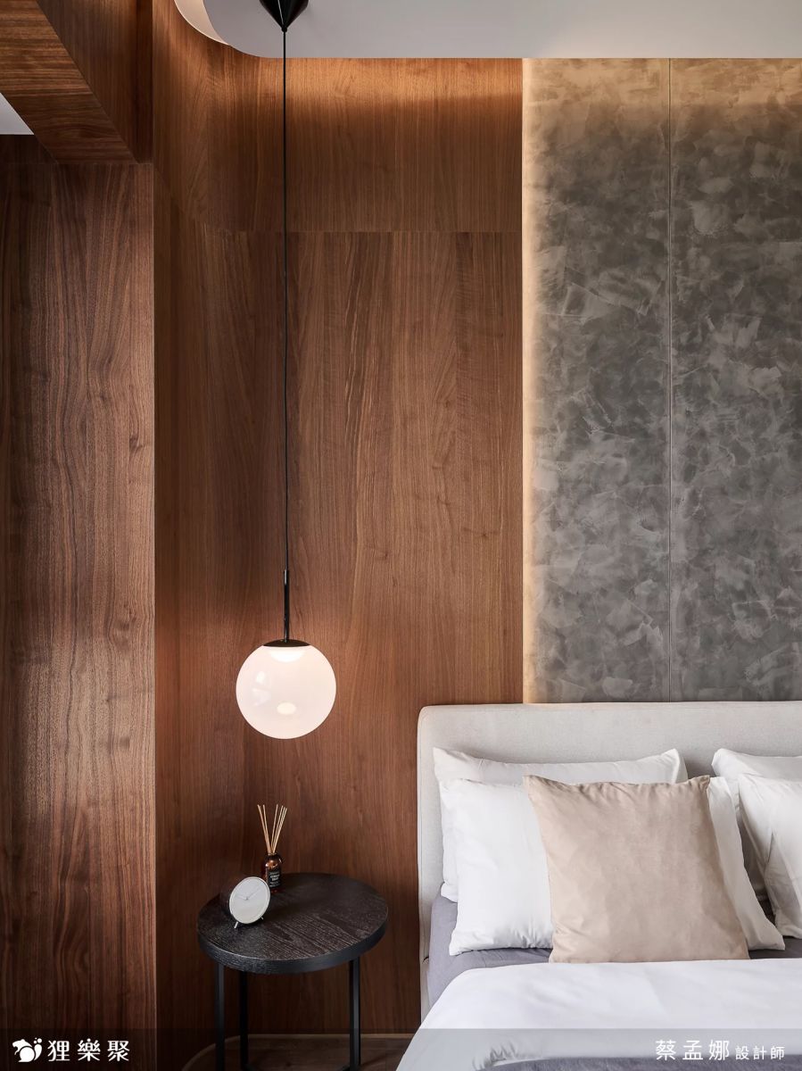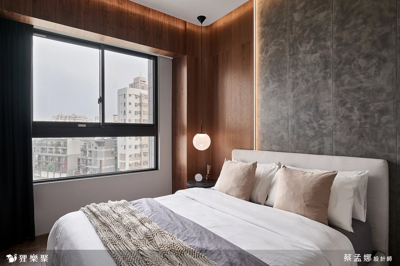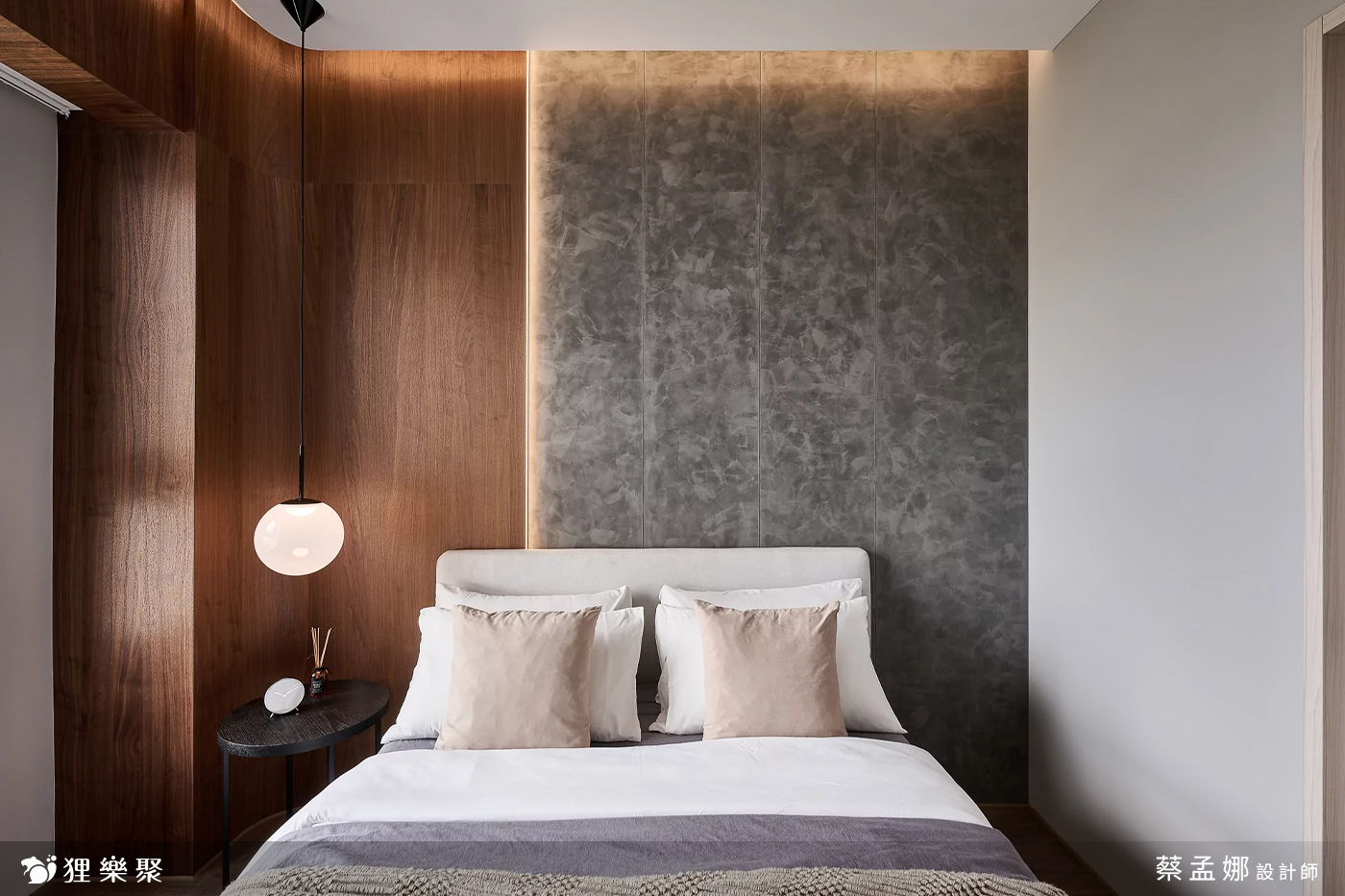主臥室靠窗處因為原始樑柱結構位置而限縮了牆面,設計師將一部分牆面造型結合圓弧線條同時包覆樑柱,搭配光源燈帶的設計手法突破既有框架,使牆面的視覺延伸,放大整體空間效果,打造舒適好眠的簡約風裝潢臥室。