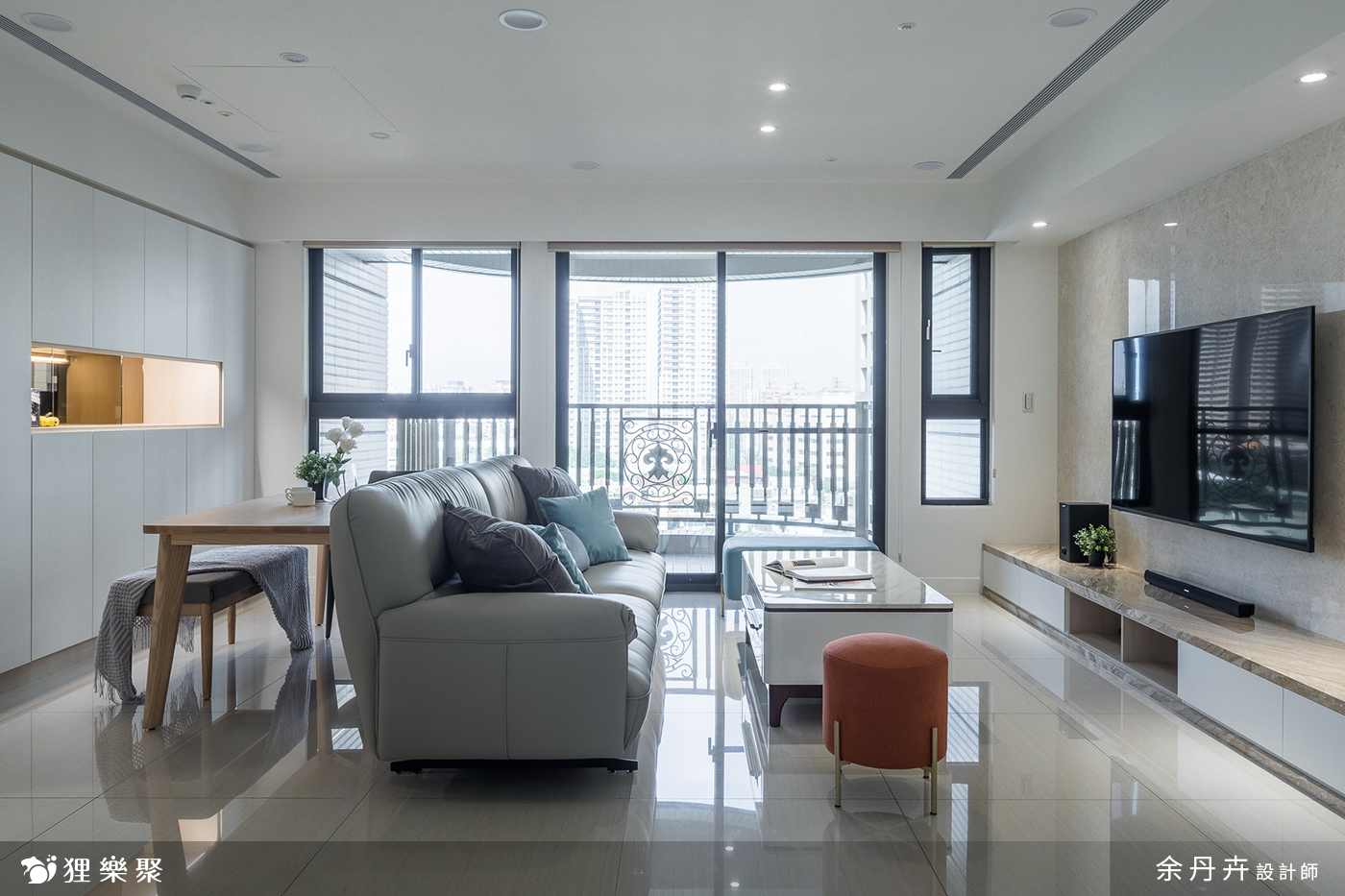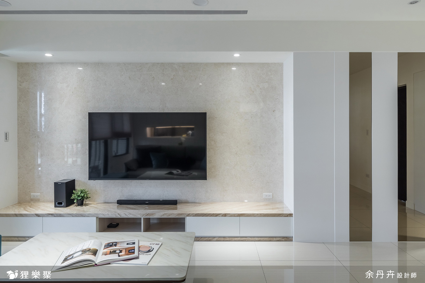 選擇使用低彩度的色調做簡約的房間設計,分別漆上乾淨白色和柔和淡粉色的主牆,並以房間主人所喜愛顏色挑選軟裝來搭配,打造出有獨特個性的房間,將舒適放鬆的氛圍完美呈現。使用石材來為電視牆做設計,地板則選擇拋光石英磚,亮面的材質隱隱地反射出明亮簡約的三房兩廳,整體視覺乾淨而大氣。