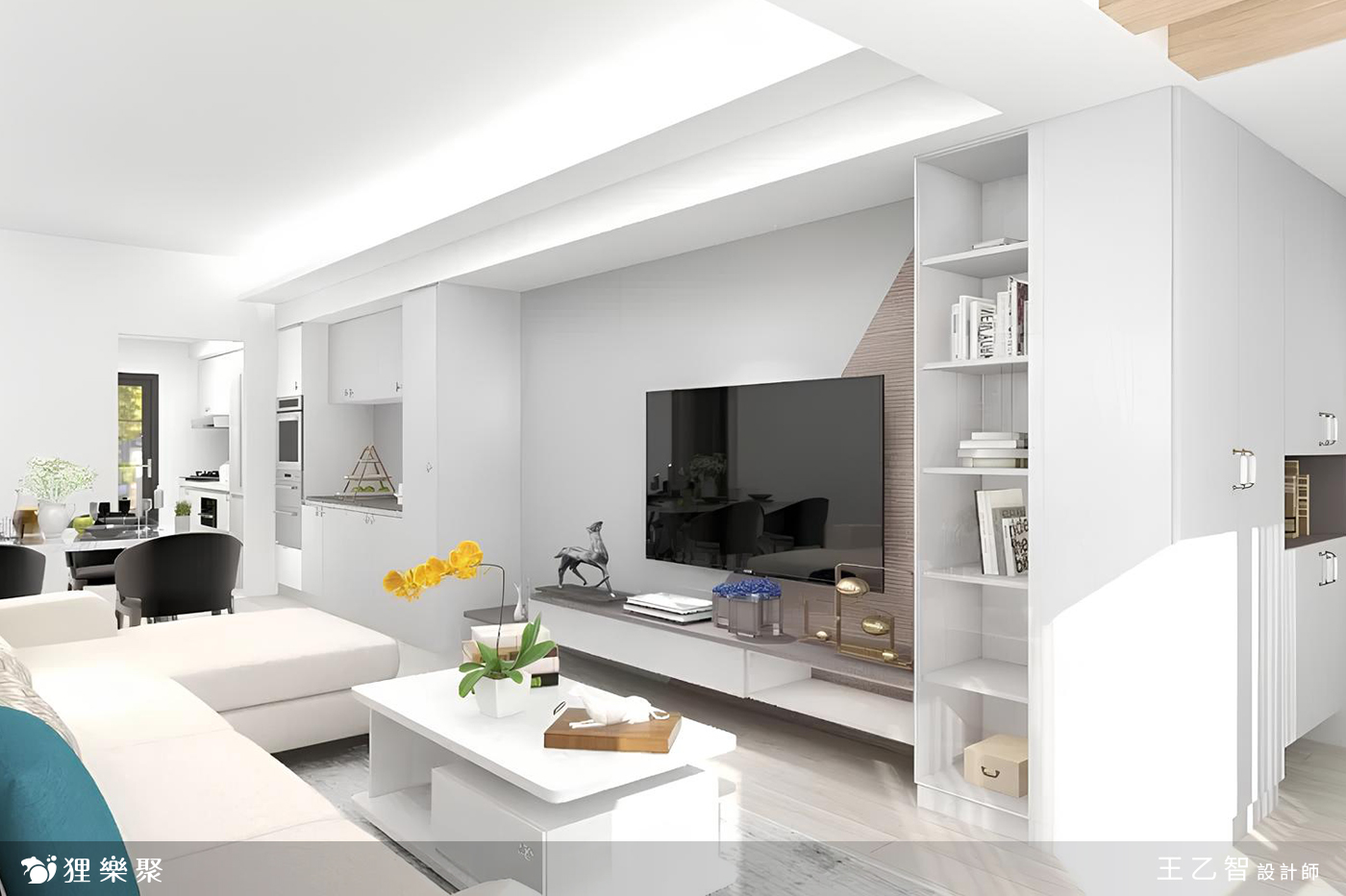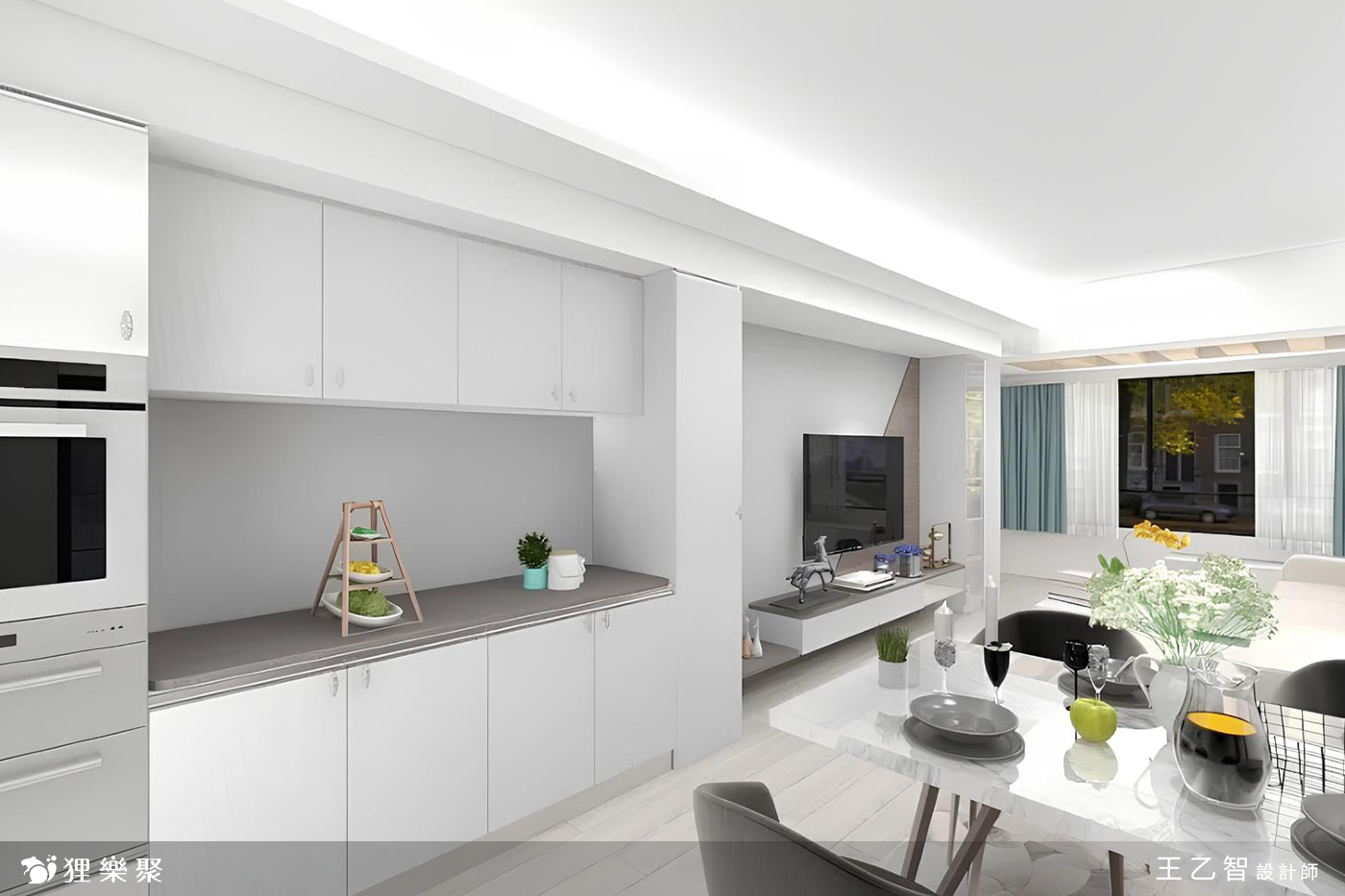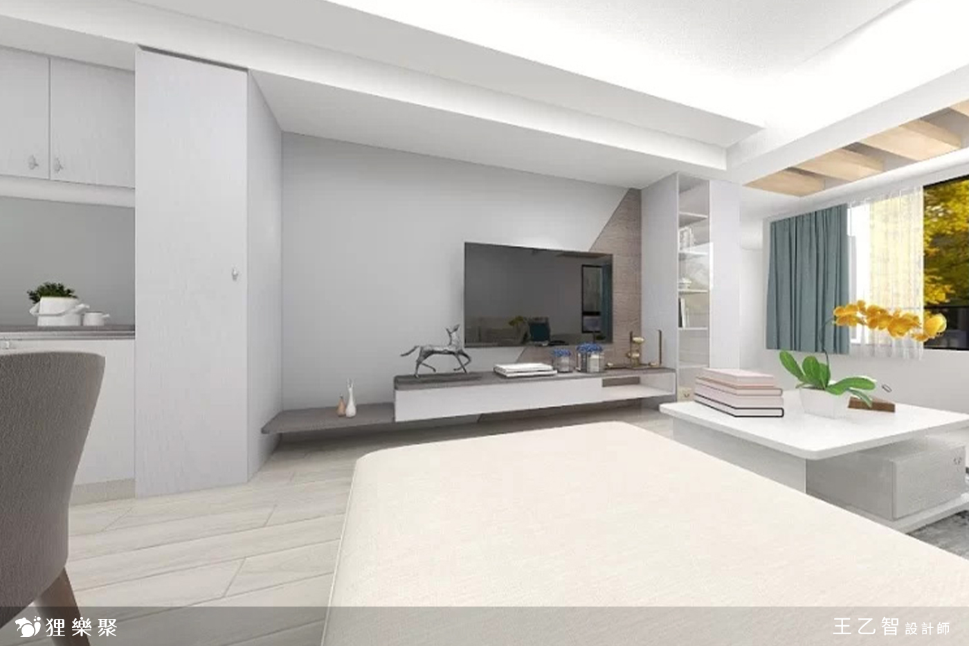 甫入玄關,就能感受到這是一間採光不錯的房子,北歐風格特色中,充足的自然光是相當重要的條件,適度的「留白」亦是北歐設計風格中的一大要素,從玄關轉入客廳,以白色系為主的空間進入視野,可以看到櫃體基本上都選擇白色的面材,搭配些許的灰棕色調如檯面、餐椅,同時隱隱約約透出現代風的味道,俐落的傢俱線條搭配造型電視牆面,將現代北歐風的混搭感揉合得恰到好處;而地板選擇使用偏淺的超耐磨木地板,視覺上相當清爽乾淨,讓屋主能夠在入住後,以生活的痕跡來填滿空間中的留白,創造獨屬於屋主一家的生活風貌。