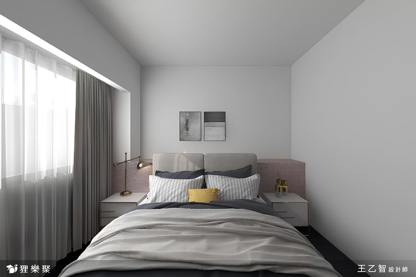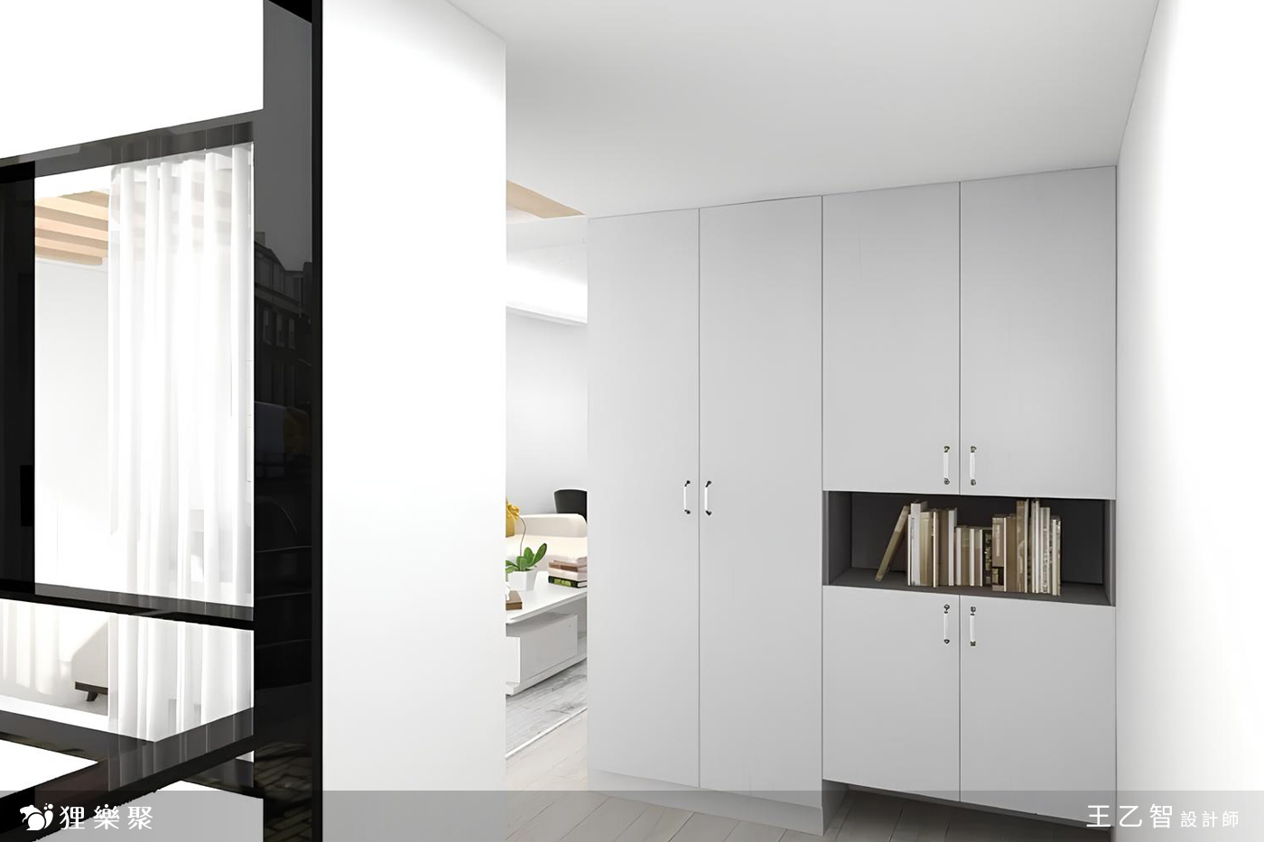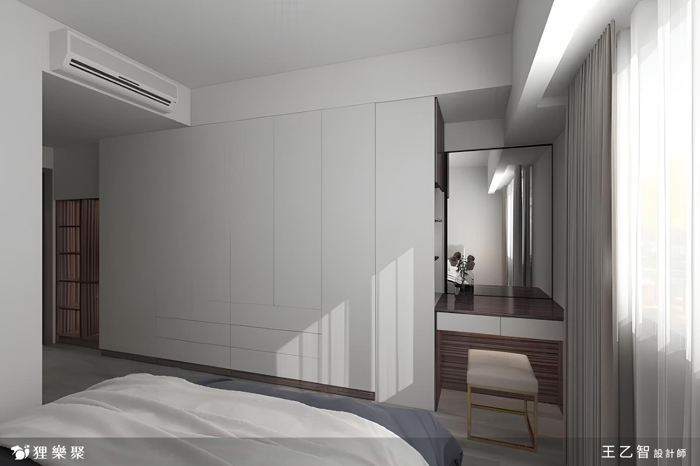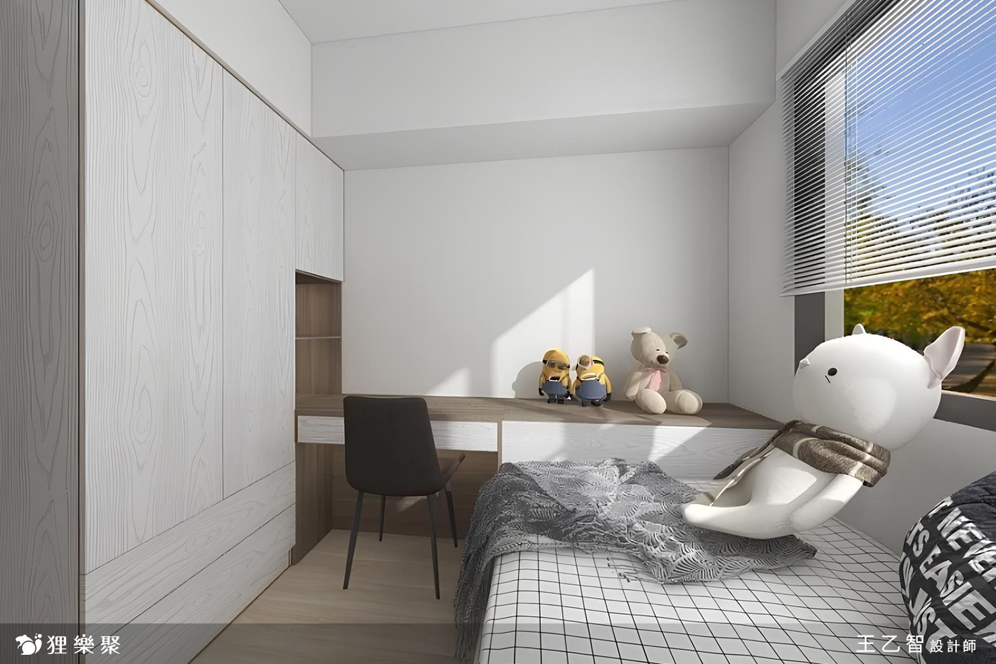 主臥利用系統床頭櫃將柱子產生的凹洞拉齊,系統床頭櫃除了可以增加收納空間外,修飾柱子的線條後也讓床的兩側走道能夠平分,放入兩側的現成床頭櫃後視覺上才會足夠對稱。而床的對面就是大面的衣櫃和化妝台,衣櫃門同樣選擇白色的面材,除了呼應公共空間中北歐風元素外,也弱化了櫃體的存在感,將視覺空間放得更大;次臥則是相當常見的衣櫃、桌子與臥榻床一體設計,收納機能充足,是將空間利用最大化的配置方式。