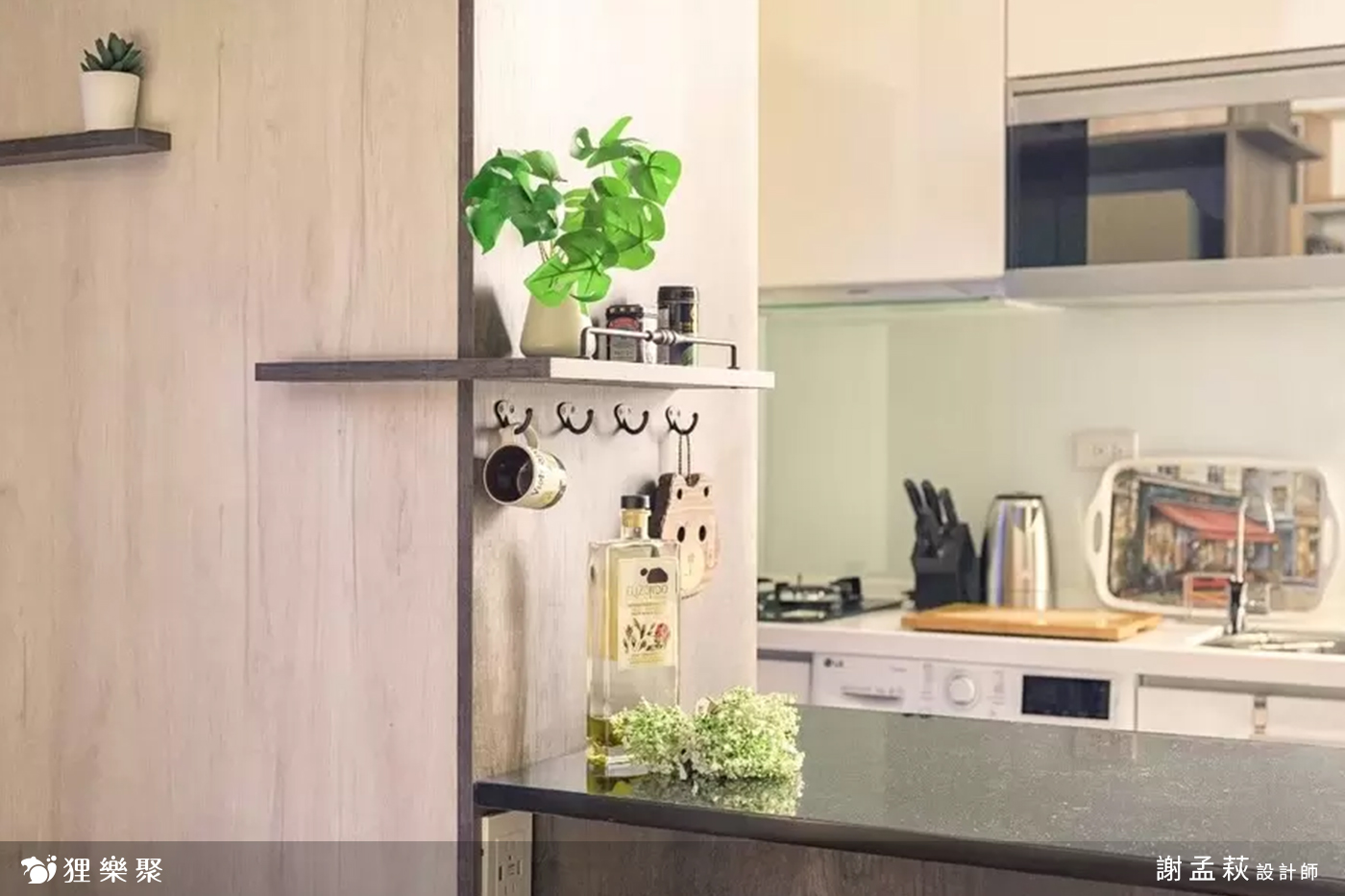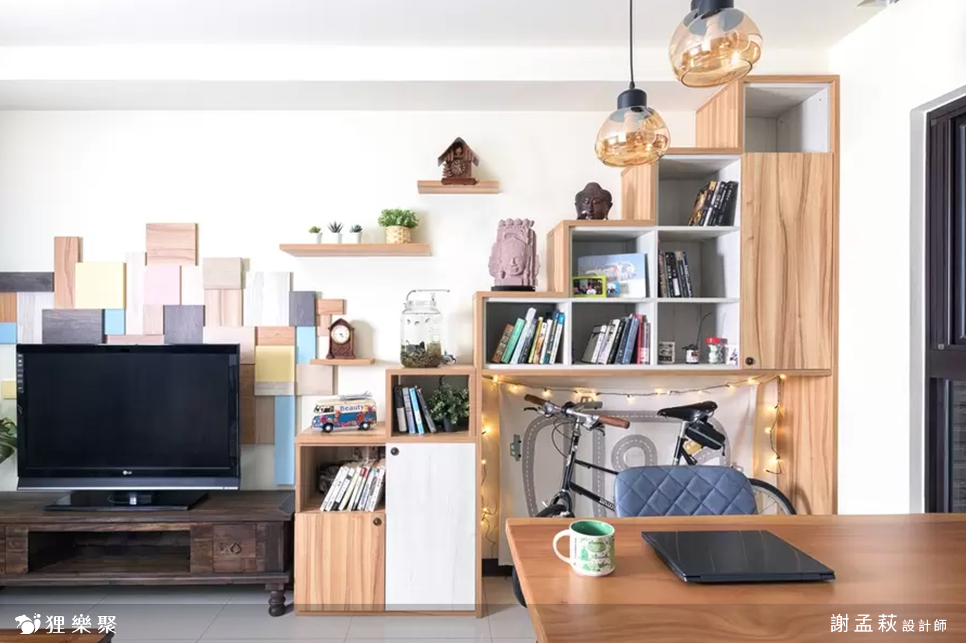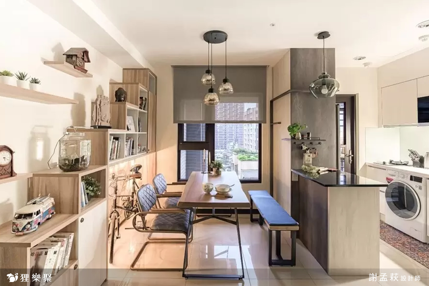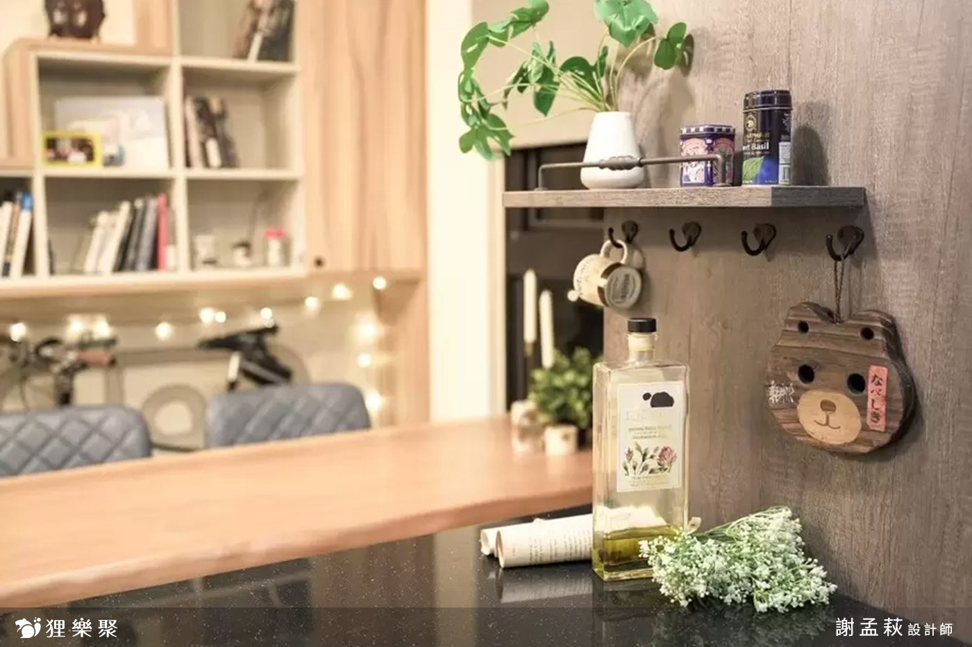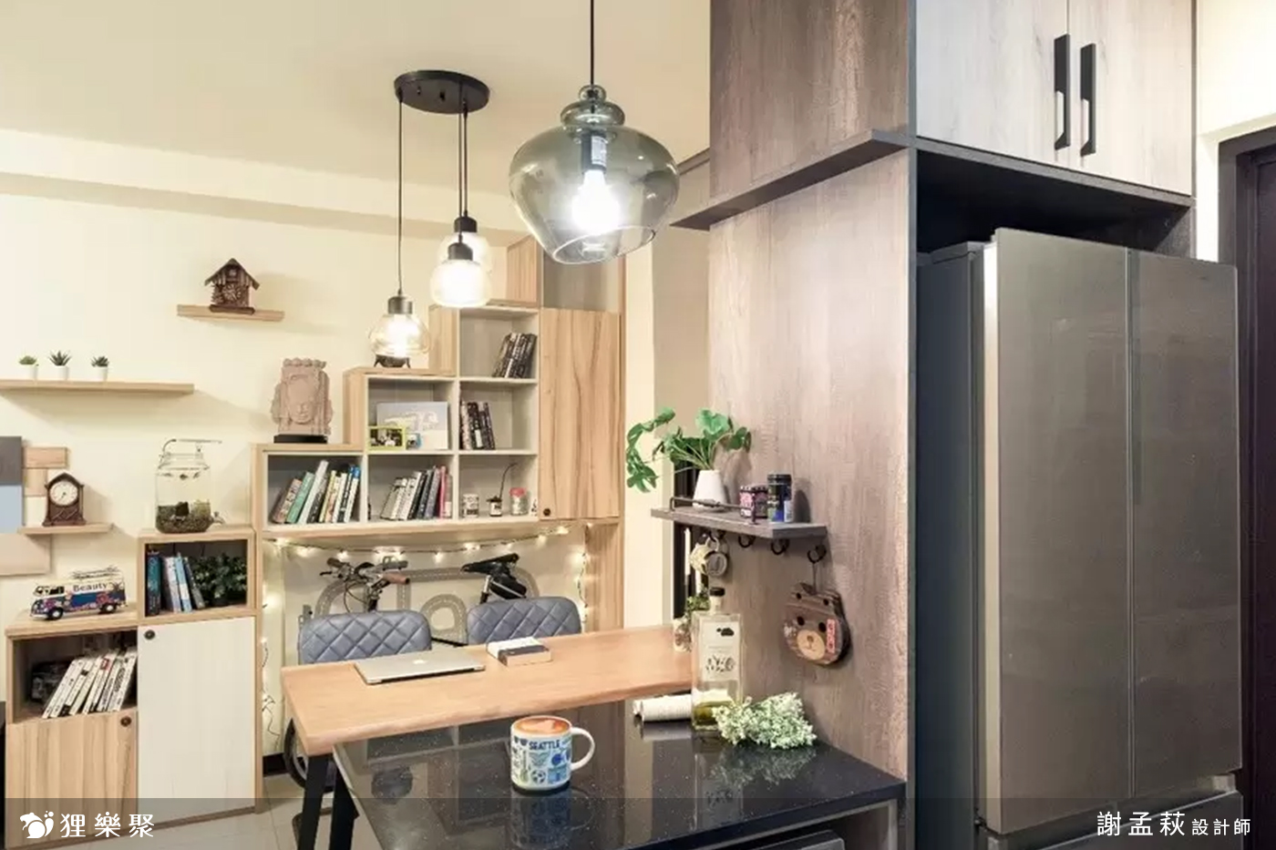 廚房與餐廳空間以冰箱櫃及小吧檯做分隔,因為餐廳的空間不大,後方的櫃體規劃展示用途為主,避免拿取東西的不便,展示櫃利用階梯式的櫥櫃,可向上延伸擺放展示品,在低於視線以下的空間則成了腳踏車收納的好去處!