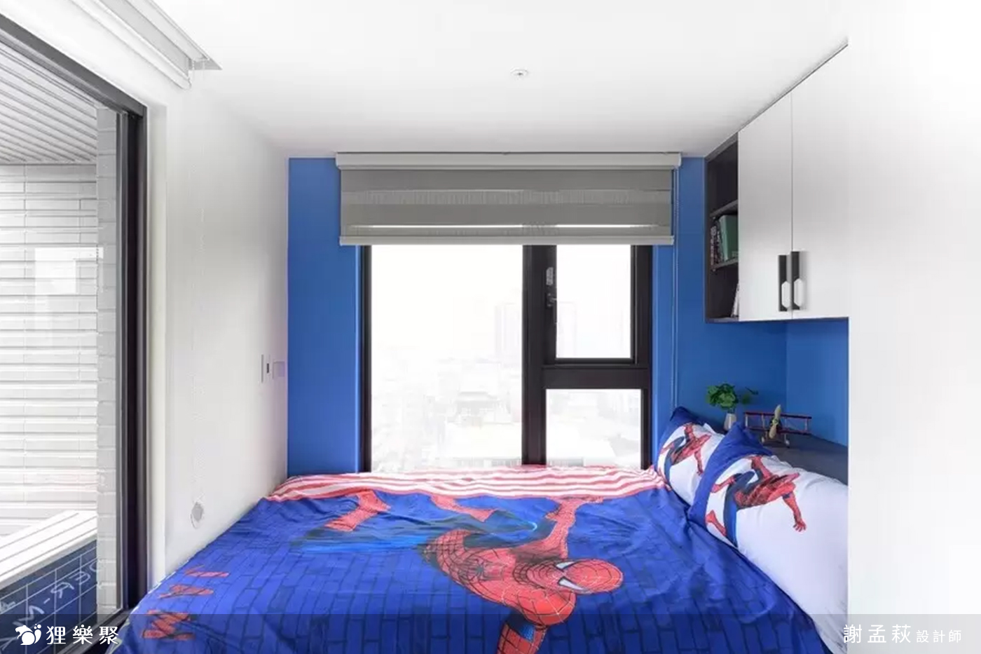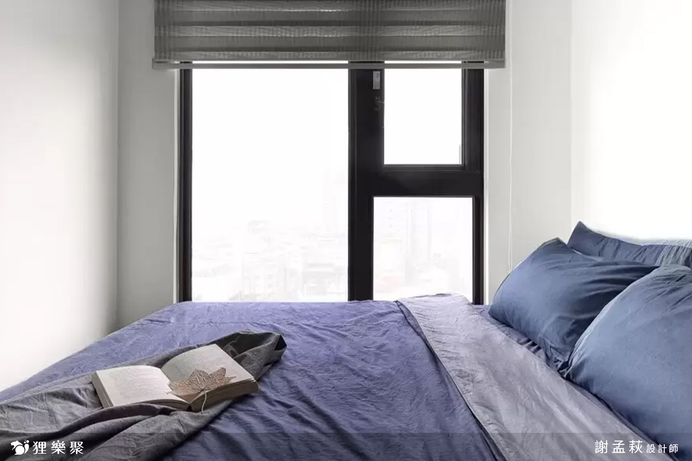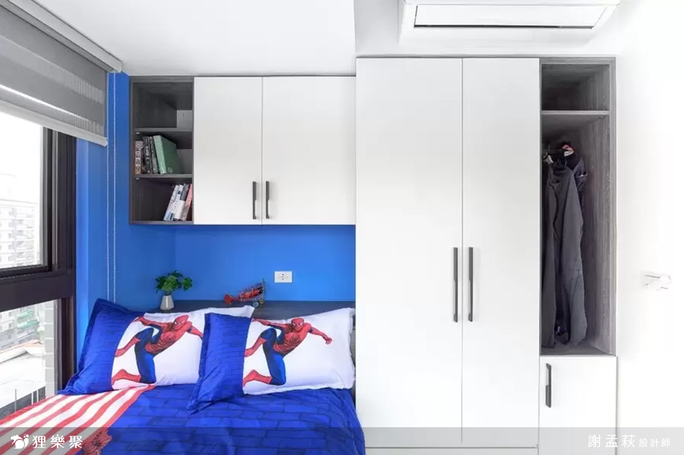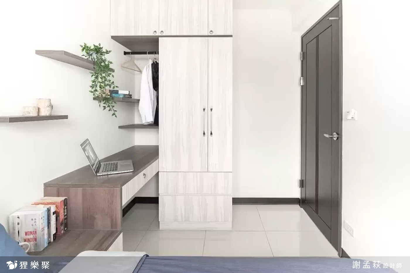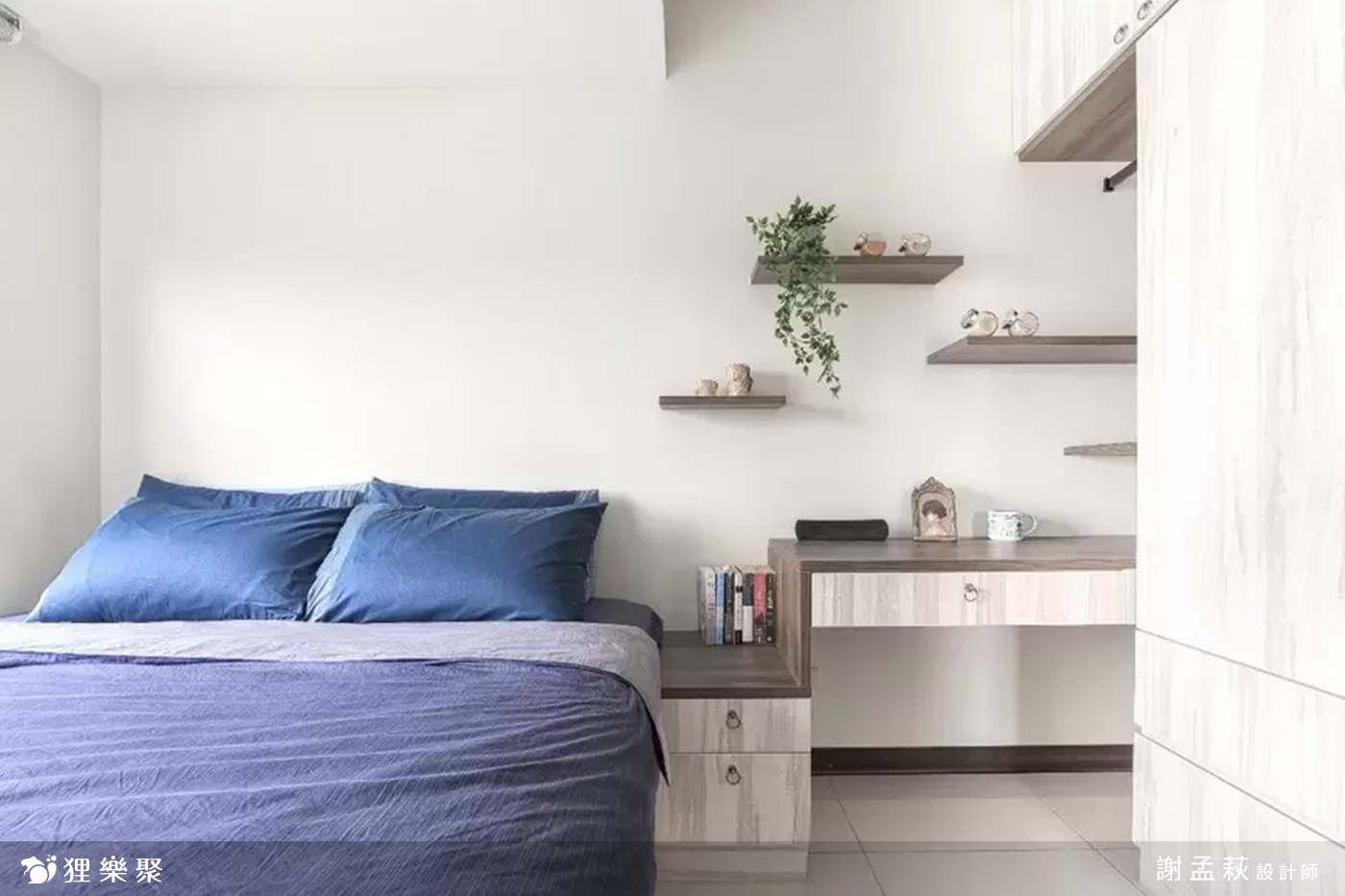 不到2.5坪的臥室空間若買現成家具回來擺放,必然會產生許多畸零空間,設計師為客戶選擇系統櫃收納,能夠好好地利用每一寸空間,而床底下的收納不僅能簡化高櫃的聳立感,又能達到收納的機能,讓空間感不那麼狹小,是小坪數收納設計的小訣竅。