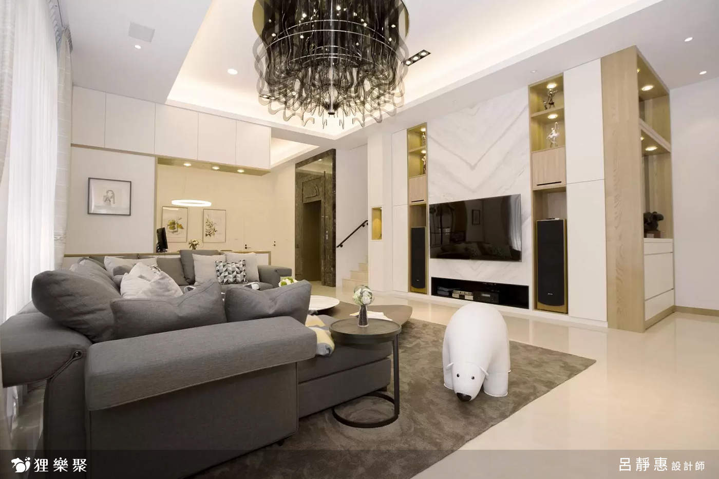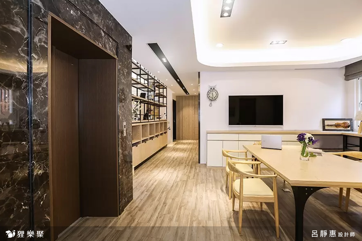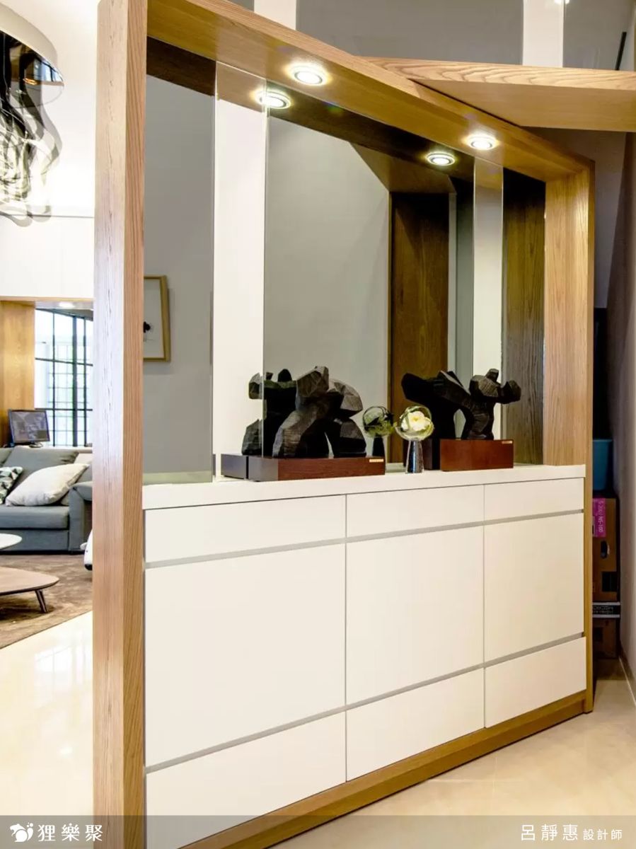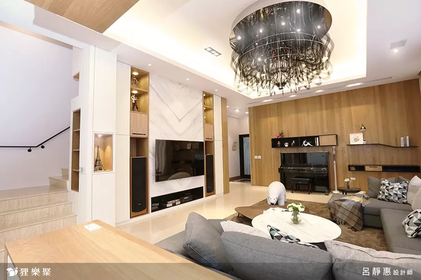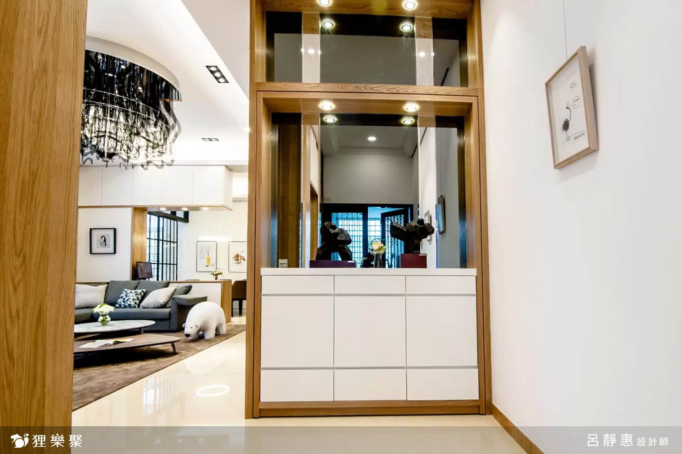 一樓入口玄關的暗門設計內藏暗房,運用樓梯下的空間作為儲藏室,作為收納換季電器用品等雜物的用途,可旋轉的玄關櫃則為暗門兼展示,既美觀又實用。而客廳的重點即是上方的雷切水晶吊燈,是業主自家工廠所生產,希望能時時警惕自己及家人不要忘本,立意深遠。