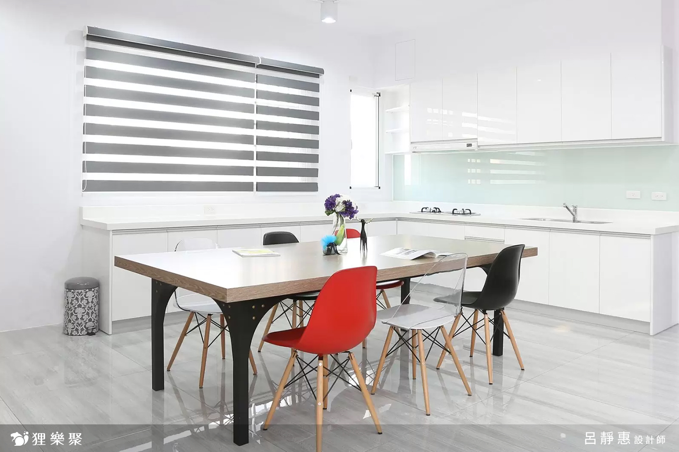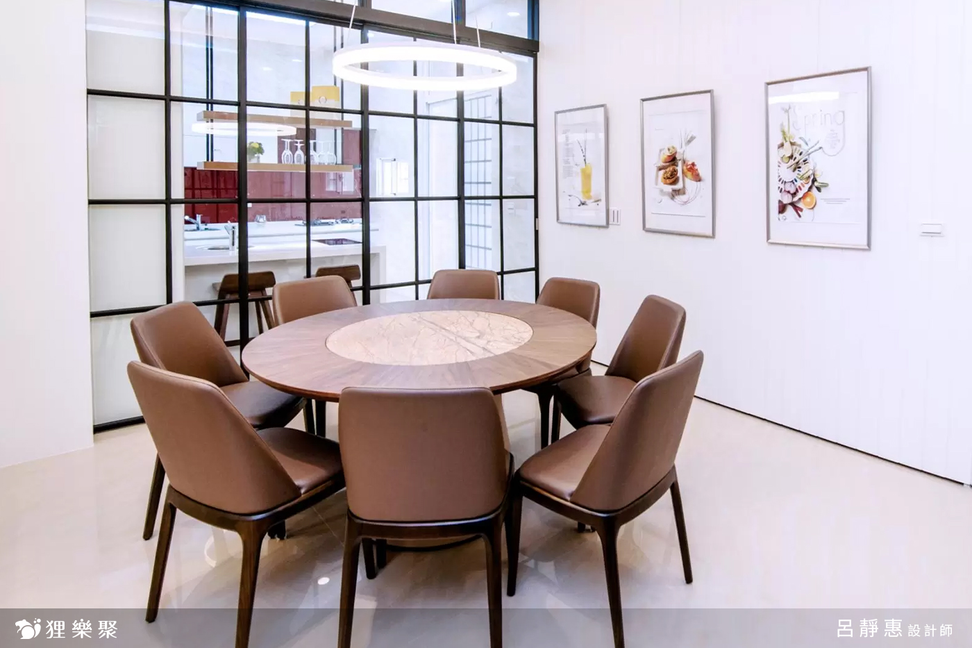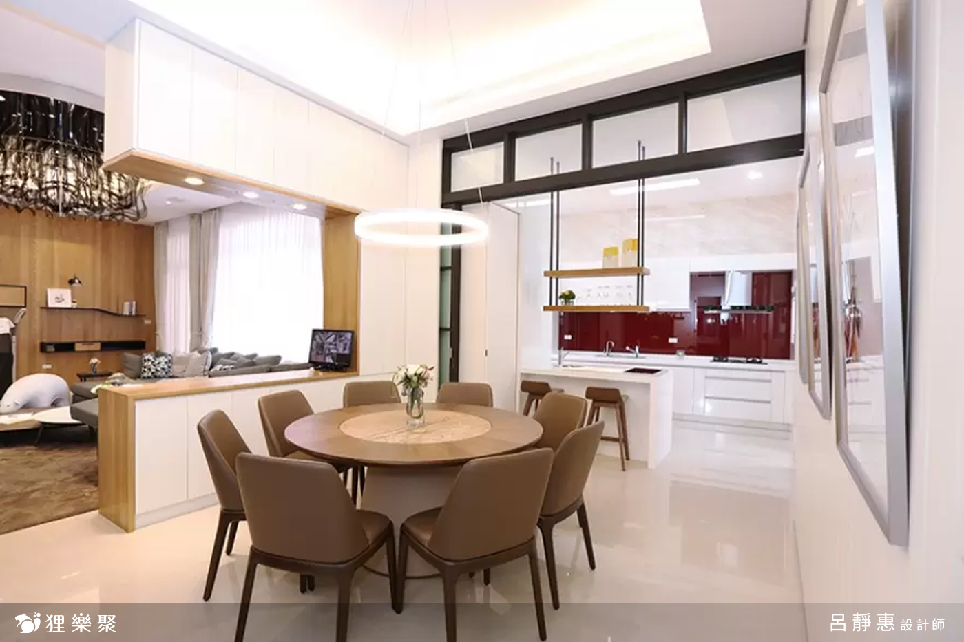 由於女主人本身很會料理,在餐廚區採開放式廚具及餐桌,最為招待親友的最佳場域,中間使用玻璃的推拉門做阻隔,擋去煮飯時的油煙,而餐桌樣式選擇大小圓的造型,上方也是圓型的吊燈,意味著「大小團圓的出發點」。