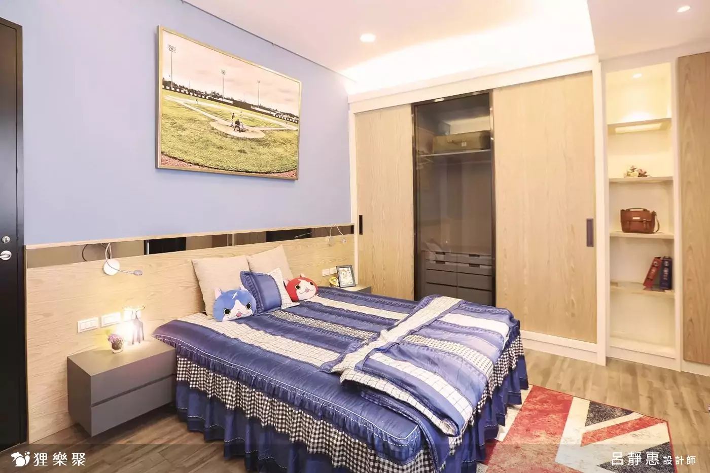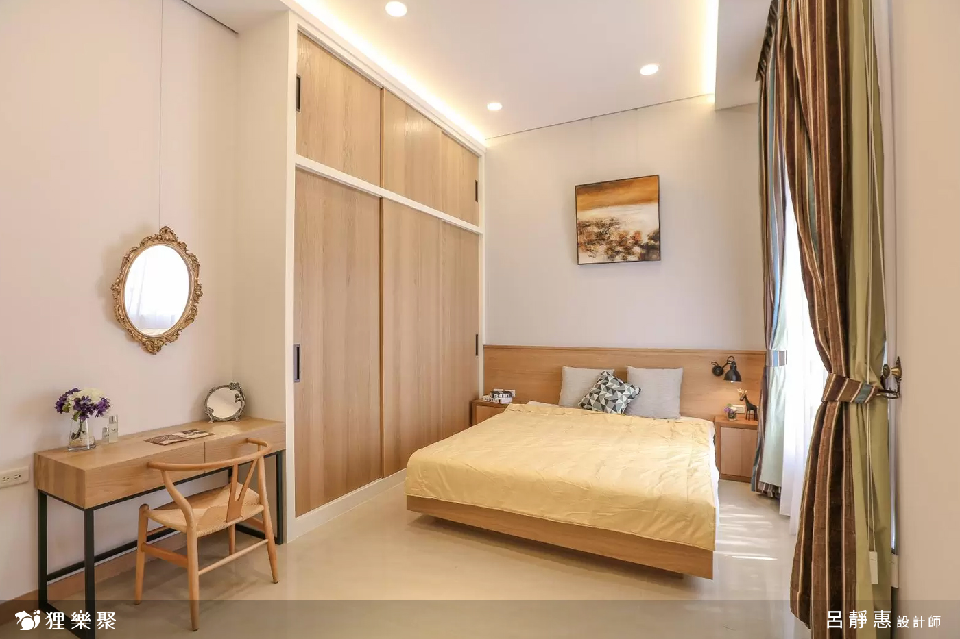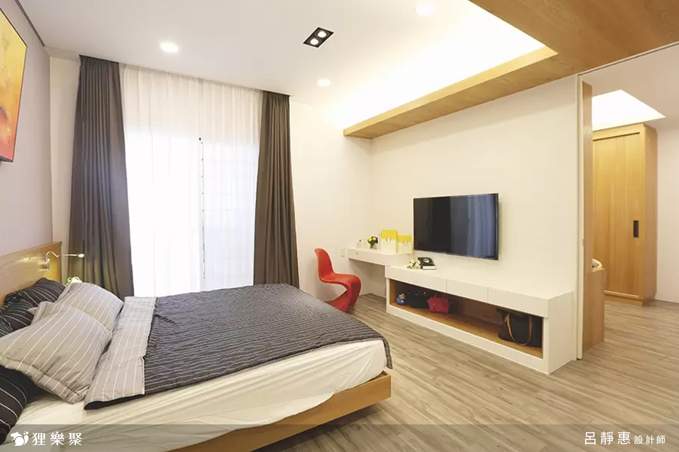 主臥室則利用隱藏式門片與木紋天花板,打造一種旅店的浪漫溫馨氣息,讓夫妻兩人辛苦工作後能夠好好放鬆。