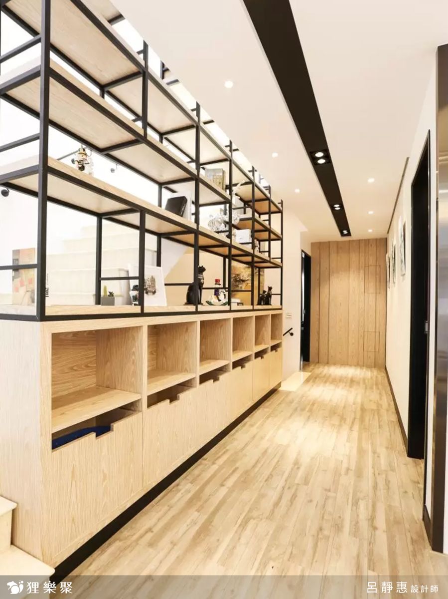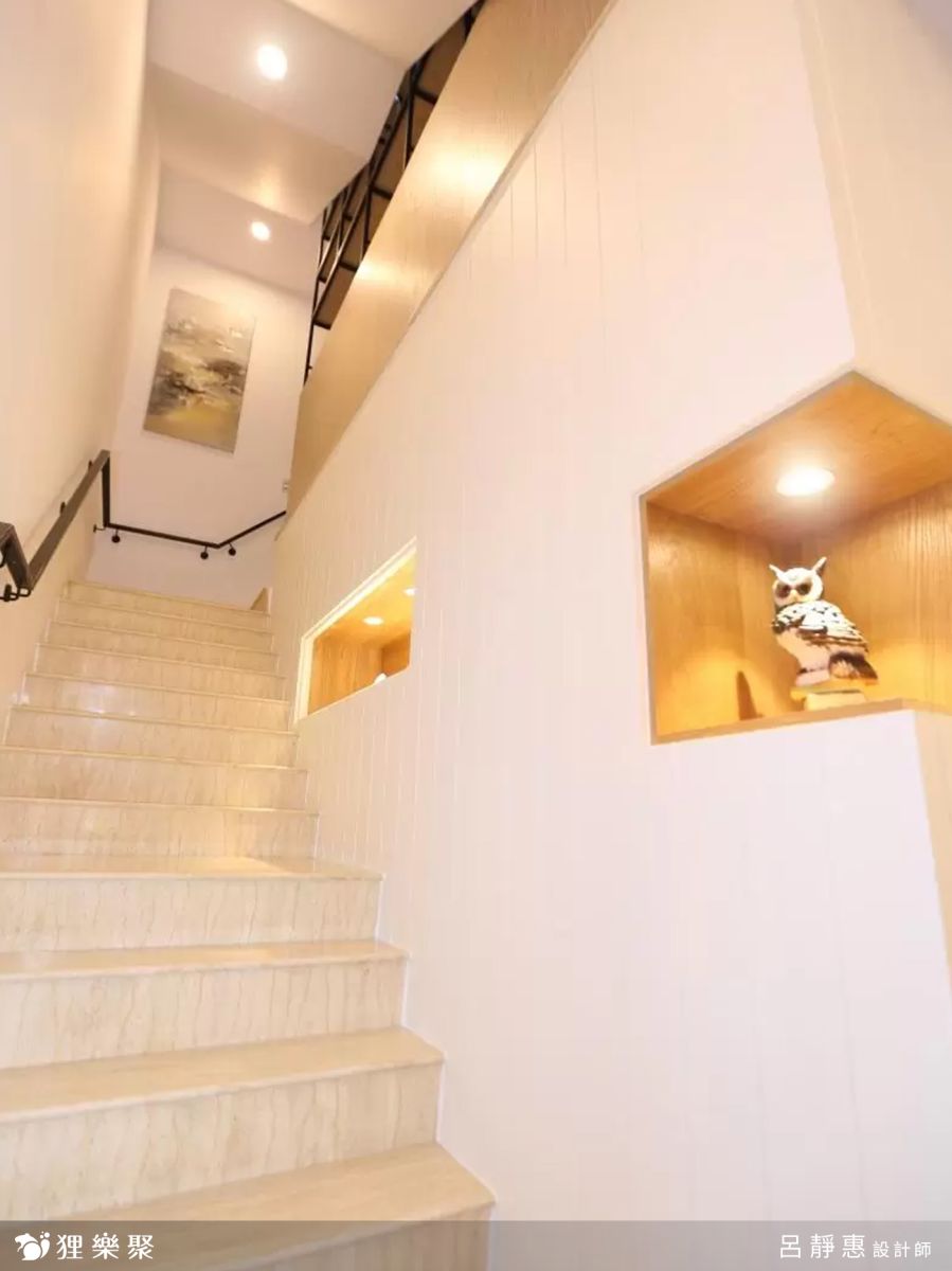 樓梯間以木作打造大面積的開放櫃來放置展示品,為業主整合軟裝及藝術畫作,與生活融而為一。