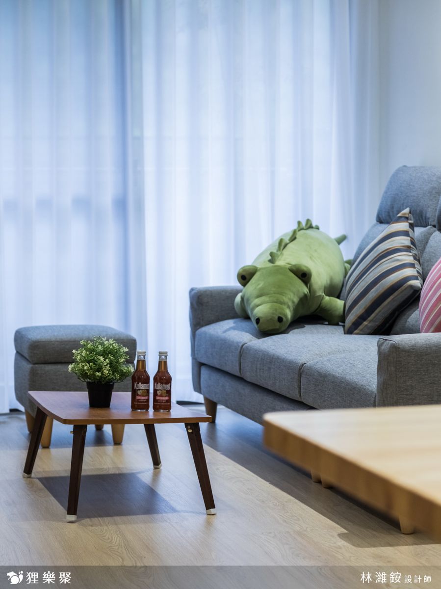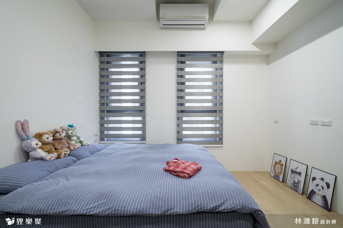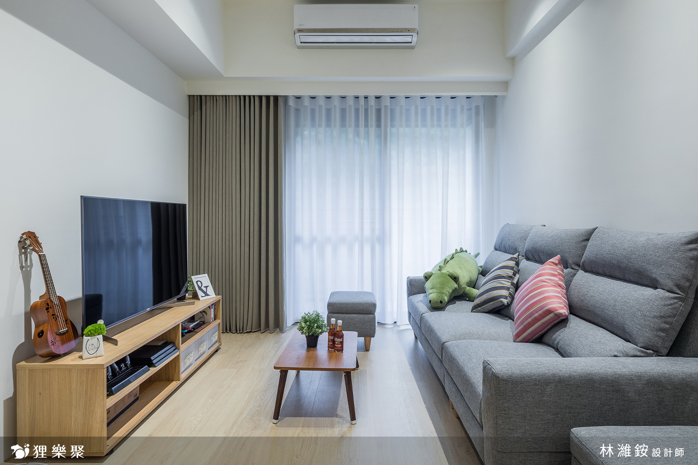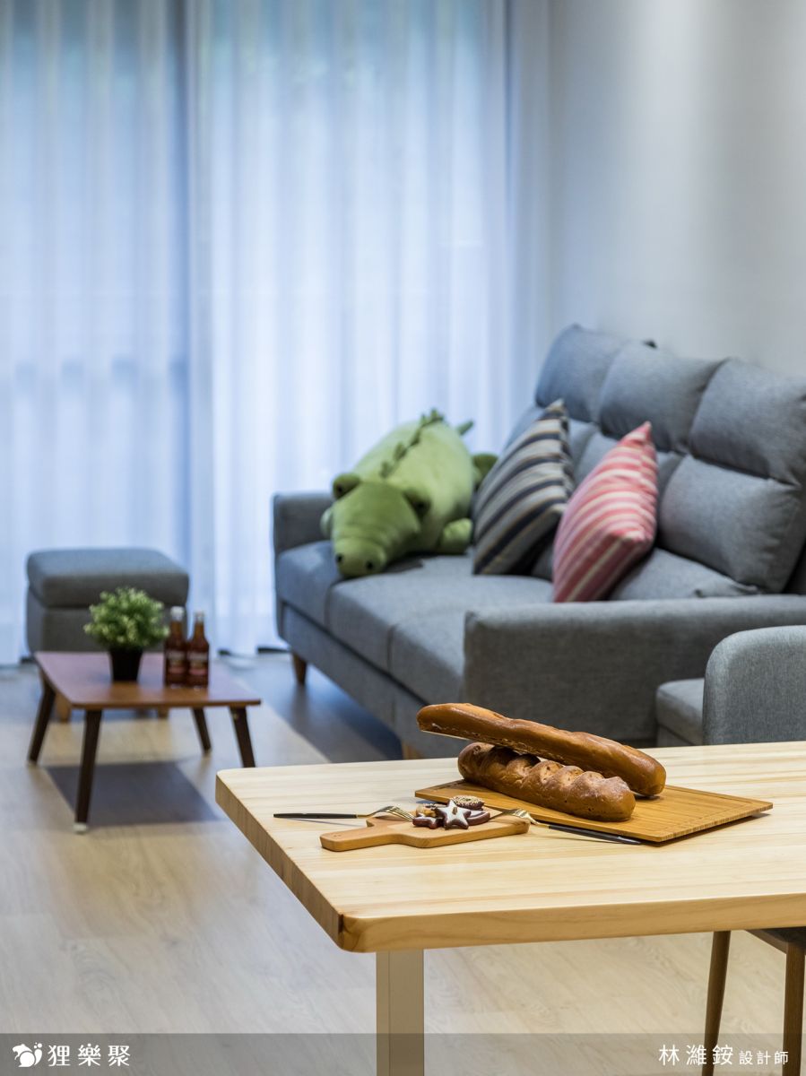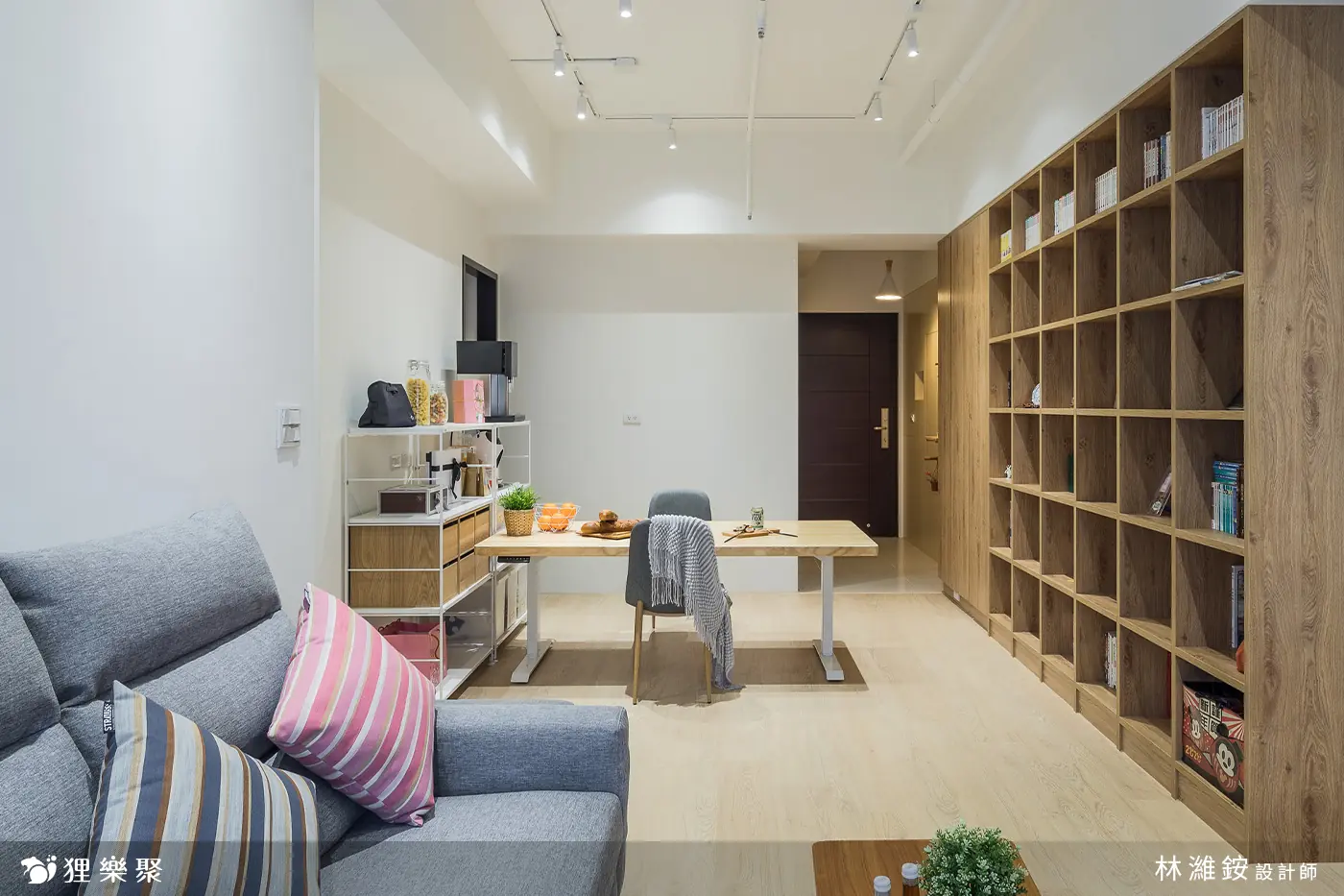 淺色木地板一鋪上,配上純白的牆面、簡約設計的木質櫃體及家具,無印的和風設計立刻呈現出來,輕鬆打造愜意的居住氛圍。由於整體坪數不算大,利用複合空間的配置能夠達到放大坪數的效果。客廳和餐廳中間不做任何隔屏,旁邊的書牆從餐廳延伸到客廳,讓客餐廳同時兼具書房的功能,讓屋主能夠多元地運用各個空間。
