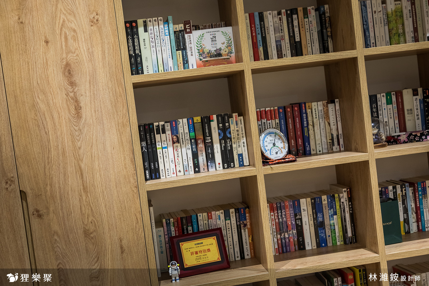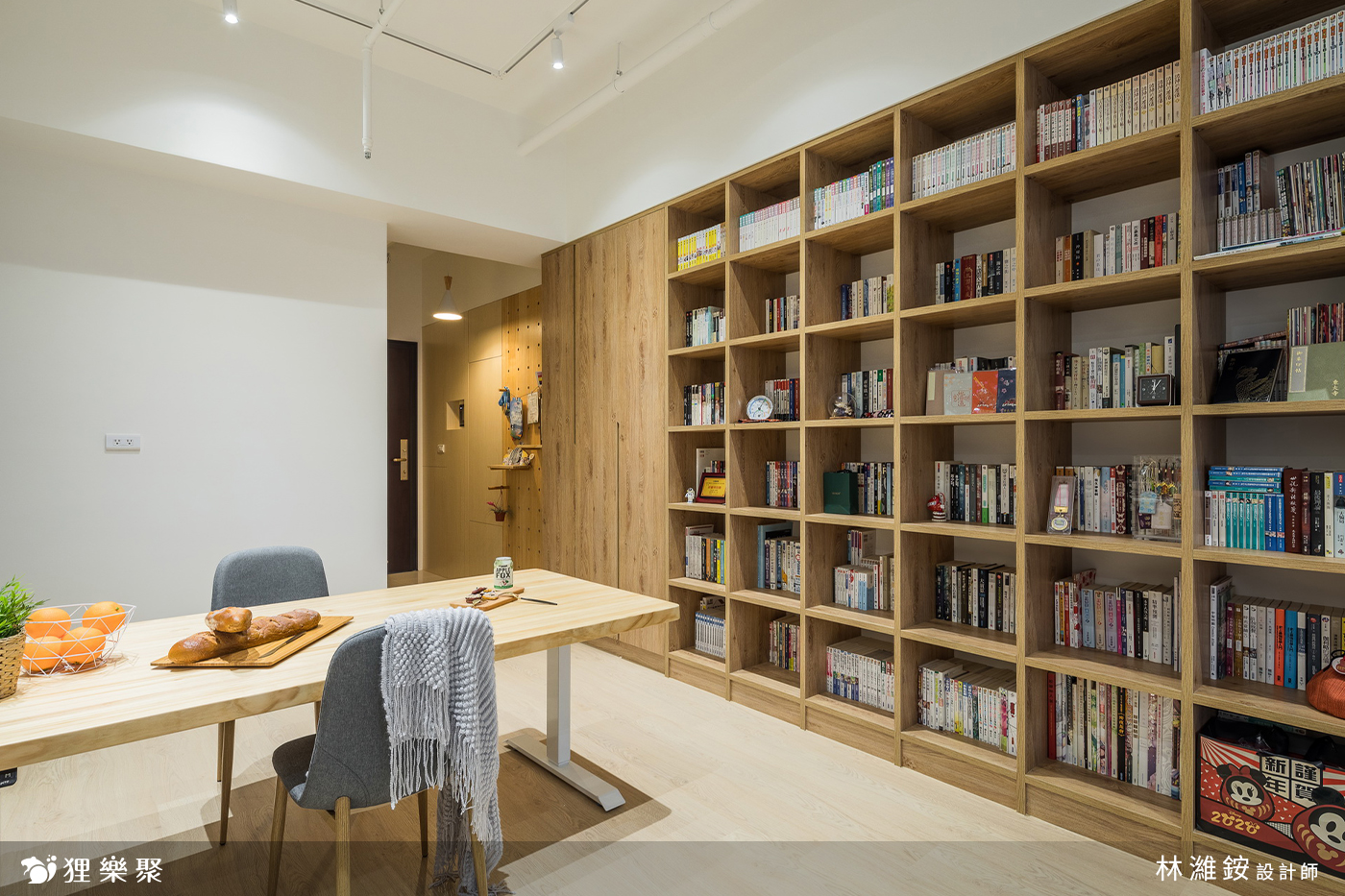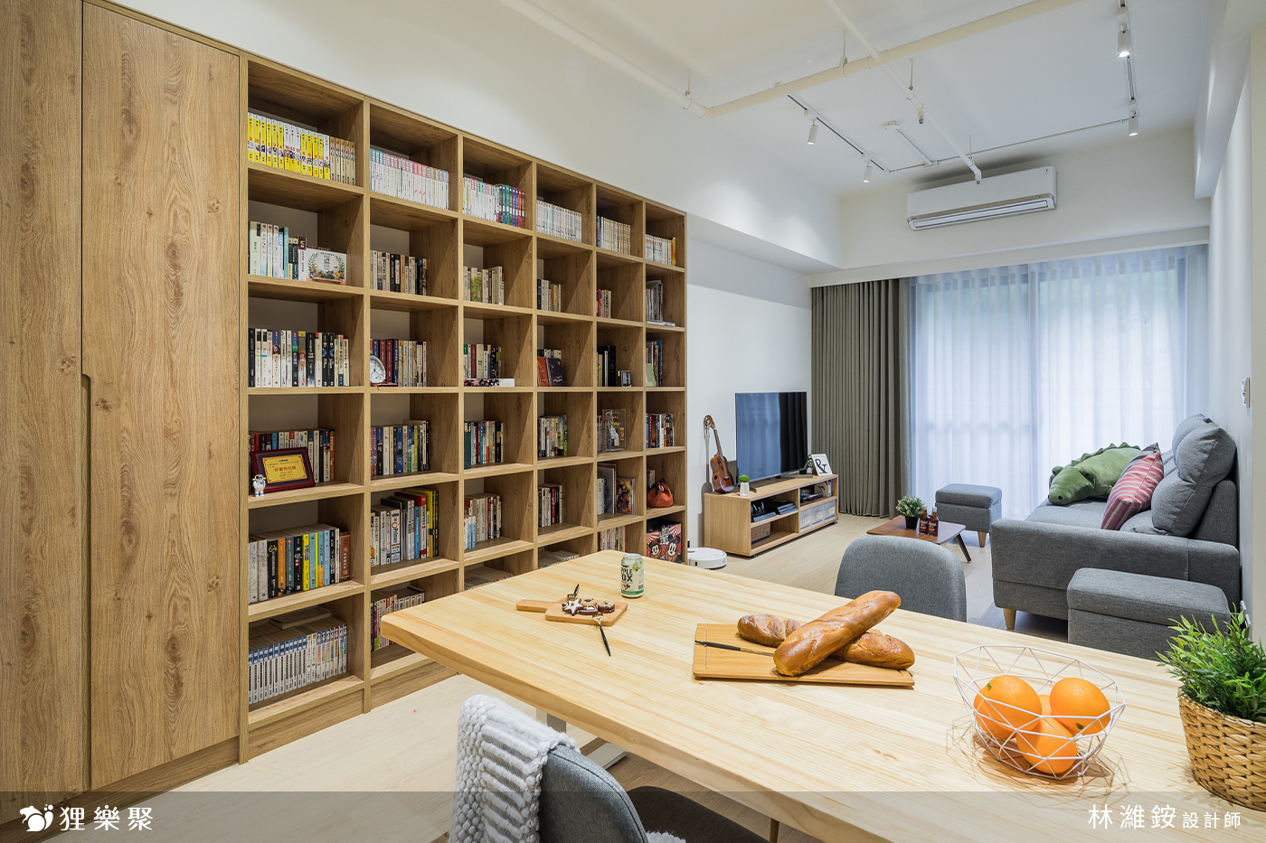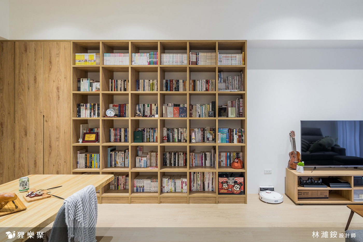 源自日文的「無垢材」即是實木的意思,當我們去無印良品的時候能夠注意到展示櫃皆是溫潤的實木做成,是無印風最明顯的特色之一。我們在連接客餐廳的整面方格實木書櫃的造型上選擇了最簡單的設計,每一格都是相同的大小且不做門片,線條簡約的櫃體弱化了層層擺放的書籍帶來的些許雜亂感。