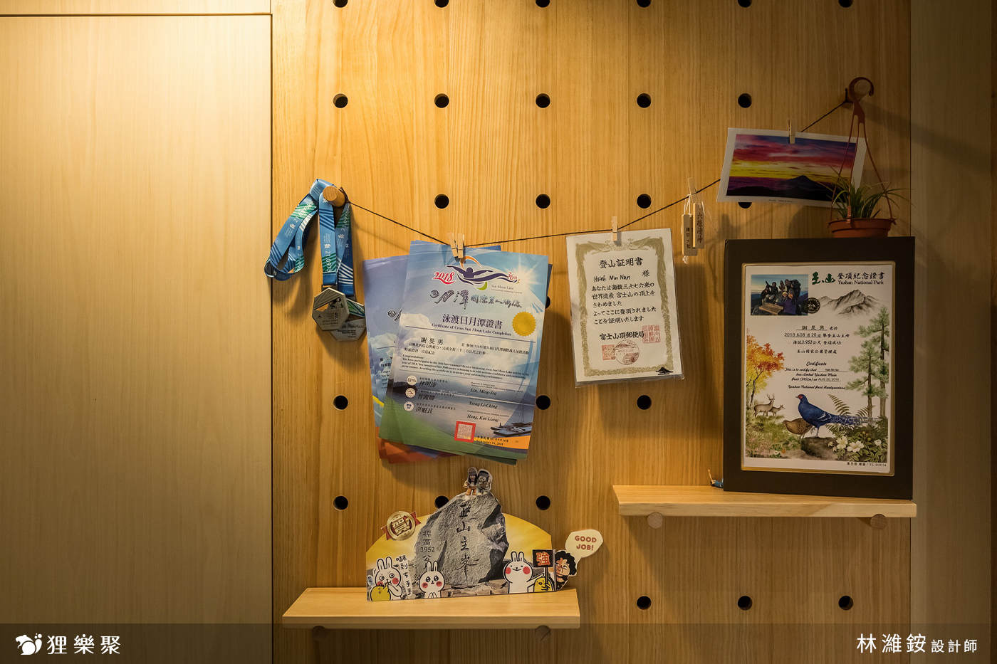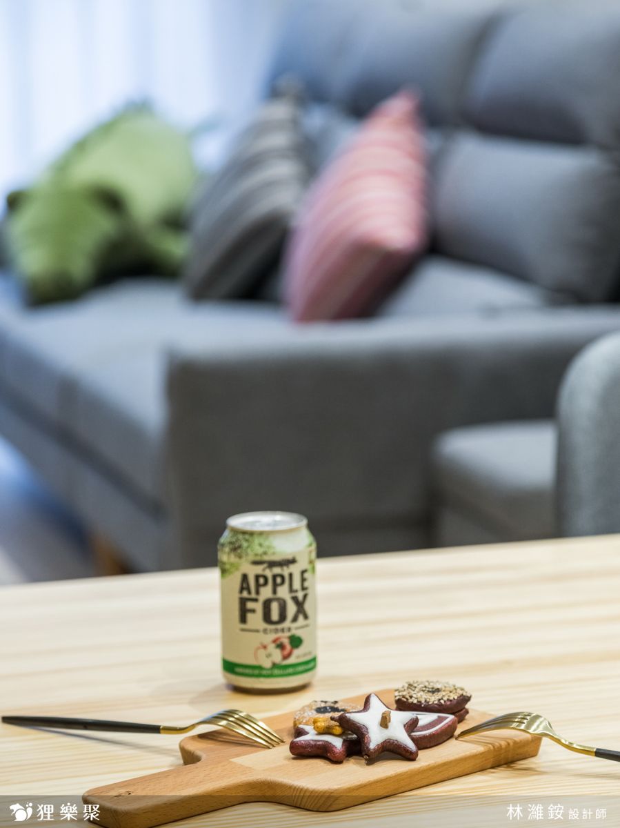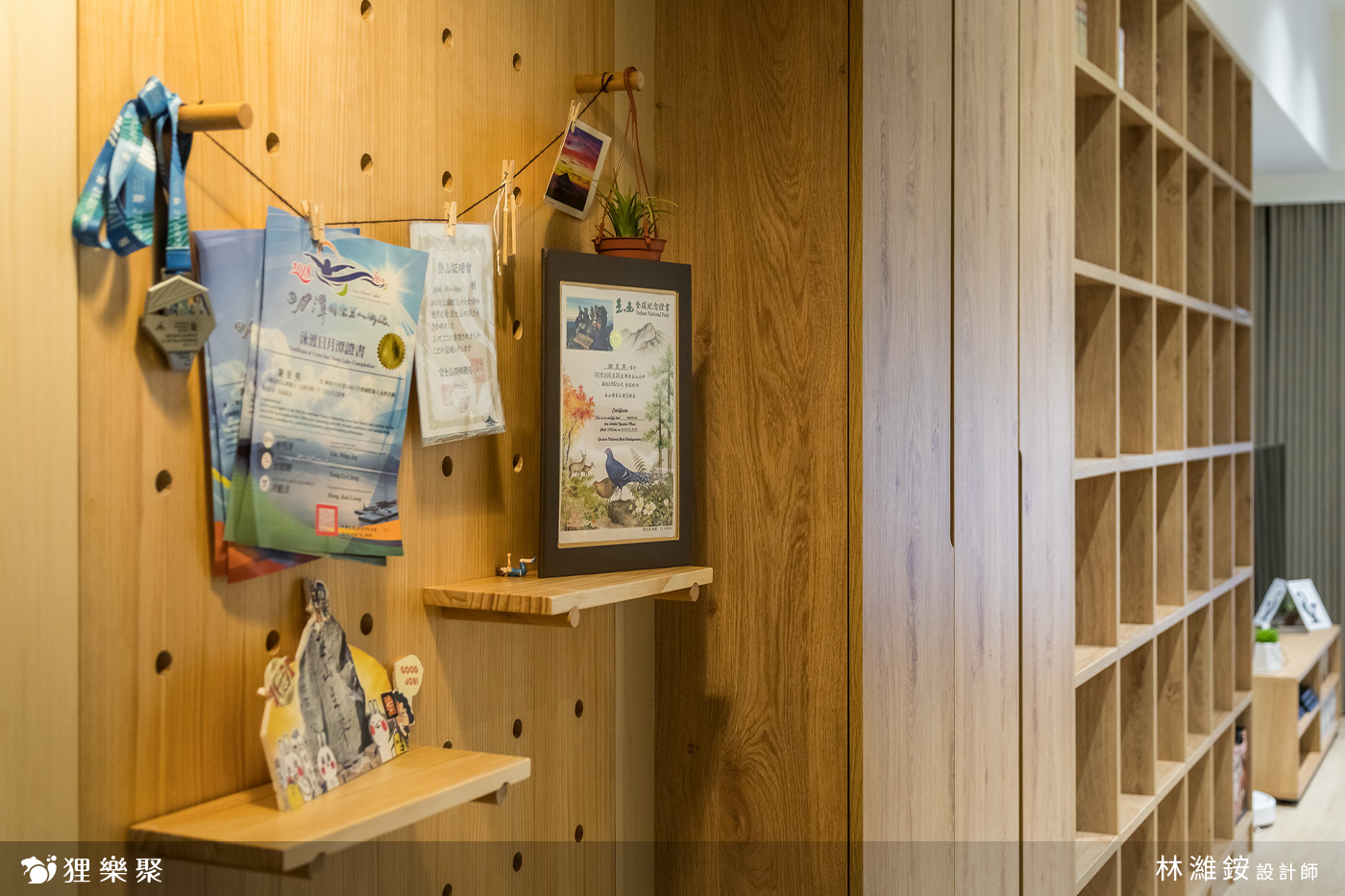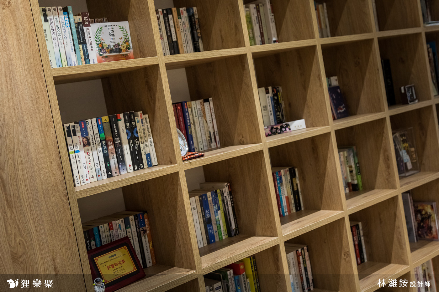 源自日文的「無垢材」即是實木的意思,當我們去無印良品的時候能夠注意到展示櫃皆是溫潤的實木做成,是無印風最明顯的特色之一。我們在連接客餐廳的整面方格實木書櫃的造型上選擇了最簡單的設計,每一格都是相同的大小且不做門片,線條簡約的櫃體弱化了層層擺放的書籍帶來的些許雜亂感。