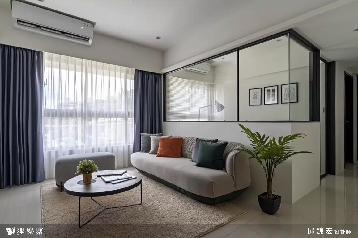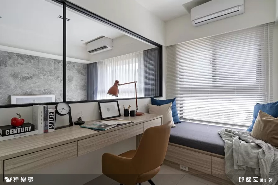 位於客廳後方的書房設計半牆上加玻璃的形式,不僅能為獨立空間做出區隔,同時透明玻璃也能引入更多的自然光,讓屋子更有生命力,對於居住者的身心健康都相當重要。在書房內規劃了書桌以及臥榻,可以根據需求隨時隨意地變換坐姿,是一個非常舒適的空間,臥榻下的抽屜也能收納許多雜物,以維持簡潔的書房設計。