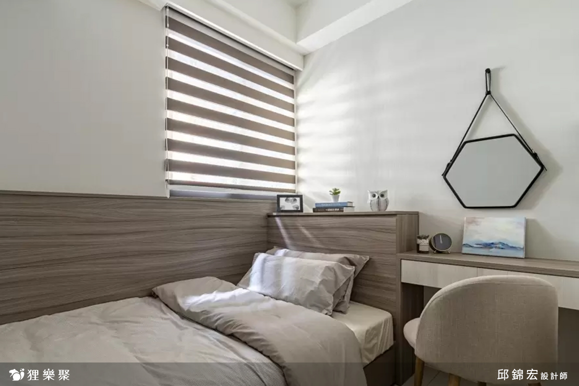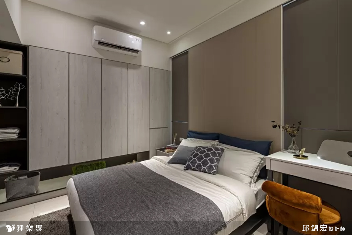 現代簡約風通常以黑白灰作為主要色調,容易顯得空間較為冰冷,適當地添加常自然元素能夠為空間增添暖意,打造更居家的現代簡約設計。在客餐廳的部分大量使用原木色,搭配部分黑色的櫃體,空間的個性立刻跳脫出來;而臥室則以顏色較淡的木紋色做深淺搭配,避免使用濃墨重彩造成小空間的壓迫感。