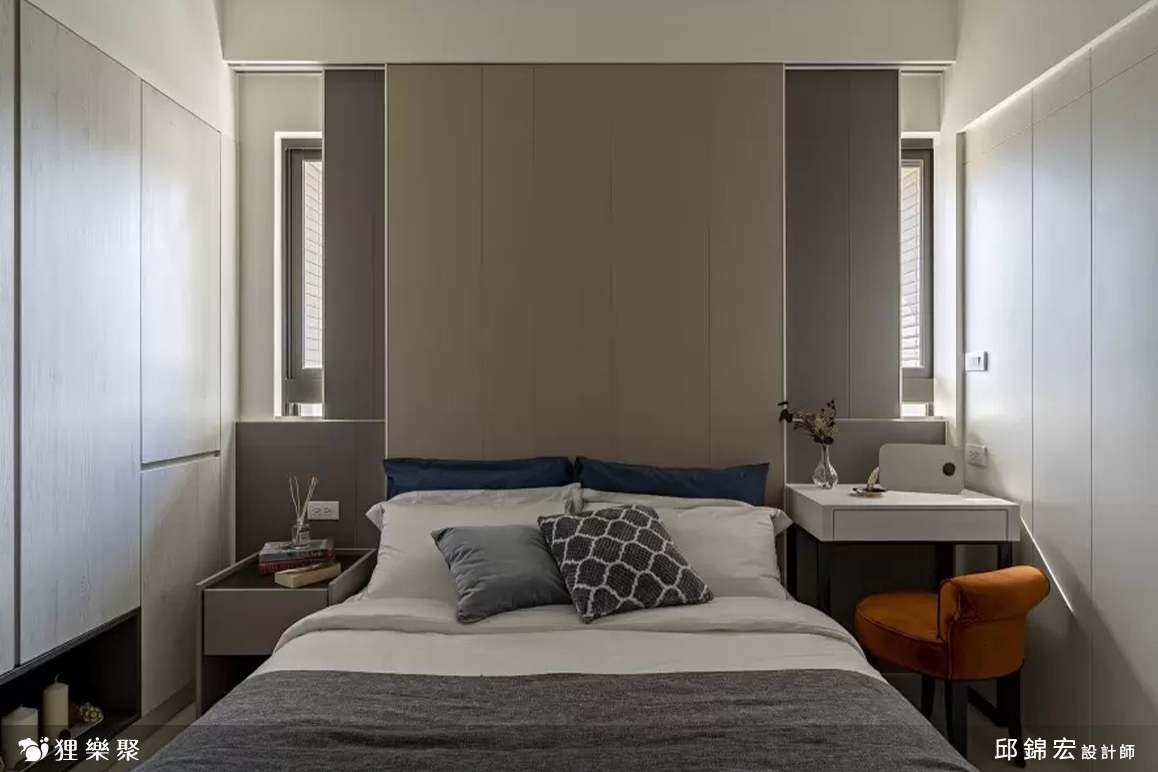由於主臥室的空間限制,當床不得不對窗的時候,該如何化解呢?設計師直接在臥室牆面設計一道假牆作為床頭,床頭兩側則是滑門門片,具有窗簾的部分作用,在闔上時彷彿是一面完整的牆,能夠讓屋主好好休息,而將門片打開後仍然有陽光透入,設計師利用雙層窗戶的設計巧妙地解決了問題。