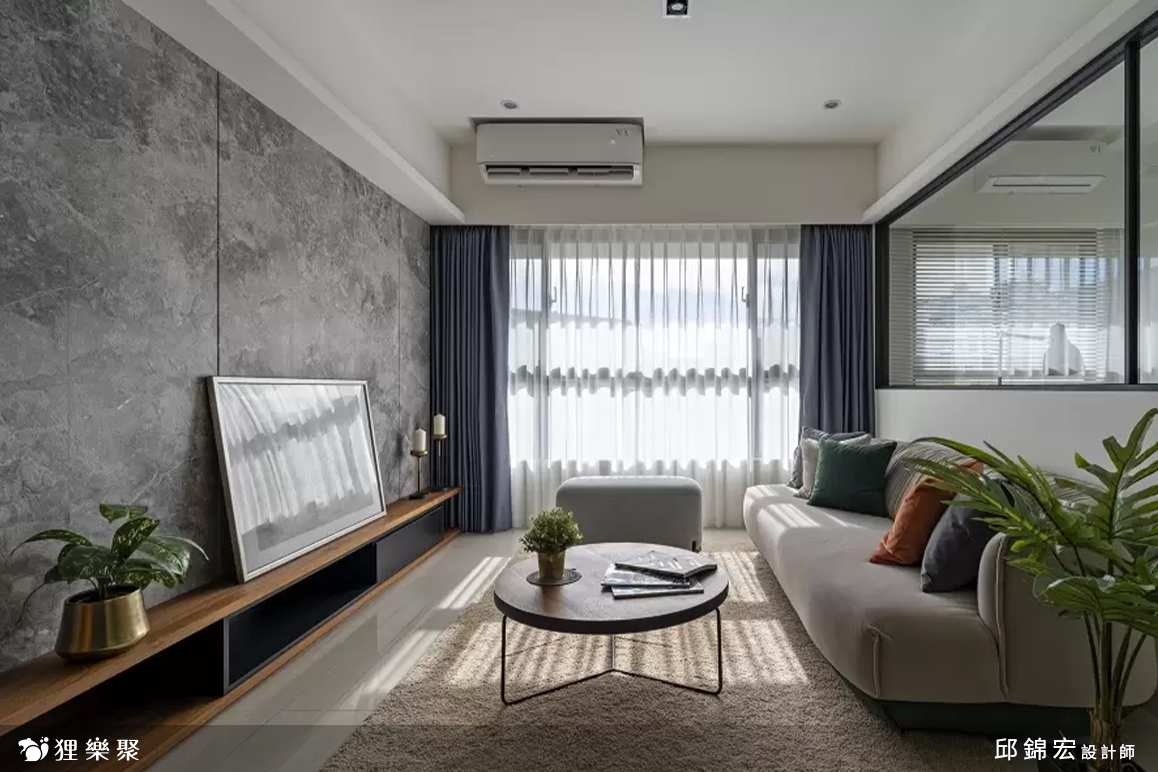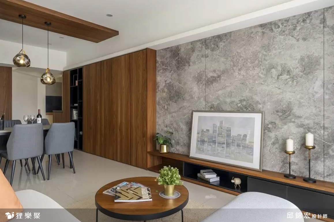 在客廳主牆面使用仿大理石的板材拼接而成,暗灰色的冰涼質感彷彿讓整個屋子立刻沉靜了下來,回到家除了恢復體力,也能好好地梳理、沉澱心情。