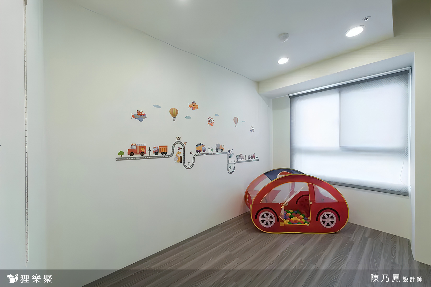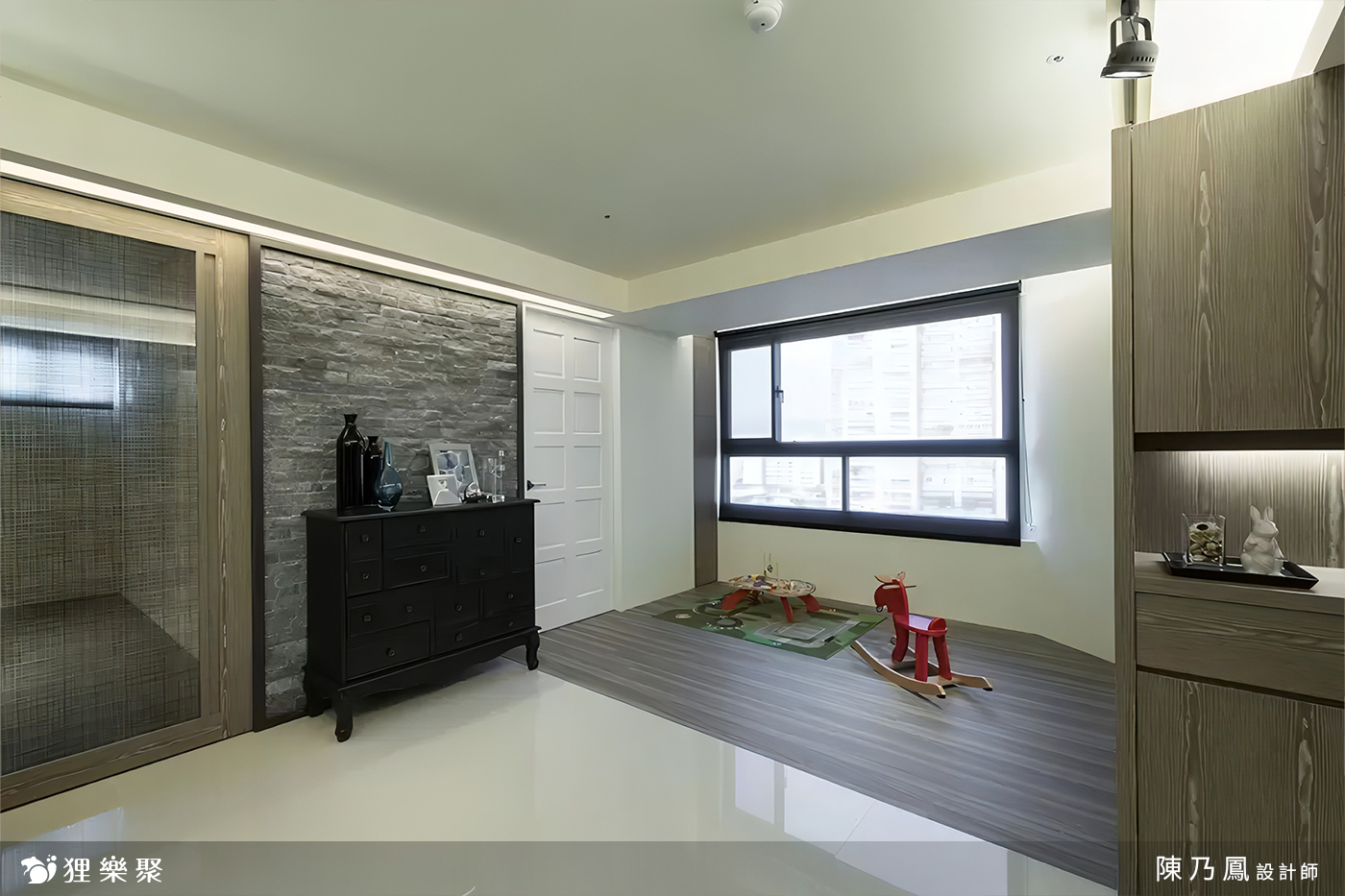 舊屋翻新後公共空間地板以鋪設磁磚為主,而在窗邊自然光最充足的地方則鋪上木地板,木地板在秋冬也不會太過冰冷,擺上玩具就能讓小孩消耗不少時間和精力;由於孩子年紀還小,同樣鋪設木地板的小孩房目前作為遊戲間使用,若是有客人要過夜時放上床墊就能解決,是用途相當多元的親子宅設計。