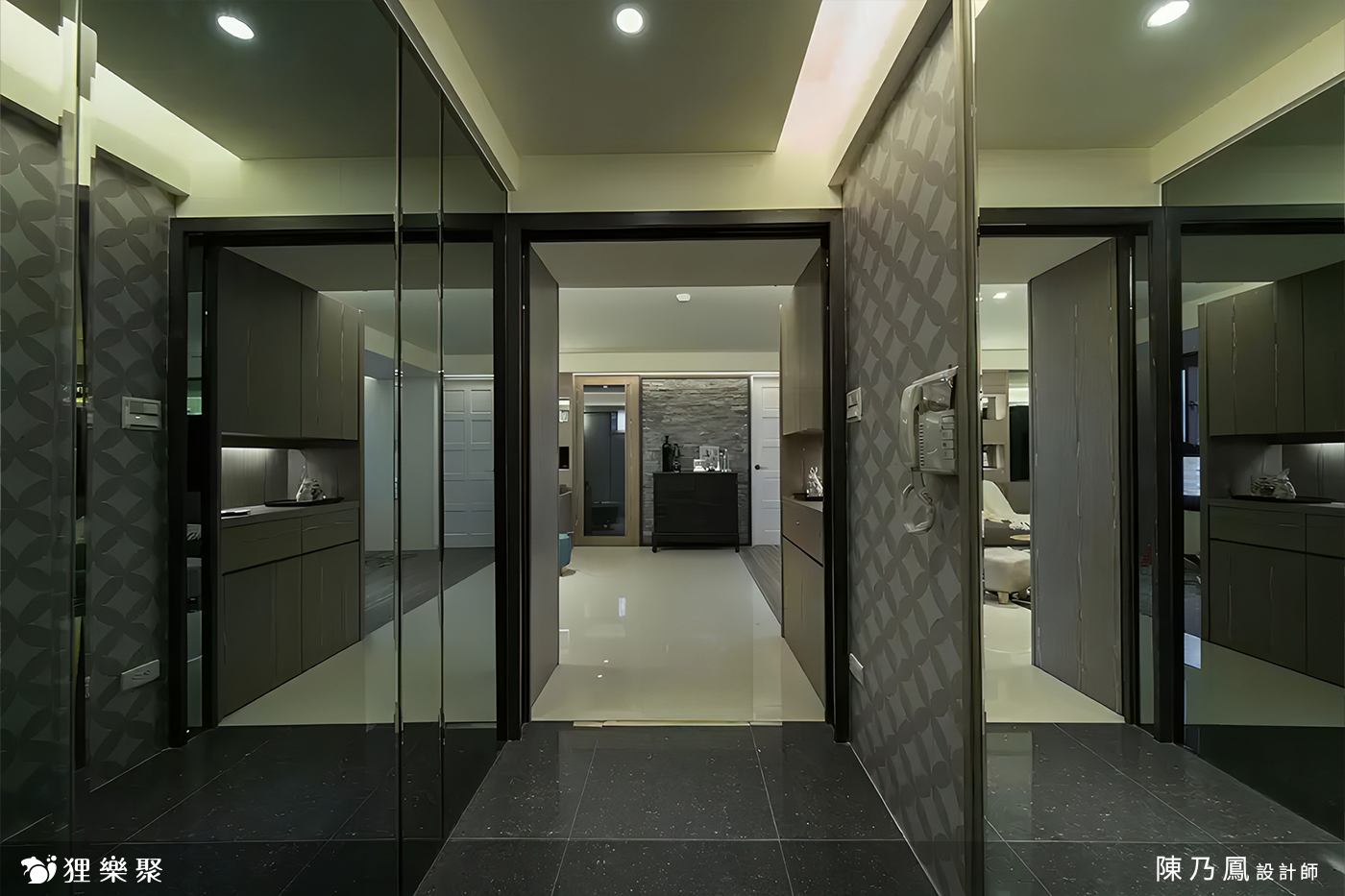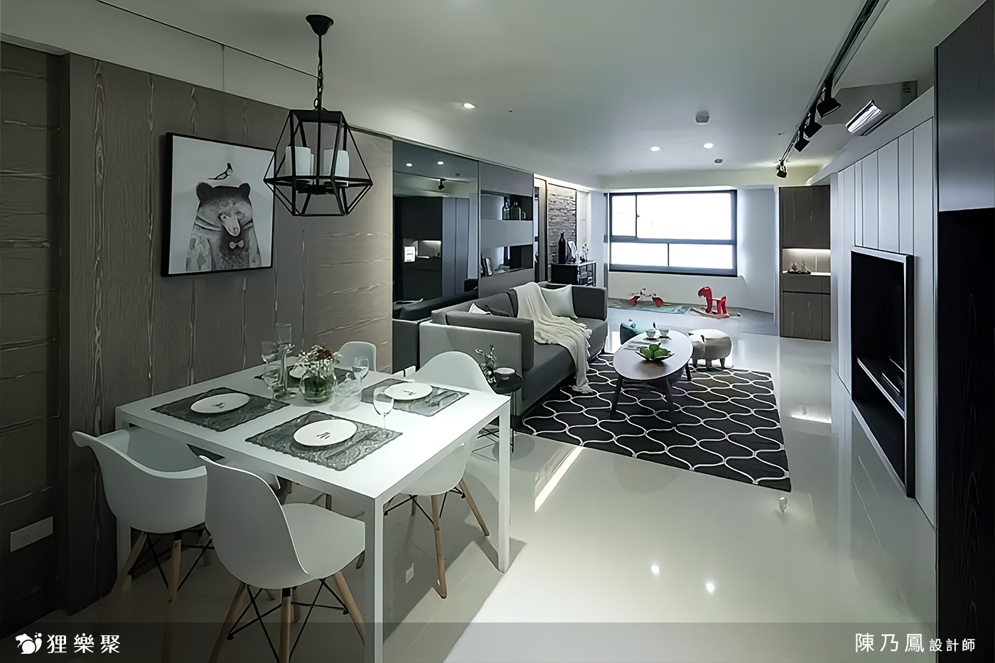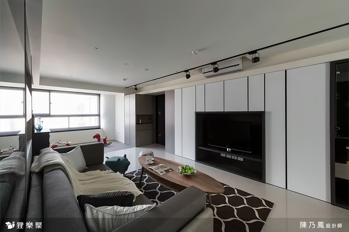 現代風設計多以黑白灰色系為主,與電視牆結合的收納櫃利用黑色櫃體搭配白色門片,創造分明的線條感,燈具則選擇嵌燈搭配軌道燈,利用黑色的軌道與電視櫃做呼應,俐落且筆直的線條讓色調較為單一的設計更加立體。另外,在沙發背牆以及玄關的長廊貼上黑鏡,利用鏡面放大空間的視覺效果,呈現現代風寬敞明亮的感受。