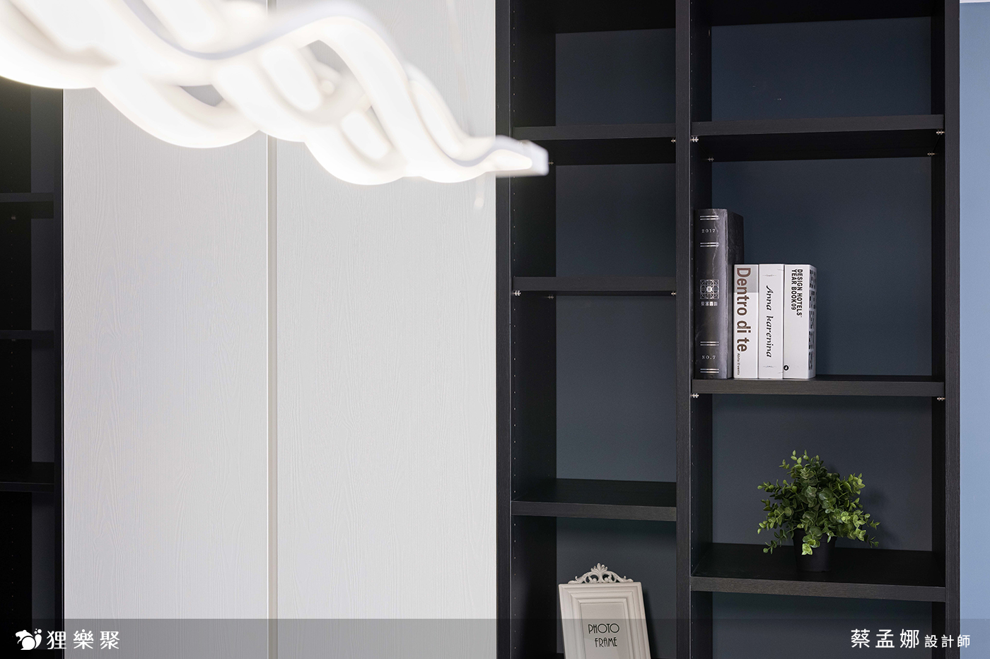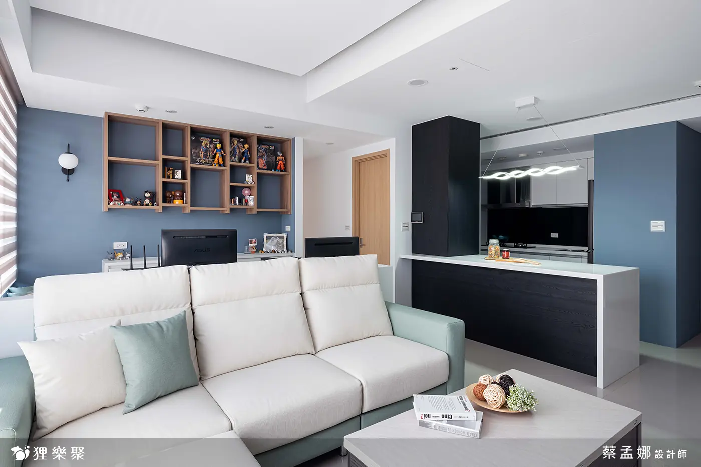 屋主是自由工作者,在家時間很長,並且需要完整的工作空間,配置重點擺放在客廳和書房的共同區域,同時在這個區域有收納及展示需求;風格上則選擇耐看的現代簡約風,不過於凌亂的線條能幫助屋主在工作時思路更清晰。