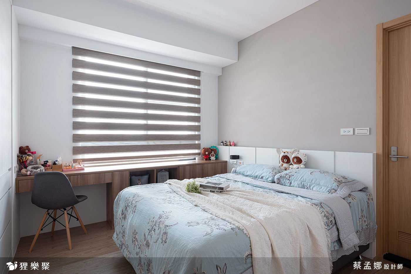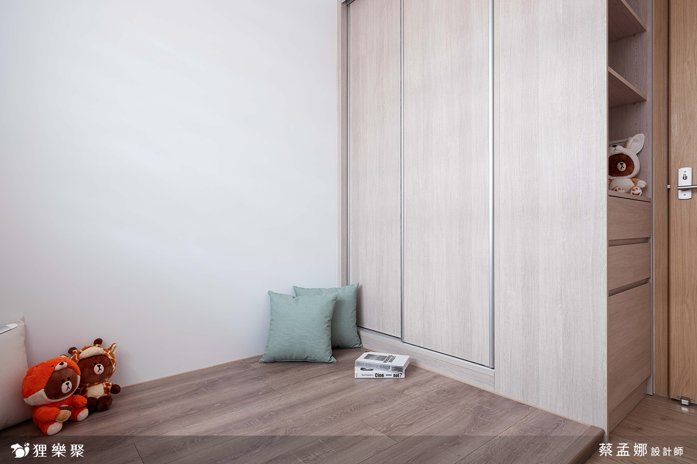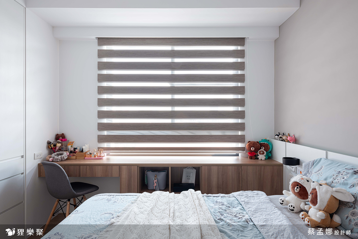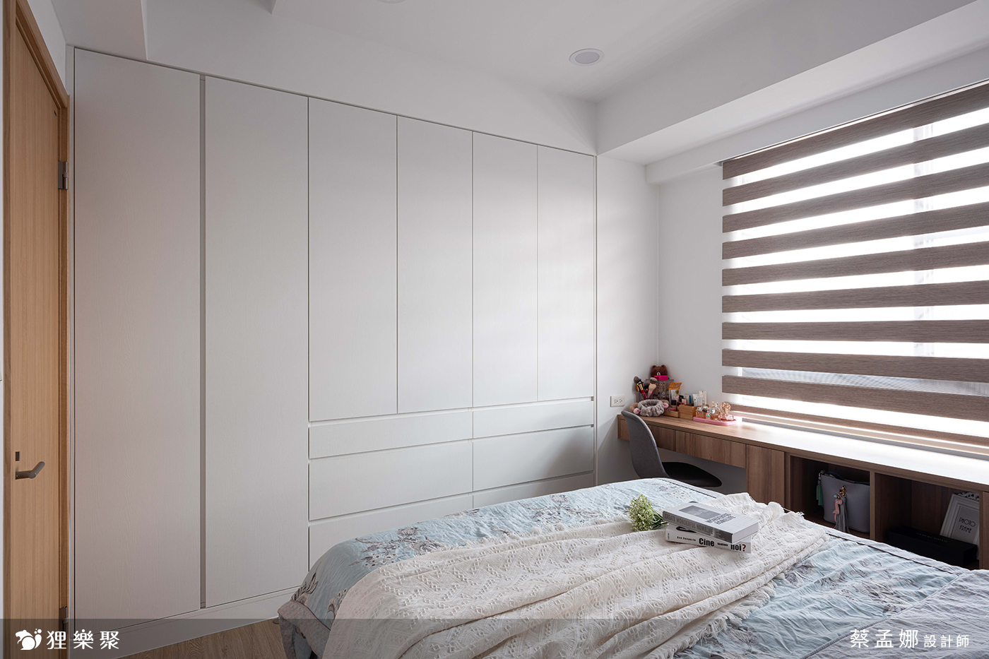 在臥房的部分,設置長型書桌在窗邊,不僅是書桌,同時也是收納櫃以及展示空間,一物多用,將小坪數的空間發揮最多的用途。衣櫃則使用和牆面同色的板材,在與牆面沒有太大區隔的狀況下,就像是一面完整的牆,能夠狹小空間帶來的擁擠感。
