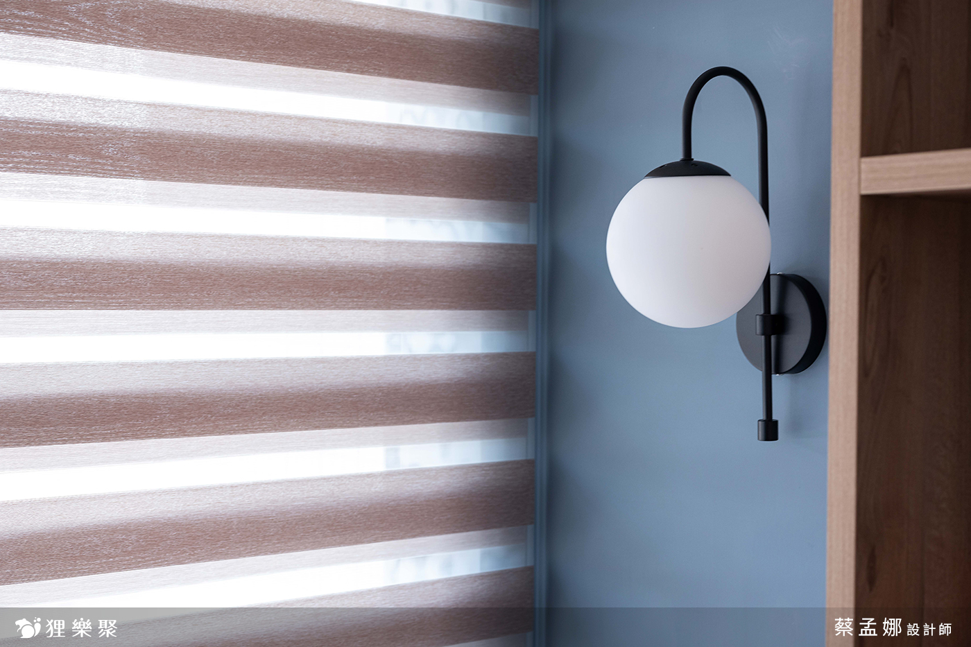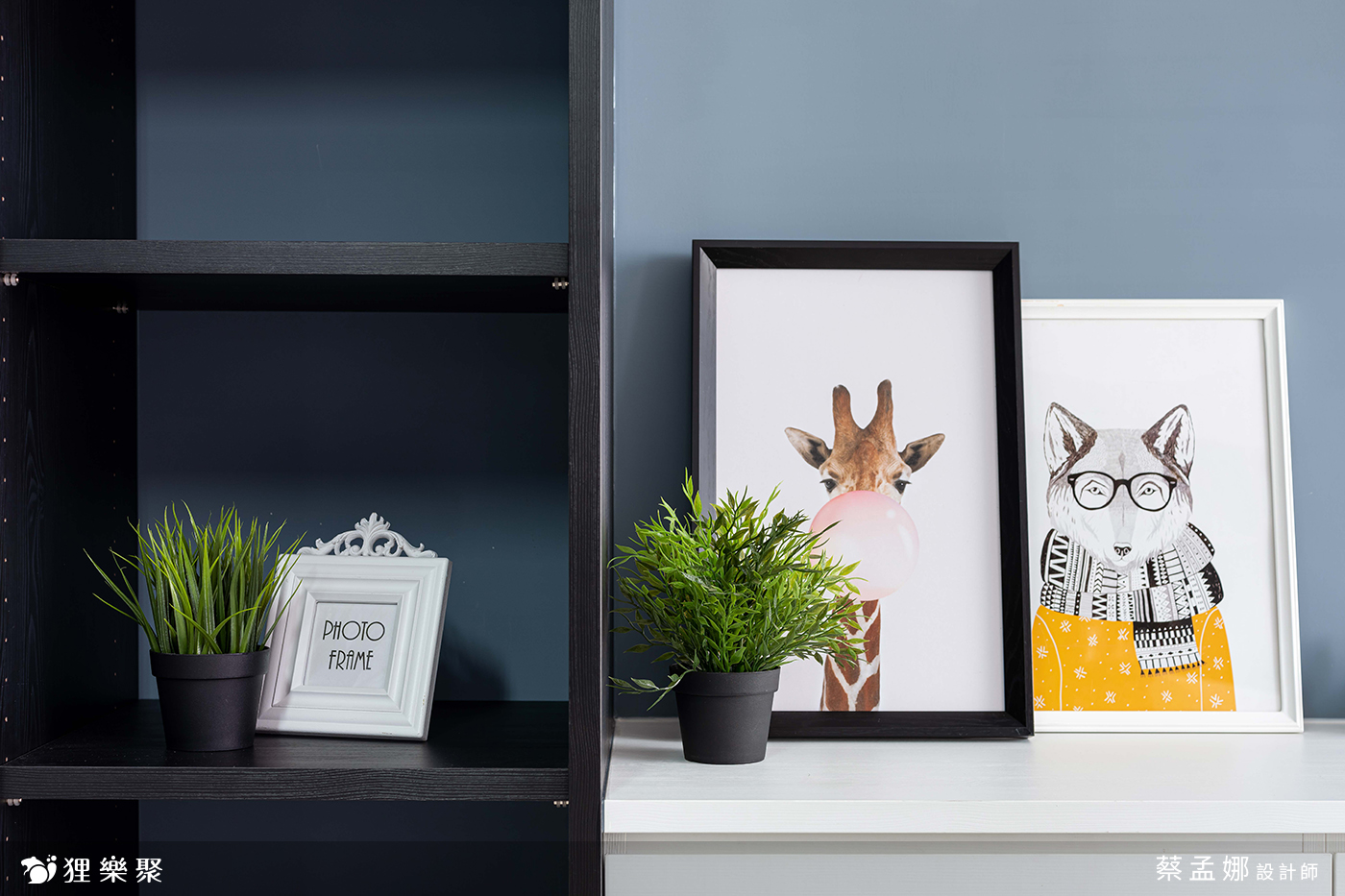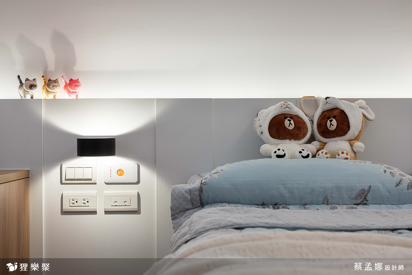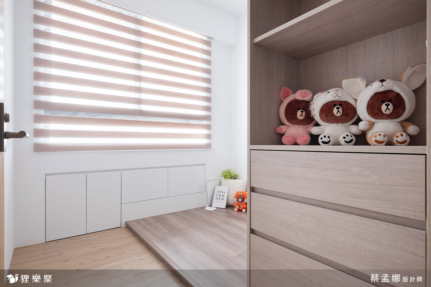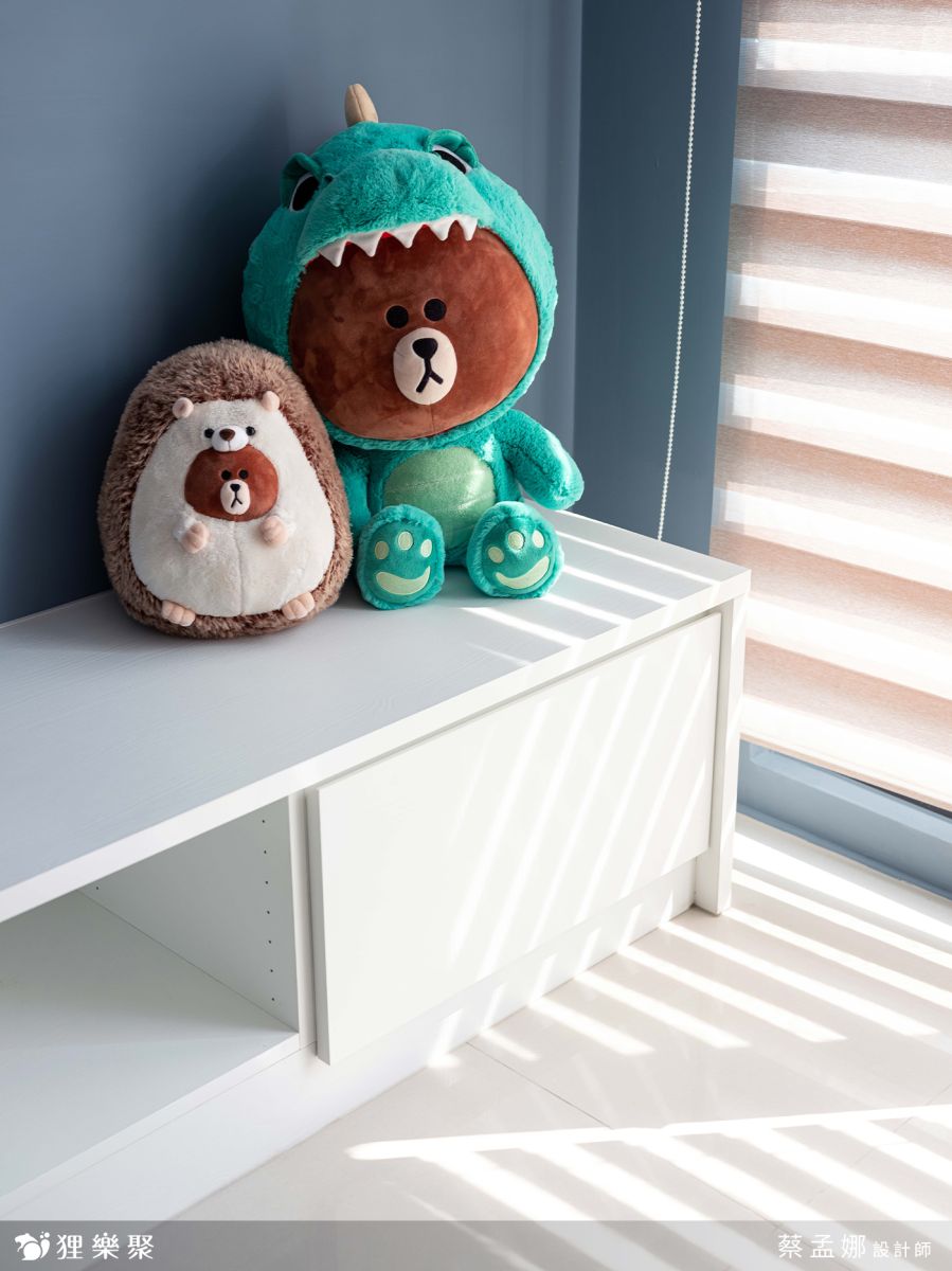 在臥房的部分,設置長型書桌在窗邊,不僅是書桌,同時也是收納櫃以及展示空間,一物多用,將小坪數的空間發揮最多的用途。衣櫃則使用和牆面同色的板材,在與牆面沒有太大區隔的狀況下,就像是一面完整的牆,能夠狹小空間帶來的擁擠感。
