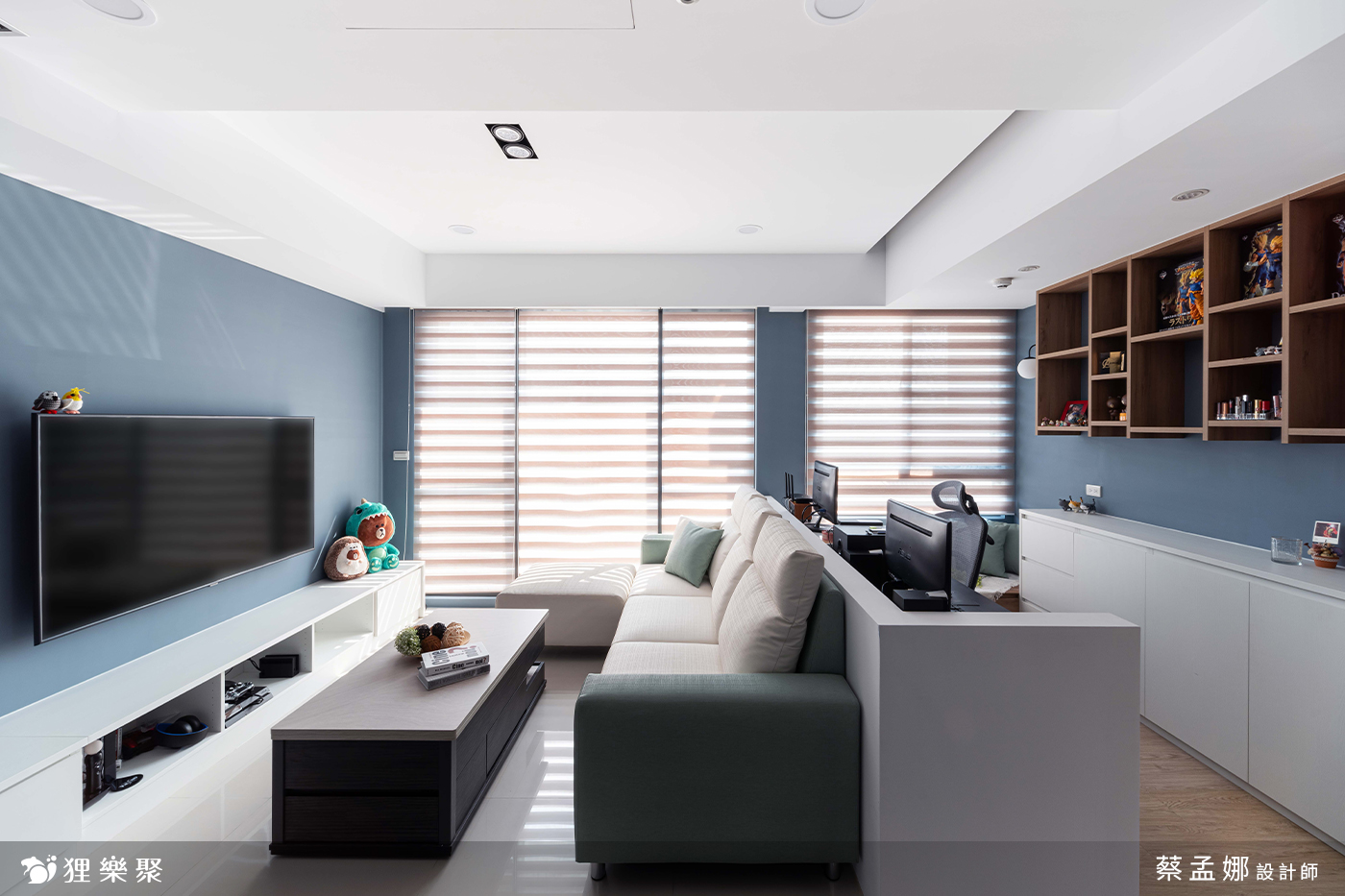 由於將客廳和書房空間打通,整個公共區域的採光效果更上層樓,充分運用自然光線,打造出明亮舒暢的簡約風格,整體線條簡潔,分布在各區的色塊簡約大氣,濁色調則讓屋內更有家的感覺。為了避免空間過於呆版,我們在天花板做出層次造型,是整體偏簡約空間中的小小巧思,無論自然光照射或燈光的投射,在溝槽的部分會營造出不同的光影效果,能夠帶來別樣的風情。