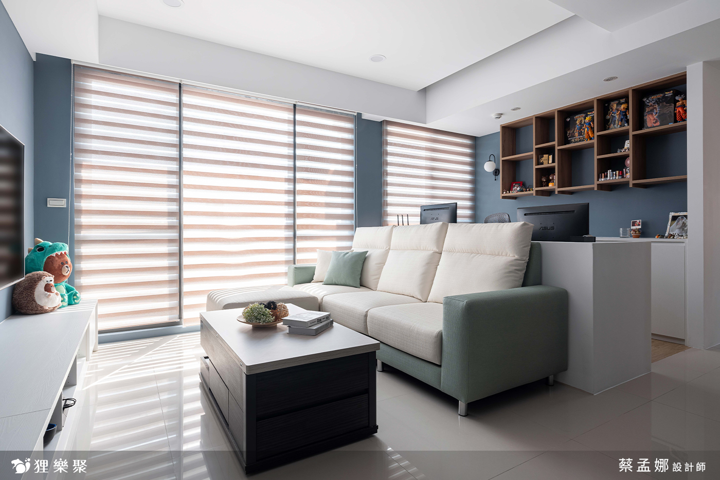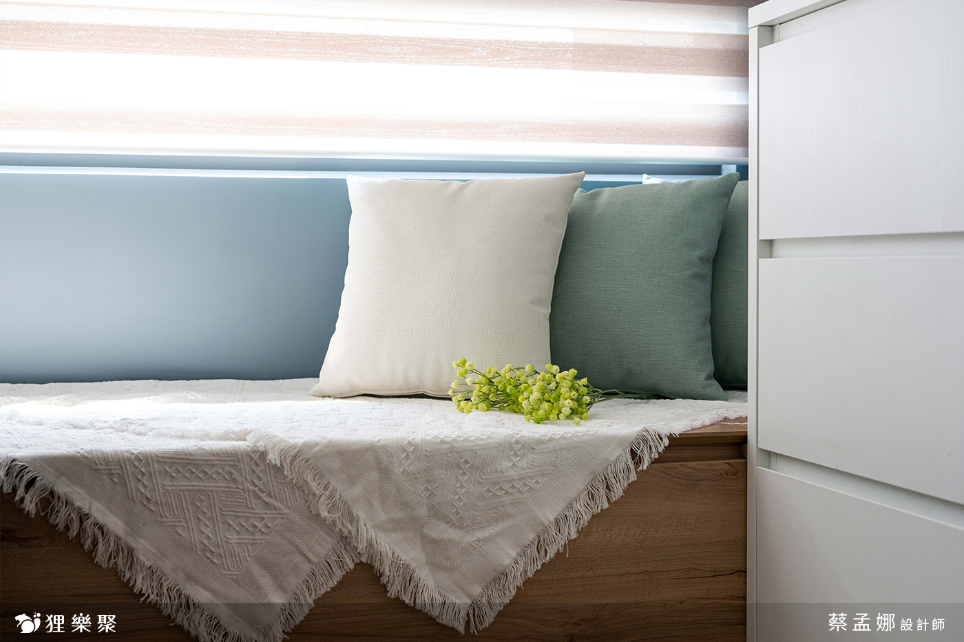 考量房子空間設計,在配置上將空間運用率最大化,前方作為休息放鬆的客廳空間,後半部則作為辦公的場地,中間不以牆面隔開,避免客廳和書房空間都顯得過於狹小,開放式的設計能擴大坪數的視覺效果,後方牆面的木頭吊櫃在開放的空間設計下,也同時作為客廳展示櫃,而書房的窗邊設置了臥榻,能讓屋主在工作的間隙中稍作休息,享受陽光。