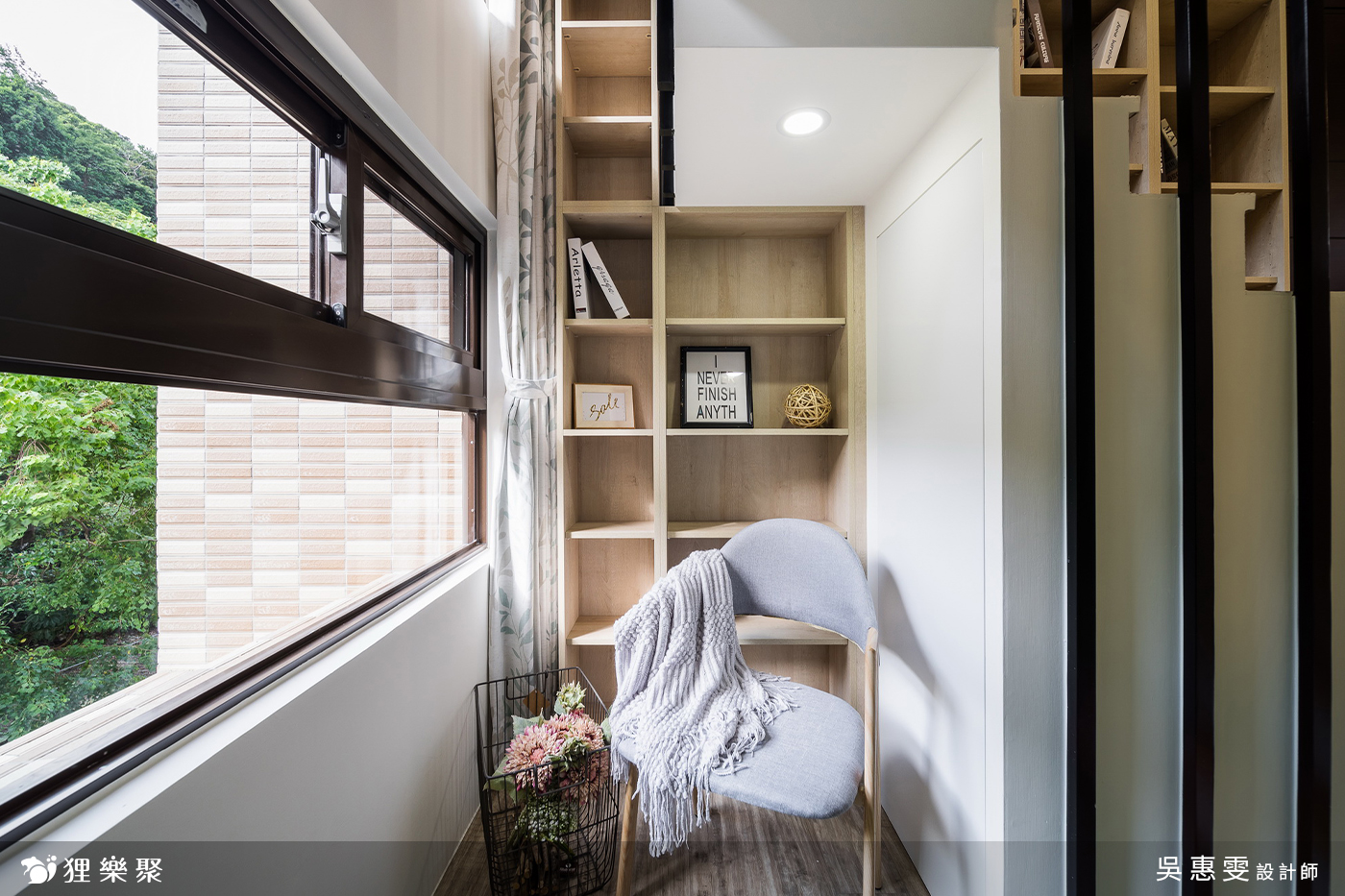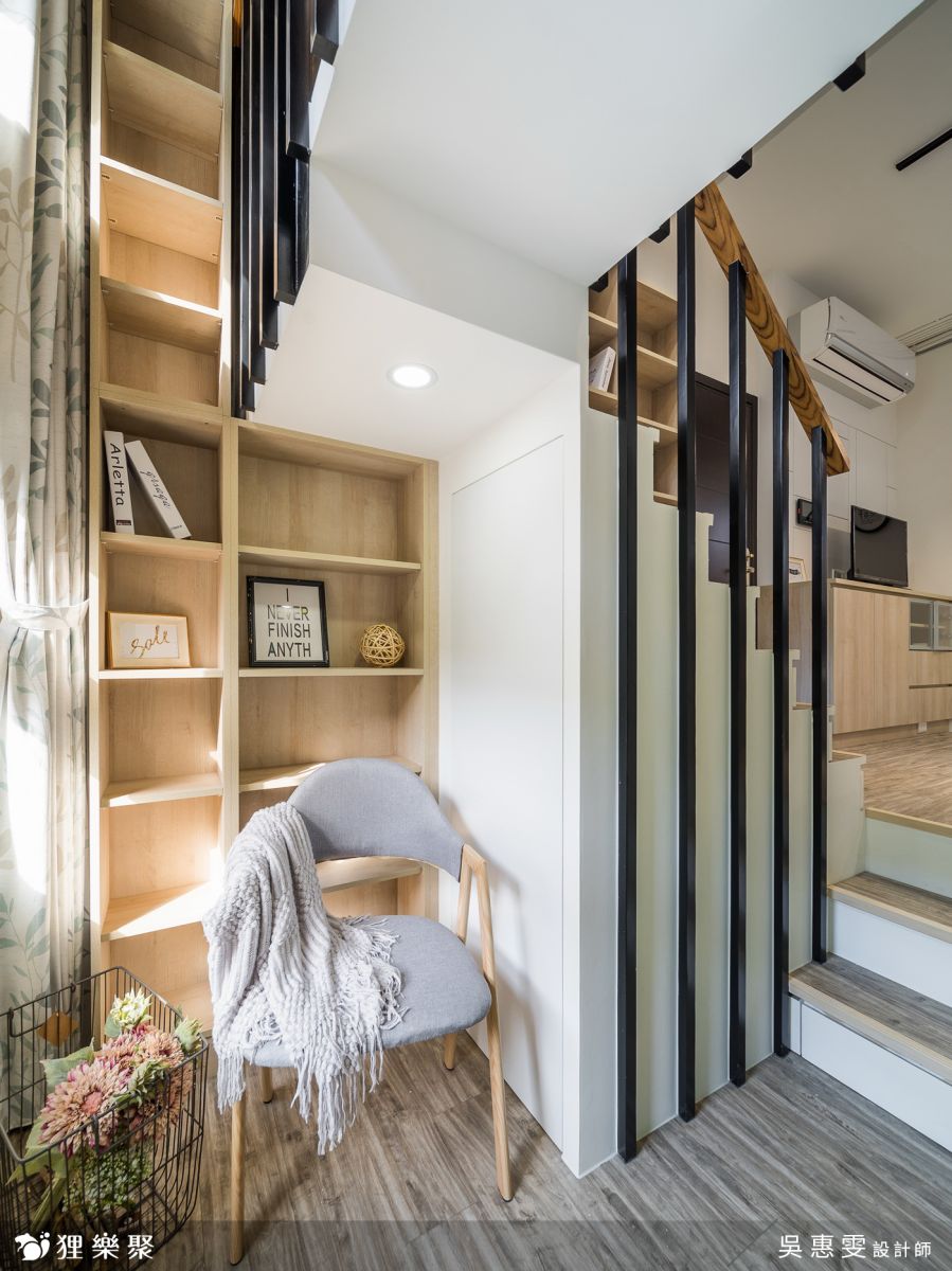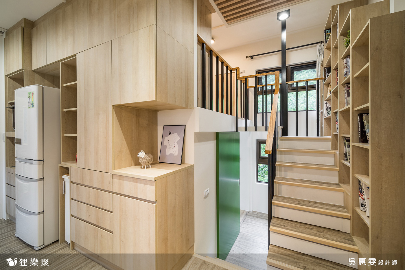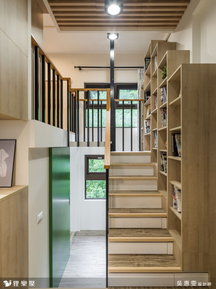 巧妙地融合了木作收納樓梯與系統書櫃,讓原來單調的樓梯除了增加收納的功能外,還成了屋中賞心悅目的一個角落,串起不同空間。