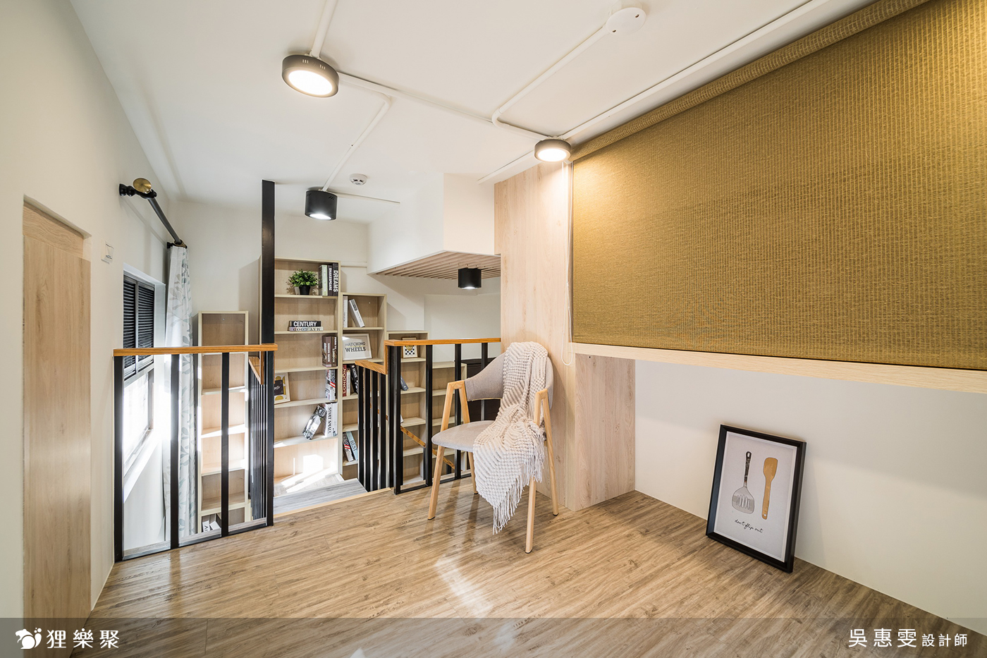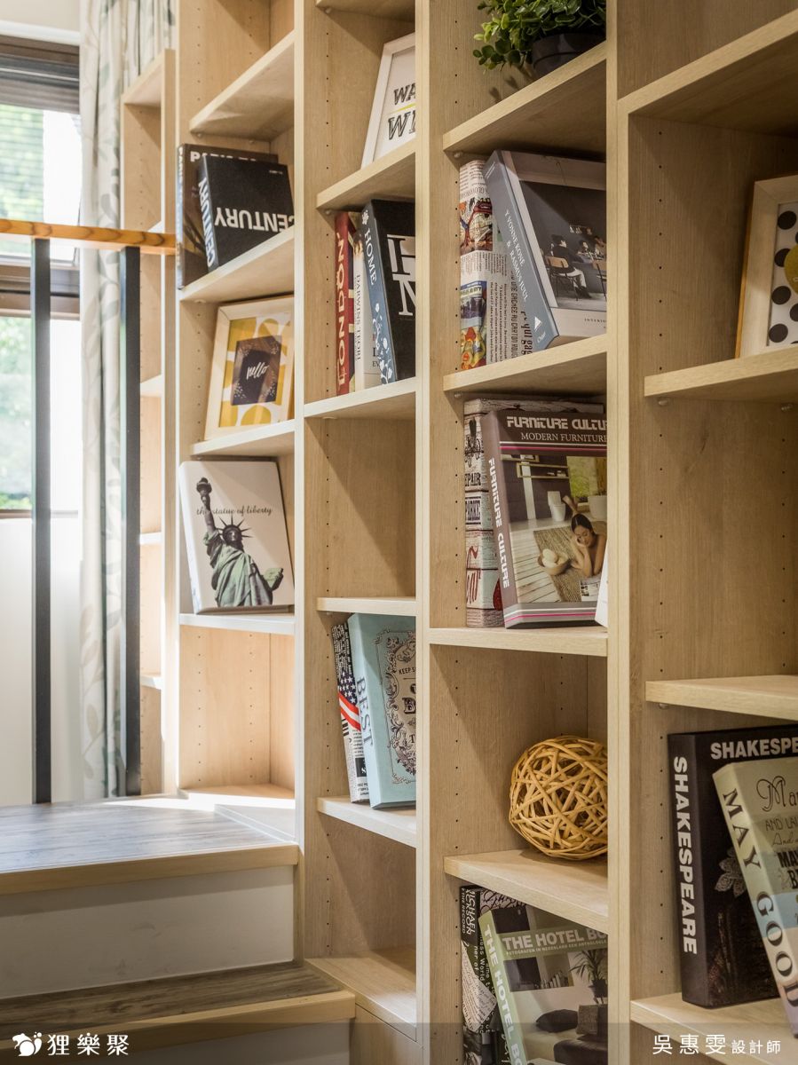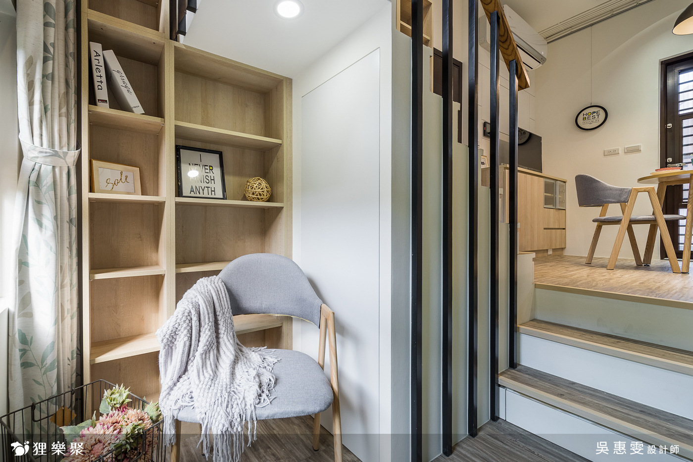 巧妙地融合了木作收納樓梯與系統書櫃,讓原來單調的樓梯除了增加收納的功能外,還成了屋中賞心悅目的一個角落,串起不同空間。