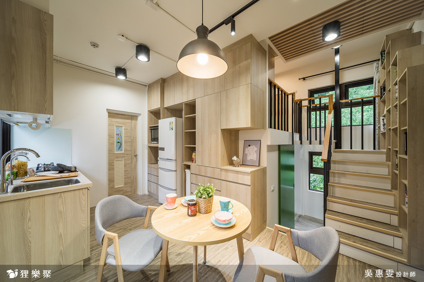 屋主是一位博覽群書的愛貓人,因此在溝通設計時,我們將重點放在結合龐大的書籍收藏與貓咪的生活需求上。由於屋主平日工作相當碌,討論之後我們將客餐廳結合在一起,利用一張圓桌建構出公共空間。為了滿足龐大的收納需求,每一層階梯都內藏玄機,就連樓梯底下的小空間也不放過,除了一間儲藏室外,還有採光明亮的一隅讓屋主享受悠閒的閱讀時光。