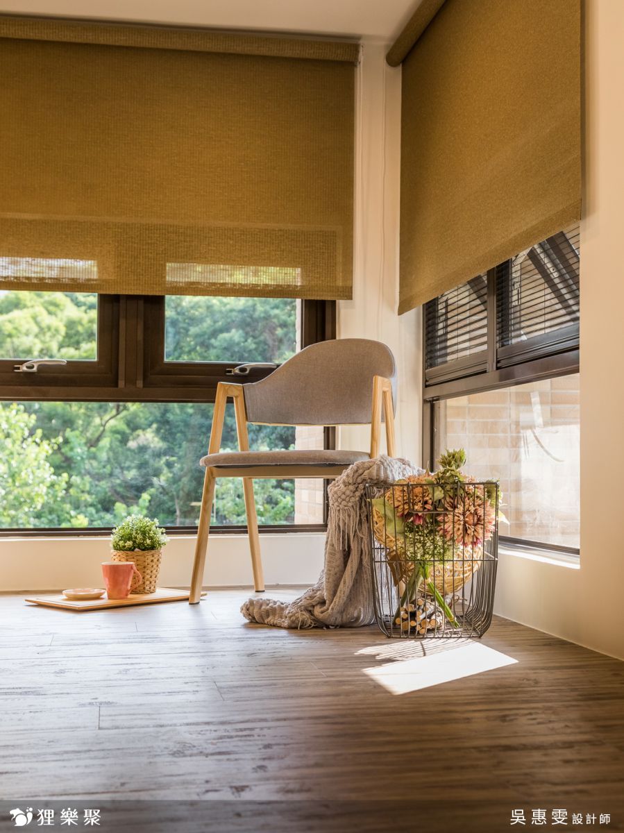 油漆跳色處理樓梯扶手及推拉門片,營造出與溫潤木色中帶點立體陽剛的效果。落地窗簾與藝術窗簾桿,打造屋主的私人小空間。將笨重的吊隱式冷氣機隱藏在的格柵天花中,搭配筒燈及軌道燈營造輕工業的感覺。