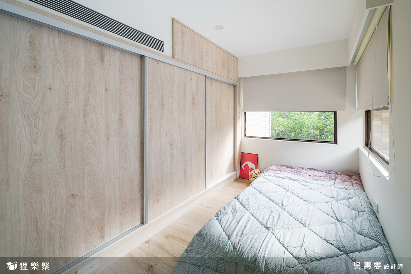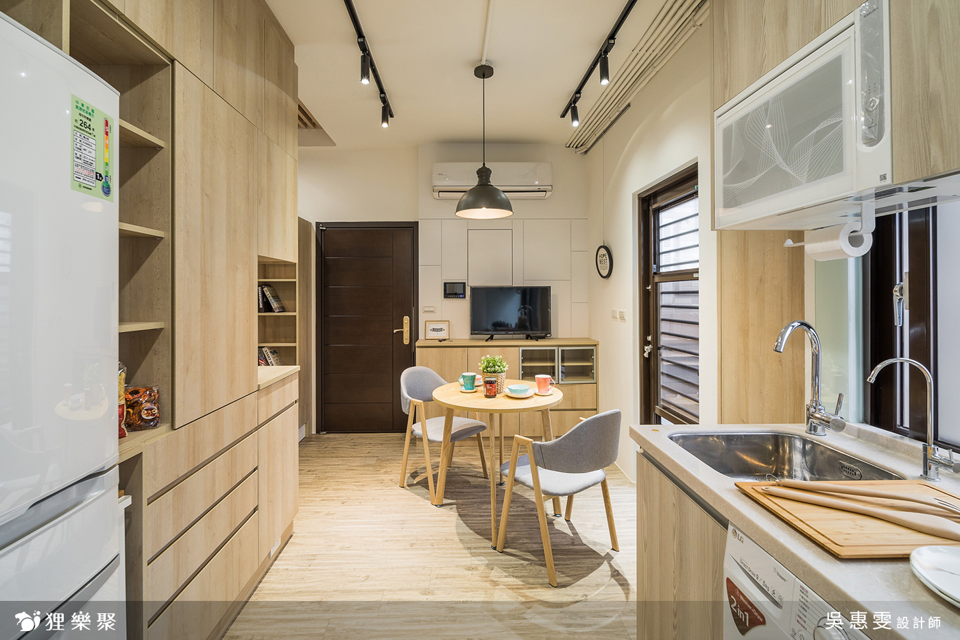 全室選用了溫暖輕盈的橡木色當主角,搭配噴成白色的管線及黑色的造型燈,讓整體空間在溫潤的色澤中多了幾道重點。