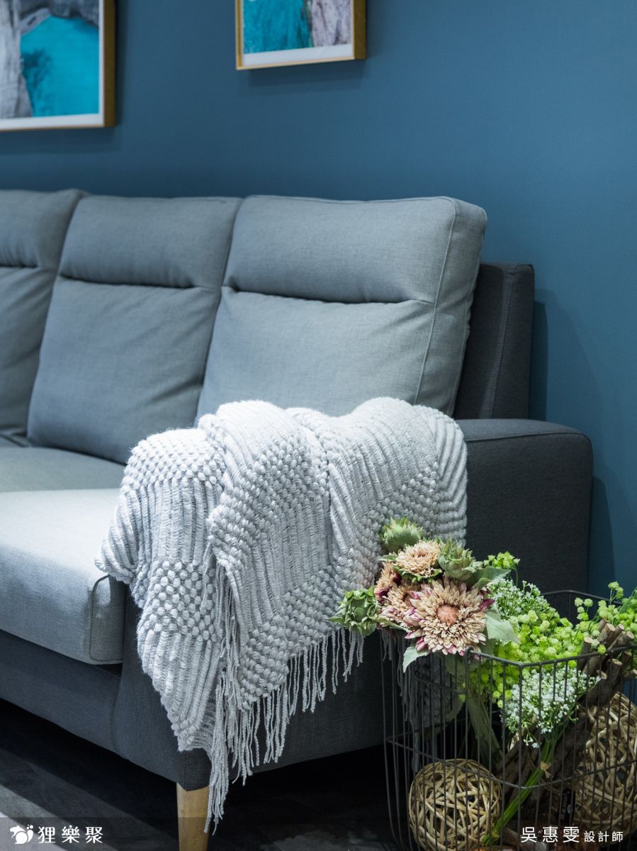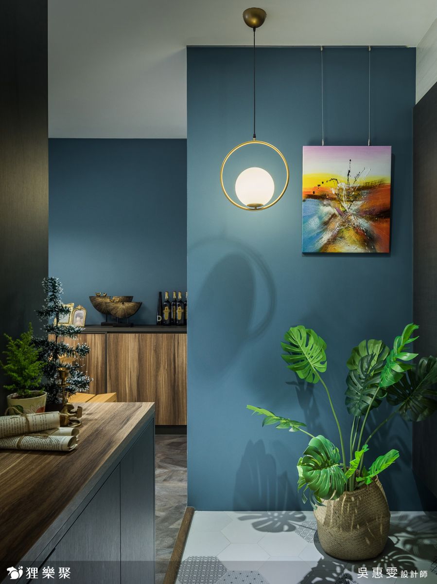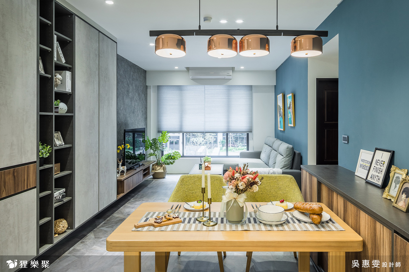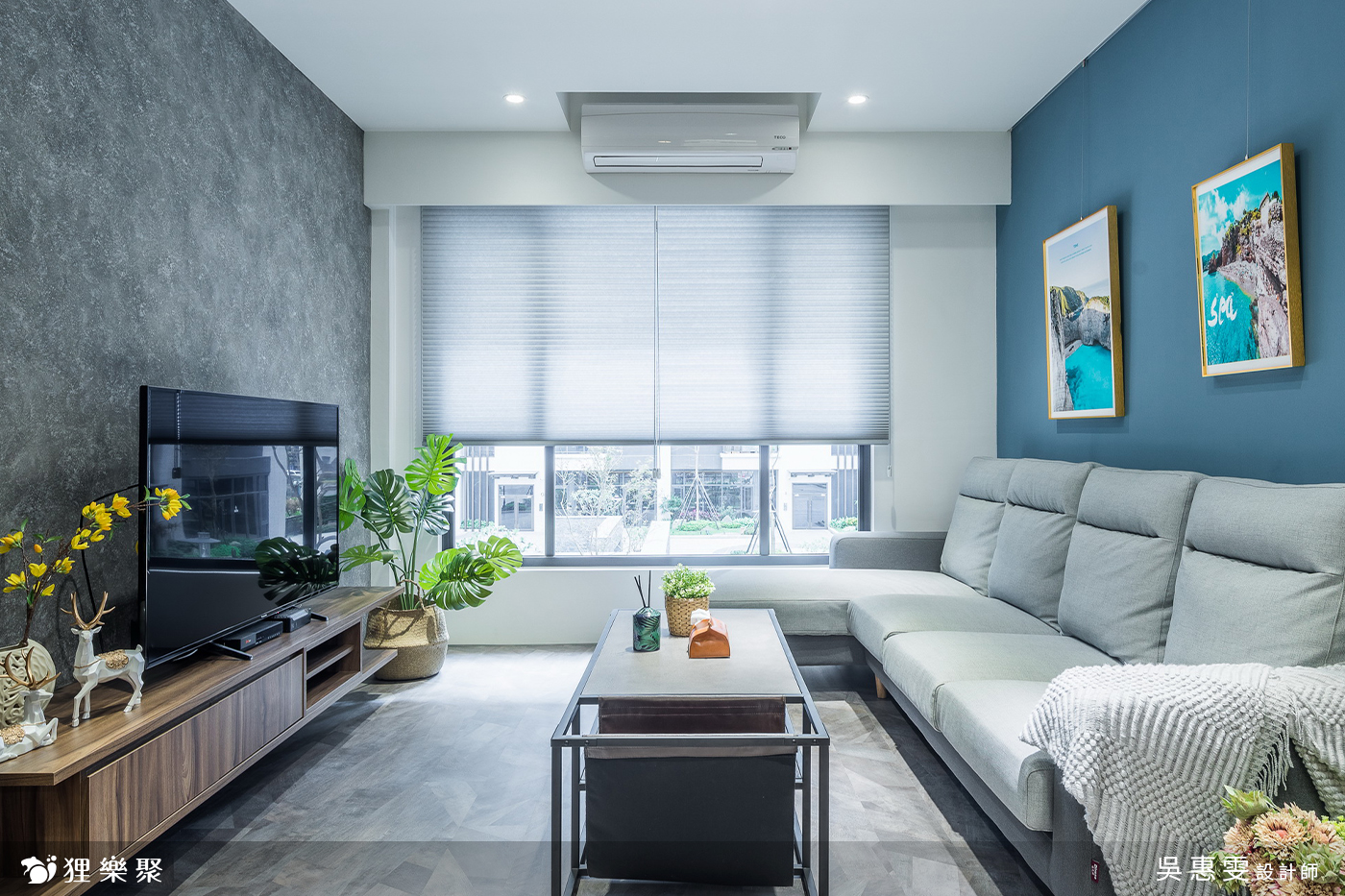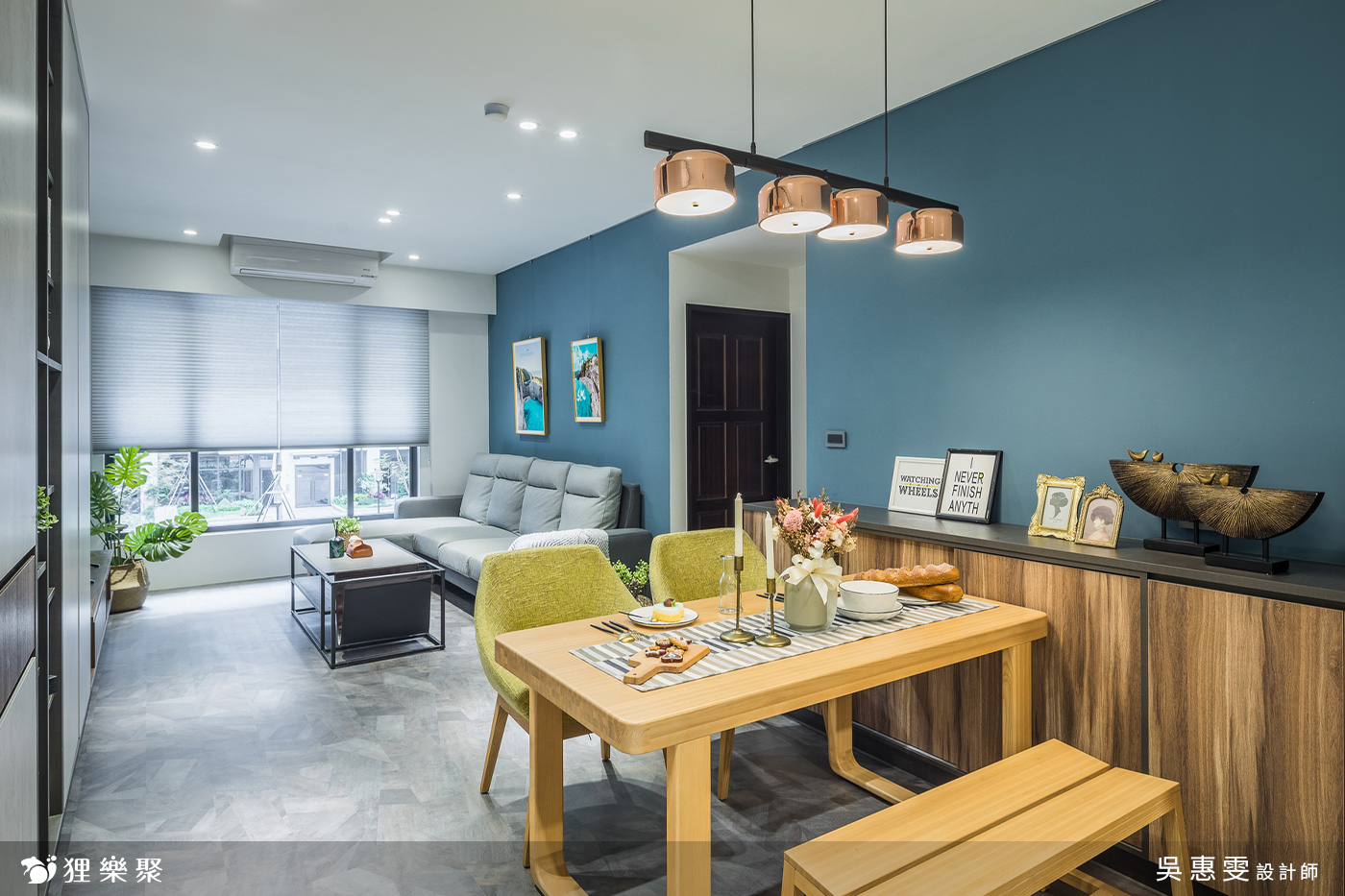 工業風在色彩上少見繽紛配色,空間多半呈現建材原有的顏色,或以黑白灰塑造空間基調,仿造倉庫和工廠的冷調氛圍,但我們將公共空間的牆漆成濁色調的藍,讓整體視覺更有家的溫暖與安全感,臥房是休憩空間,整體則以較淡的色調搭配,能讓休息品質更好。