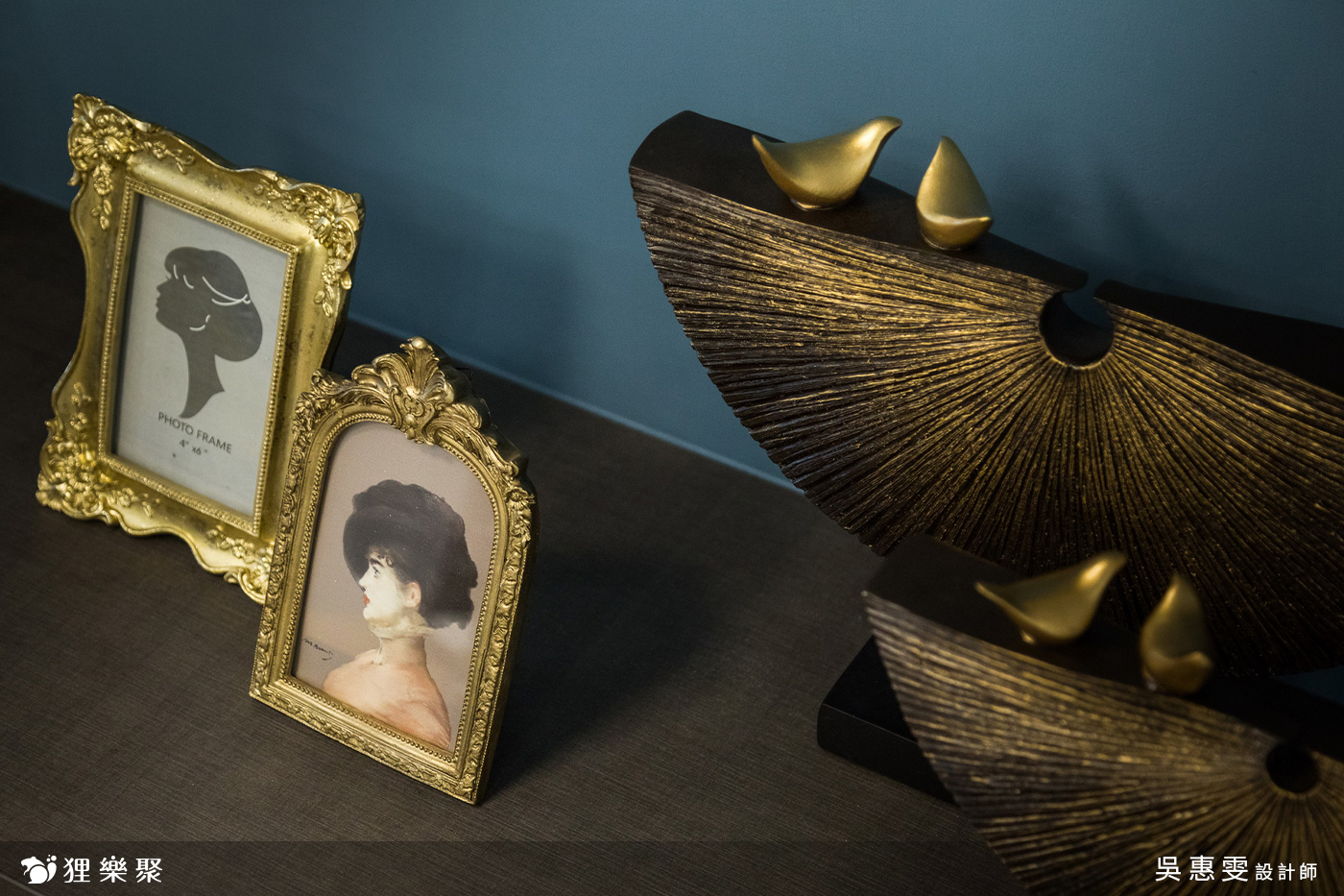 金屬元素是工業風的頭號重點,如各式鐵件、銅色金屬等,此案例中展現在客廳茶几的桌腳、造型燈具、推拉門框、以及臥房的畫框和牆壁腰帶上,特別選用亮眼的銅色金屬材質,在屋子的各個角落相互呼應,濃濃的雅痞工業風就散發出來了。