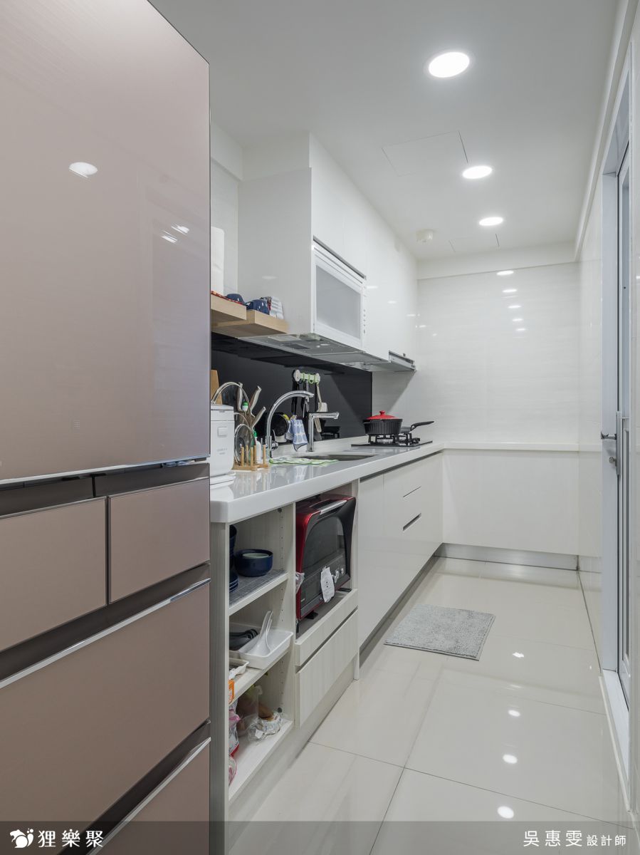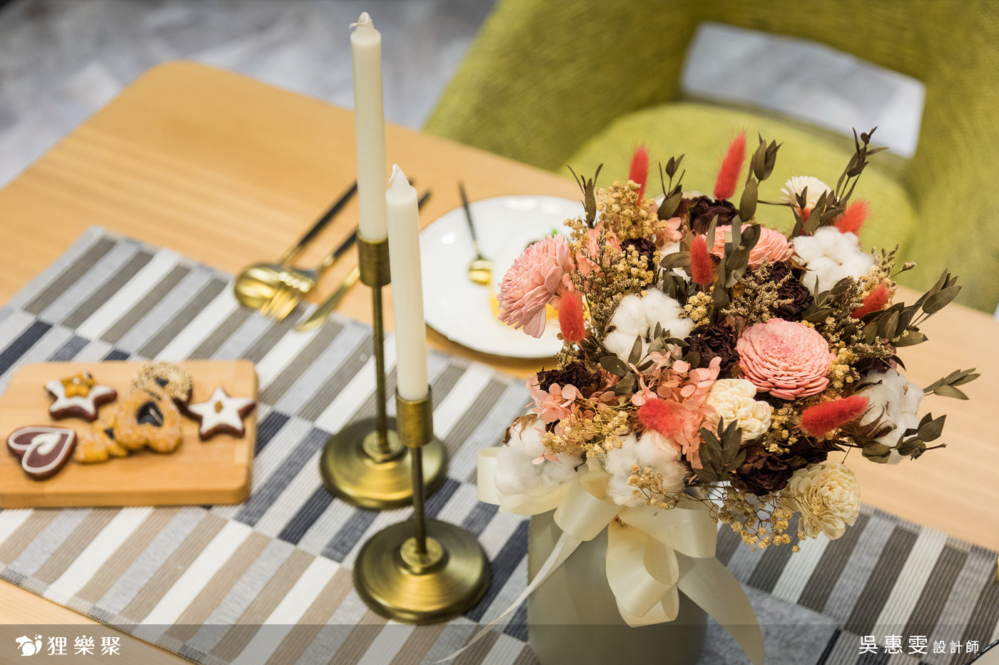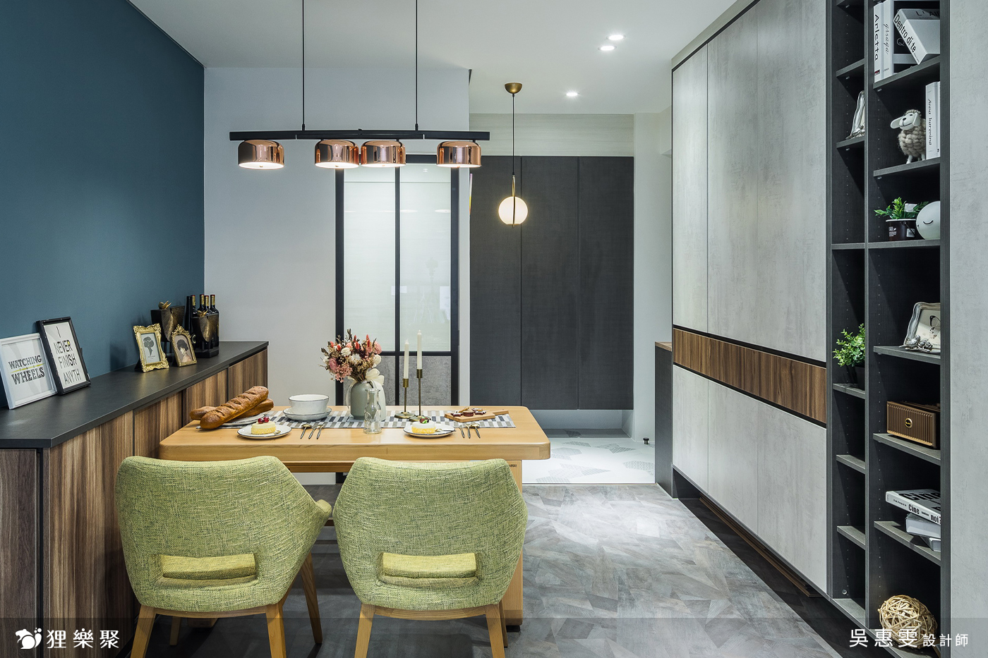 燈具的選擇能夠引領風格的走向,在玄關選擇特別的造型金屬環燈具,使人一踏進家門就能眼睛為之一亮,餐廳主燈則是金屬吊燈,大氣的外型和工業風的空間相得益彰。工業風常見的造型燈具如軌道燈、特殊造型金屬燈具等,由於清潔不易,皆不適合設置在廚房,所以廚房燈具選擇了基本的崁燈,提供均勻的燈光即可。