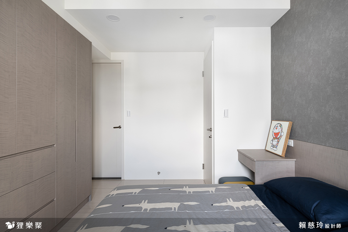 利用系統櫃收納打造大量收納空間,在顏色搭配上以灰色調為主,案例中從玄關延伸到電視主牆的收納櫃選擇仿石紋的灰色門片,主臥則選擇帶有棕色調的灰色打造床頭板、化妝桌及衣櫃,偏暖色的門片讓臥室多了點溫暖的感覺,讓人不自禁的放鬆下來,是適合休憩空間的色調。