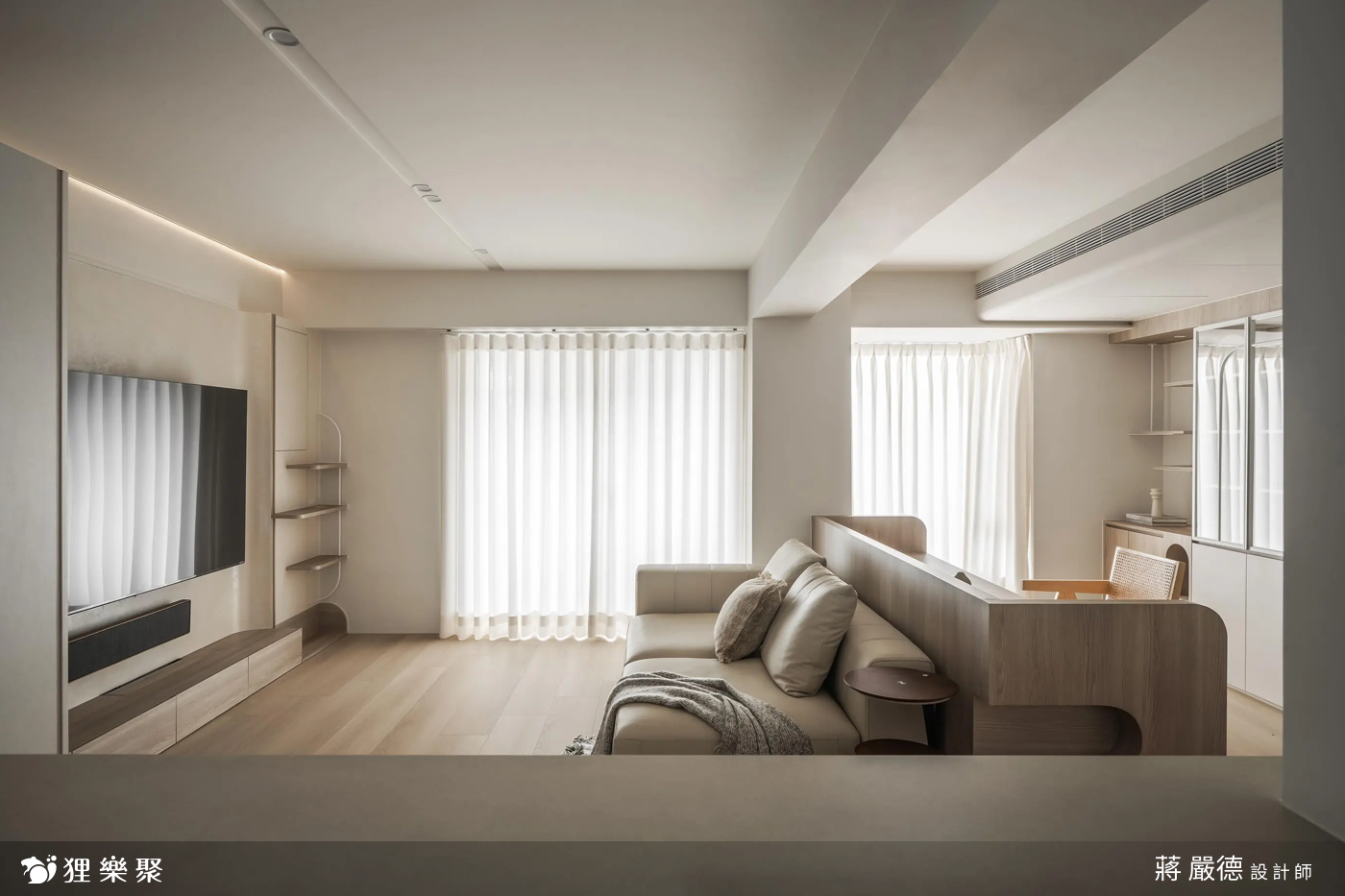 這個案子是一間14坪兩房兩廳的小宅,屋主希望有簡約乾淨的氛圍,因此設計師選用北歐風設計,天花與牆面以灰白色系為主,搭配嵌燈及落地窗,還有淺色系的木地板,創造出充足的採光以及北歐風的基底。