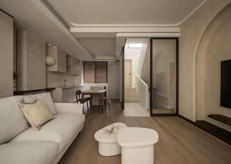 本案以暖色調打造主要生活空間,搭配實木層板及深色木皮形塑空間層次感。