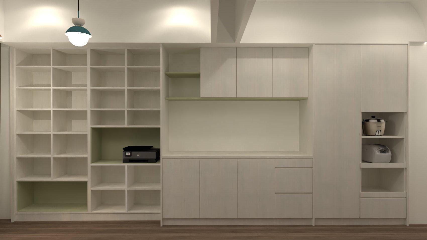 室內空間不大,業主需要一個多功能且滿足她目前鍋具.作業的櫃體規劃