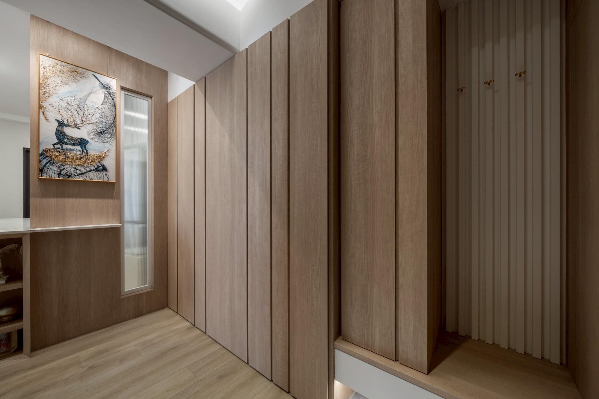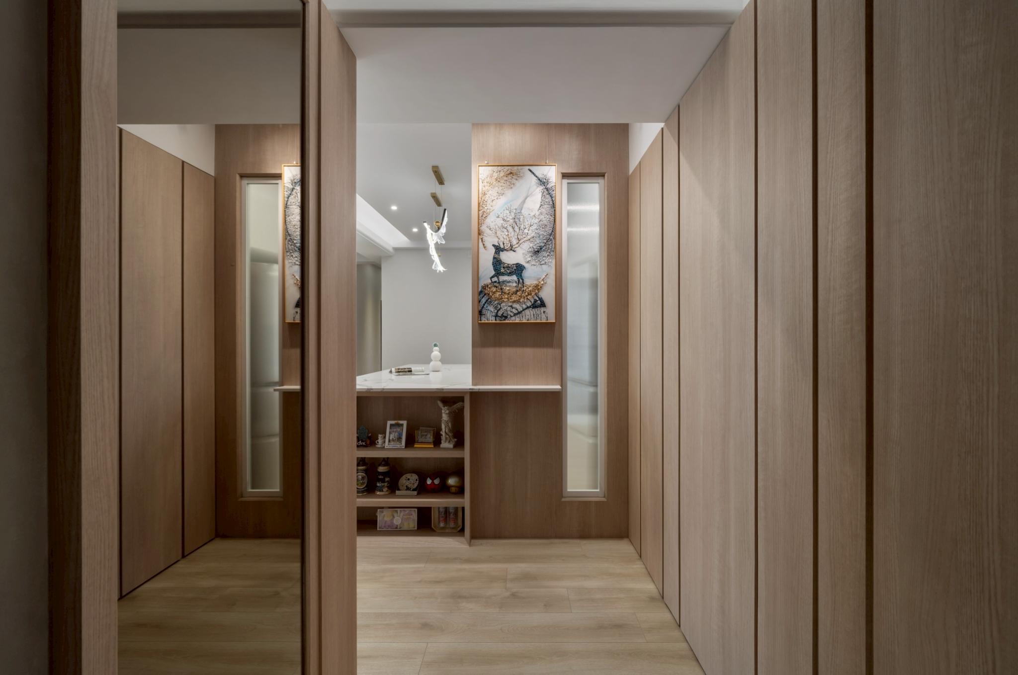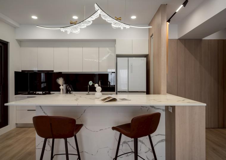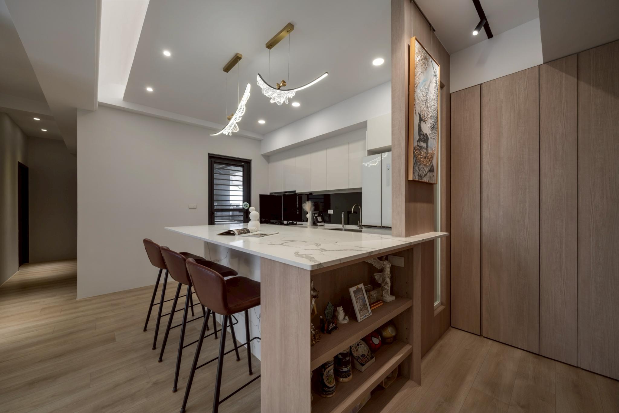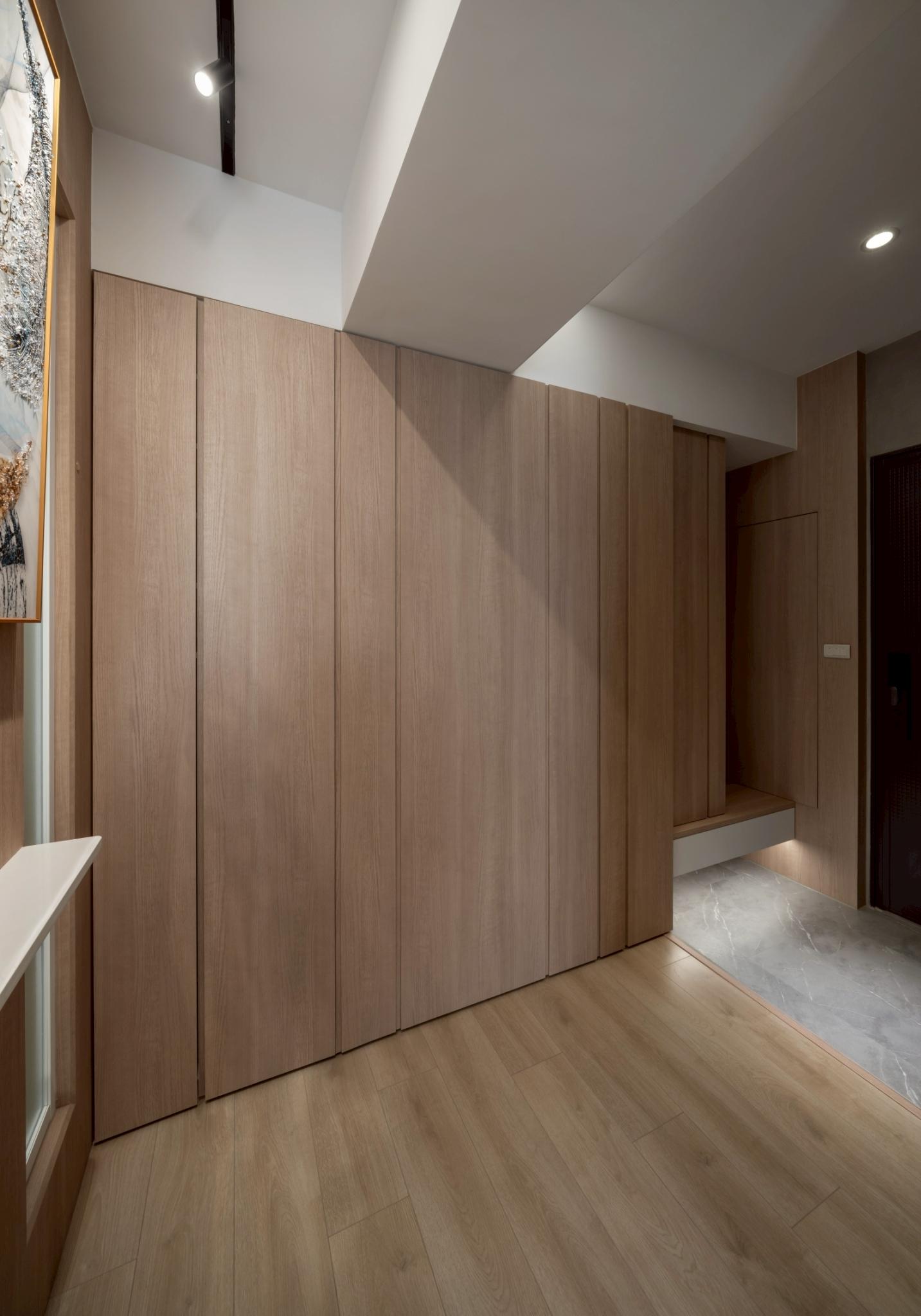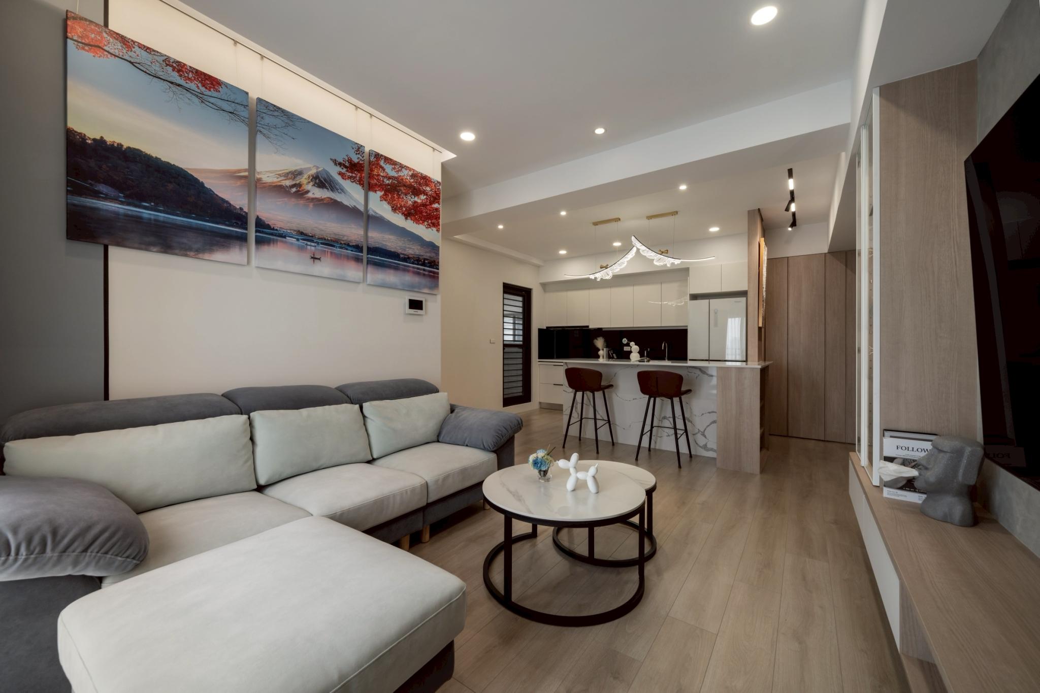 這間42坪的新成屋融合北歐風與現代風裝潢,主要著重收納設計,搭配木材質與白、灰色調。在玄關、客廳、餐廚區營造溫暖、舒壓氛圍,襯上多功能的中島設計,讓屋主有如置身咖啡廳般輕鬆自在。私領域以現代風簡約線條打造充足收納,兼具美型與實用機能,透過裝修為屋主形塑優雅居家。