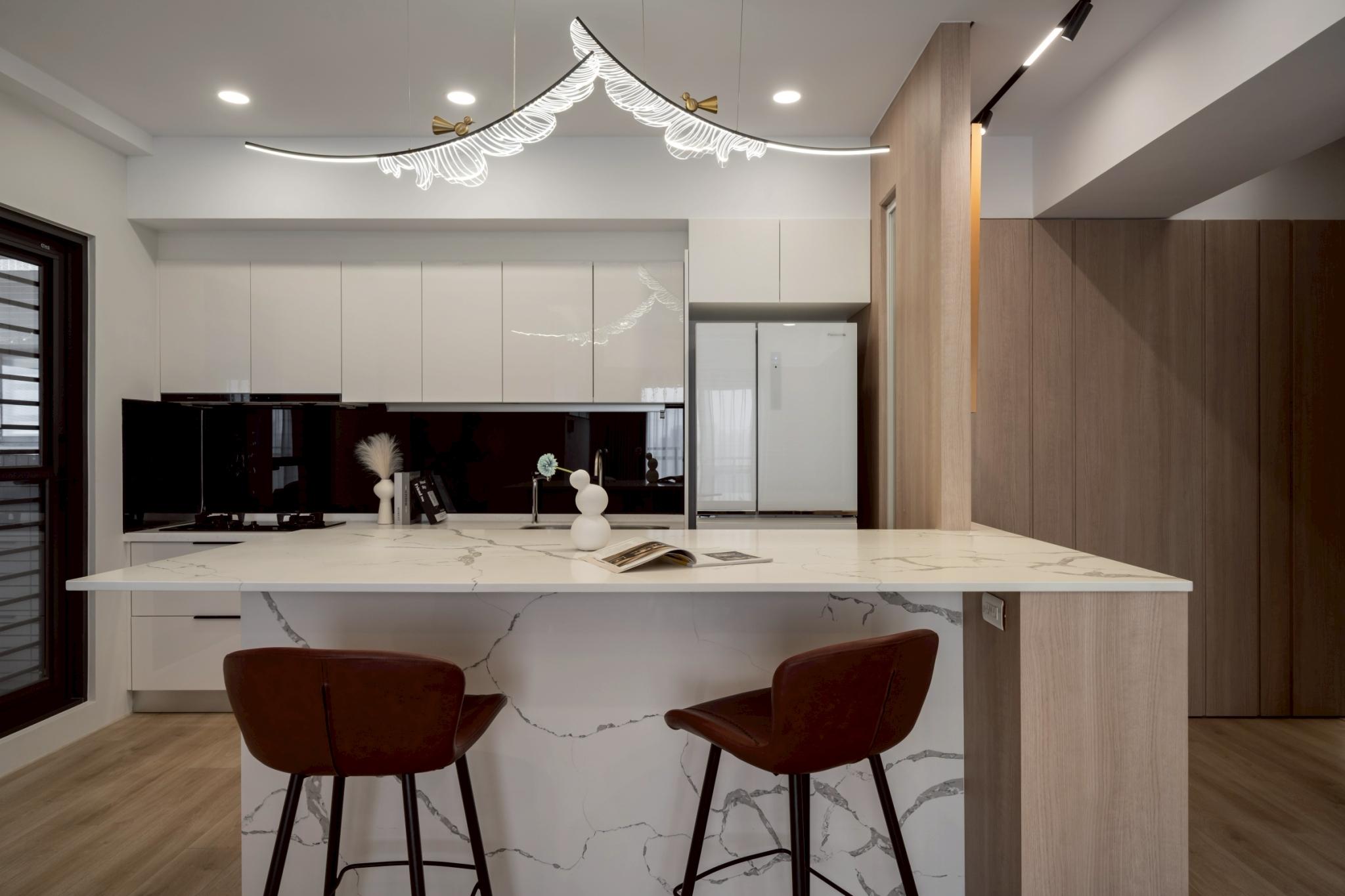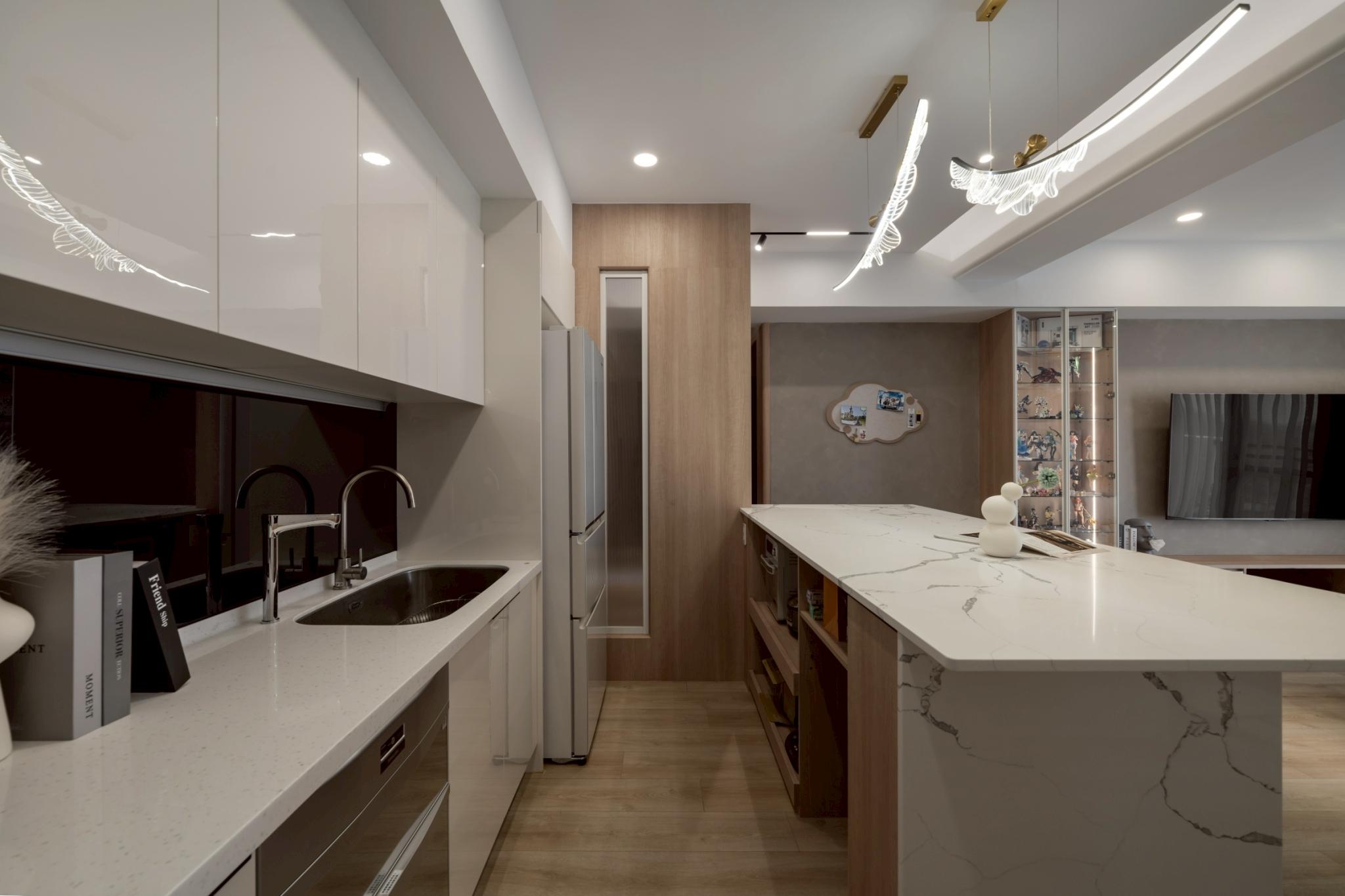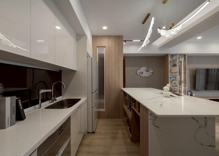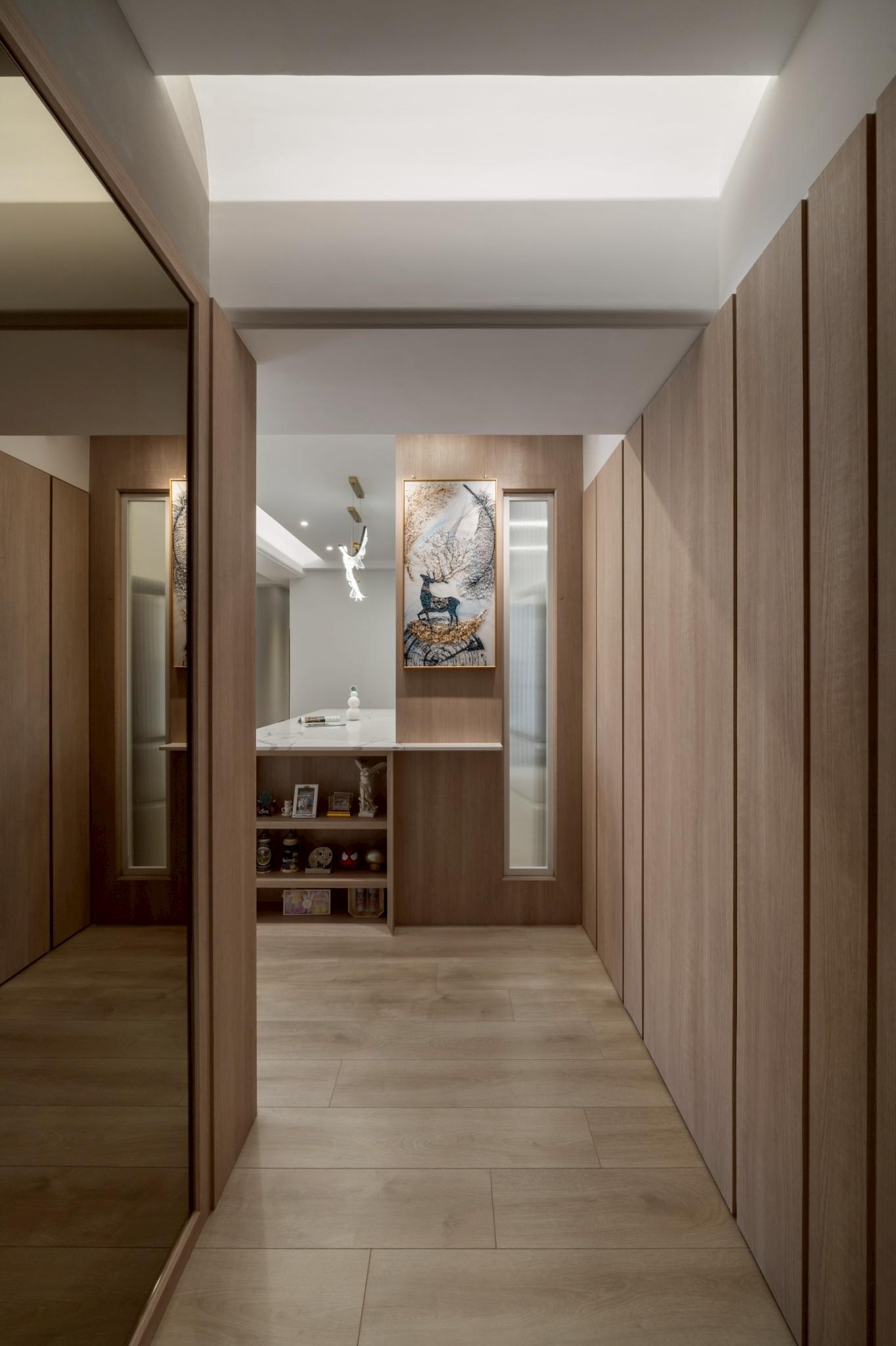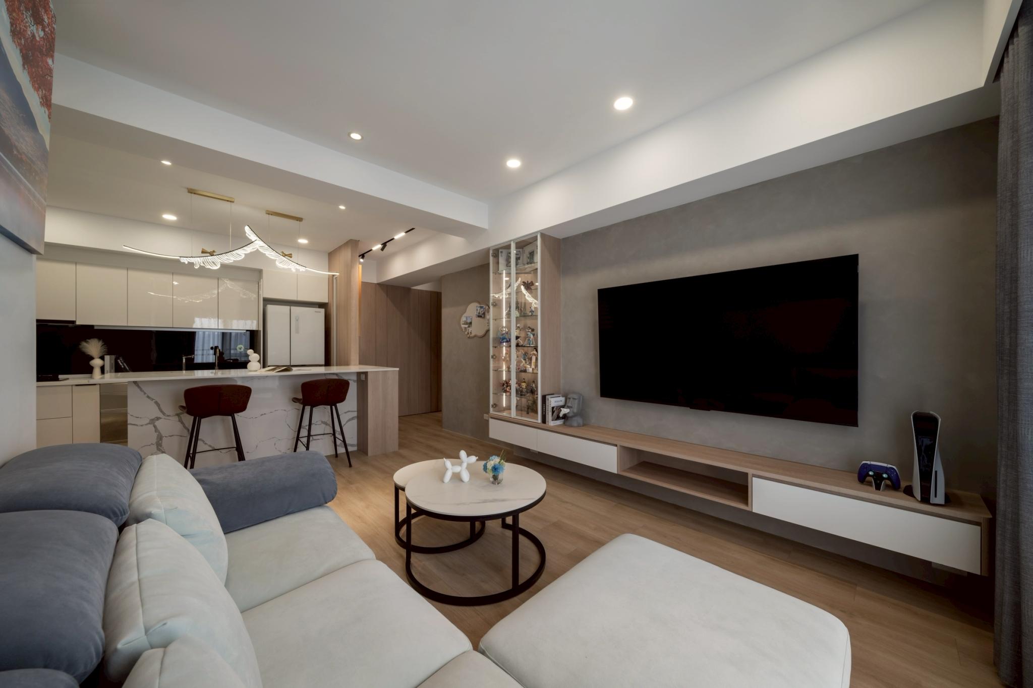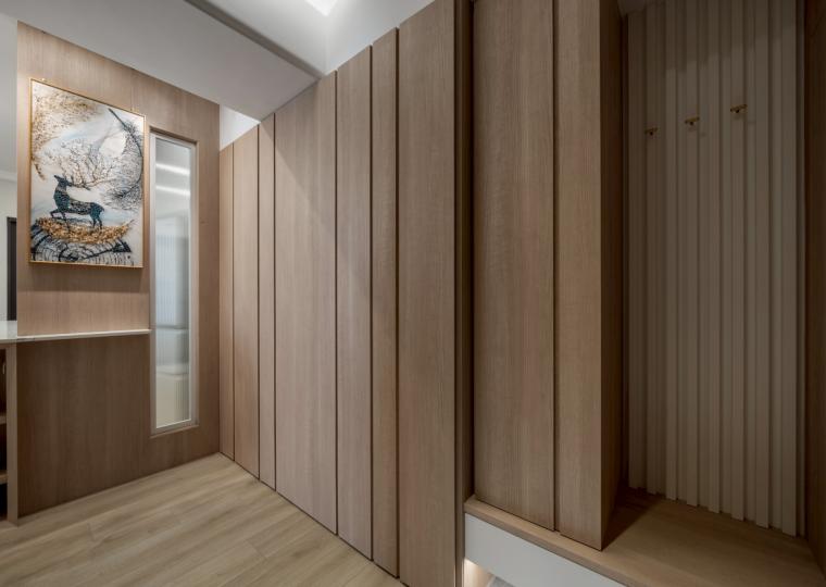 這間42坪的新成屋融合北歐風與現代風裝潢,主要著重收納設計,搭配木材質與白、灰色調。在玄關、客廳、餐廚區營造溫暖、舒壓氛圍,襯上多功能的中島設計,讓屋主有如置身咖啡廳般輕鬆自在。私領域以現代風簡約線條打造充足收納,兼具美型與實用機能,透過裝修為屋主形塑優雅居家。