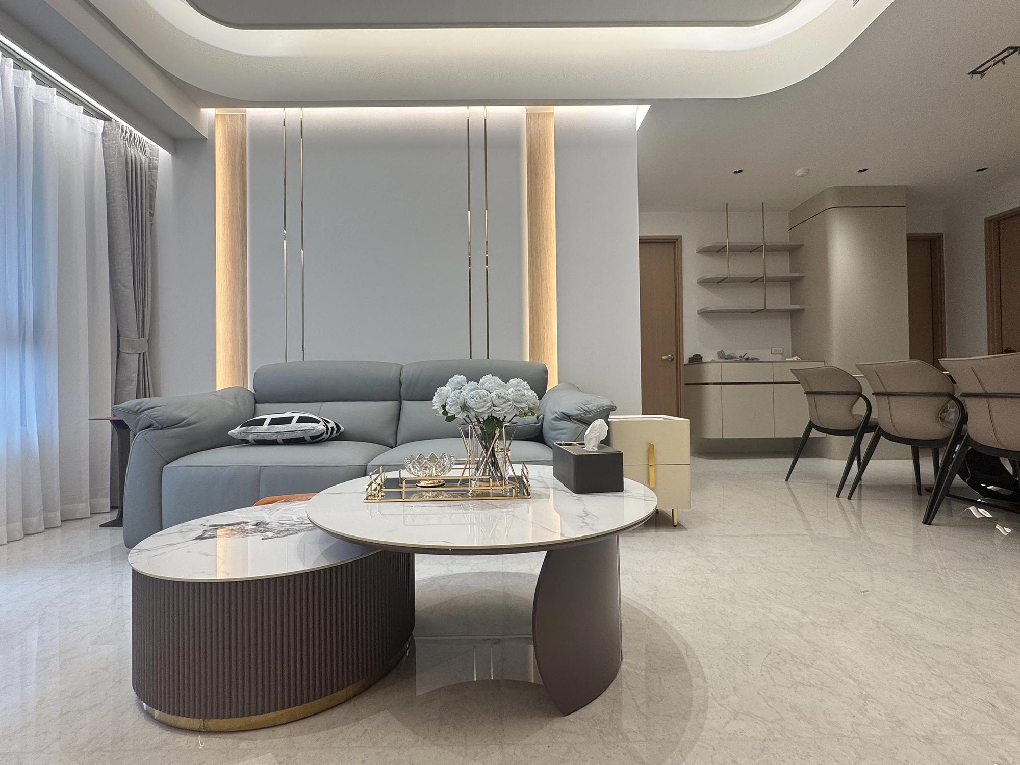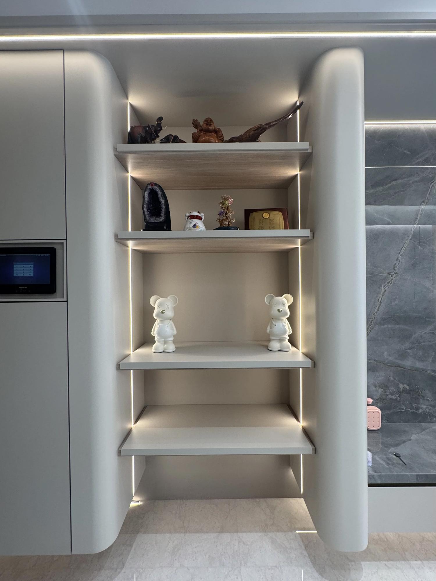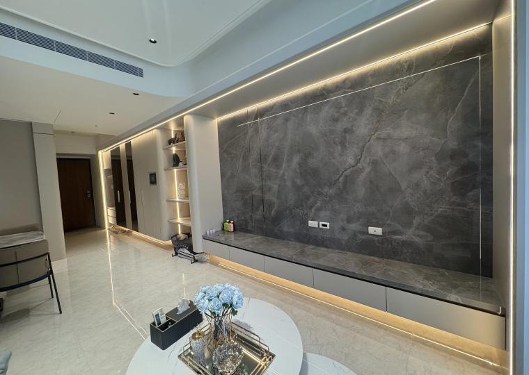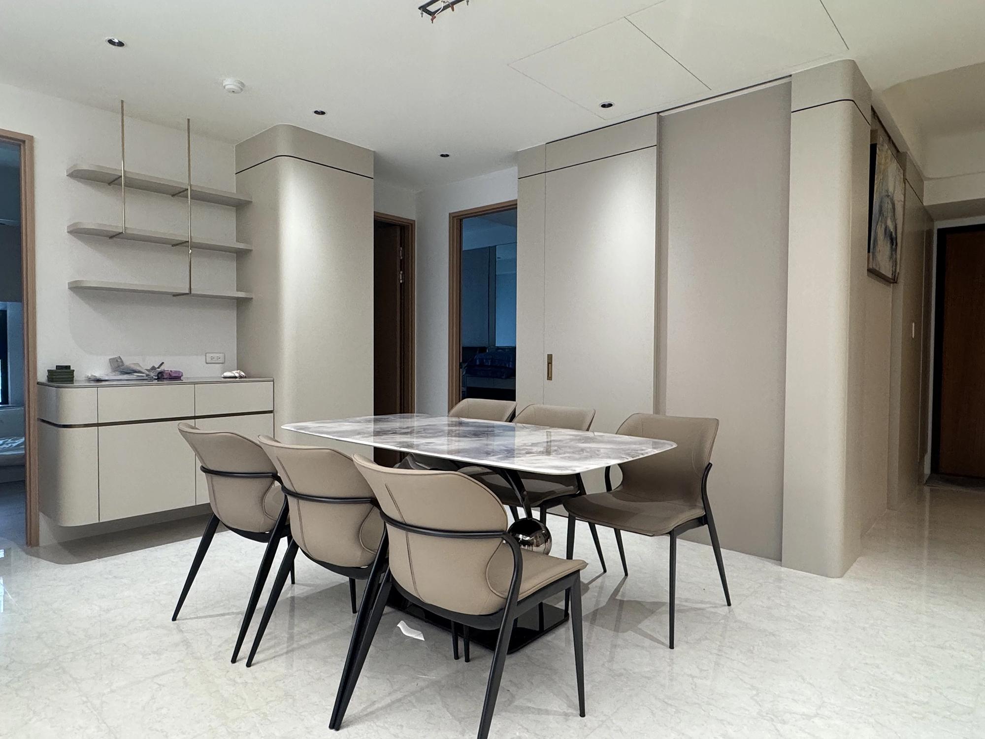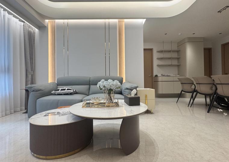 全室以簡約現代設計結合弧形天花板、導圓角與圓弧語彙,搭配系統櫃、金屬鏡面元素、間接燈具照明營造高質感裝潢氛圍。客廳電視牆俐落且實用,餐廳裝修選用柔和色調,兼具展示收納與用餐機能,展現舒適美感,滿足三代同堂的各項需求,打造26坪的自在療癒居所。