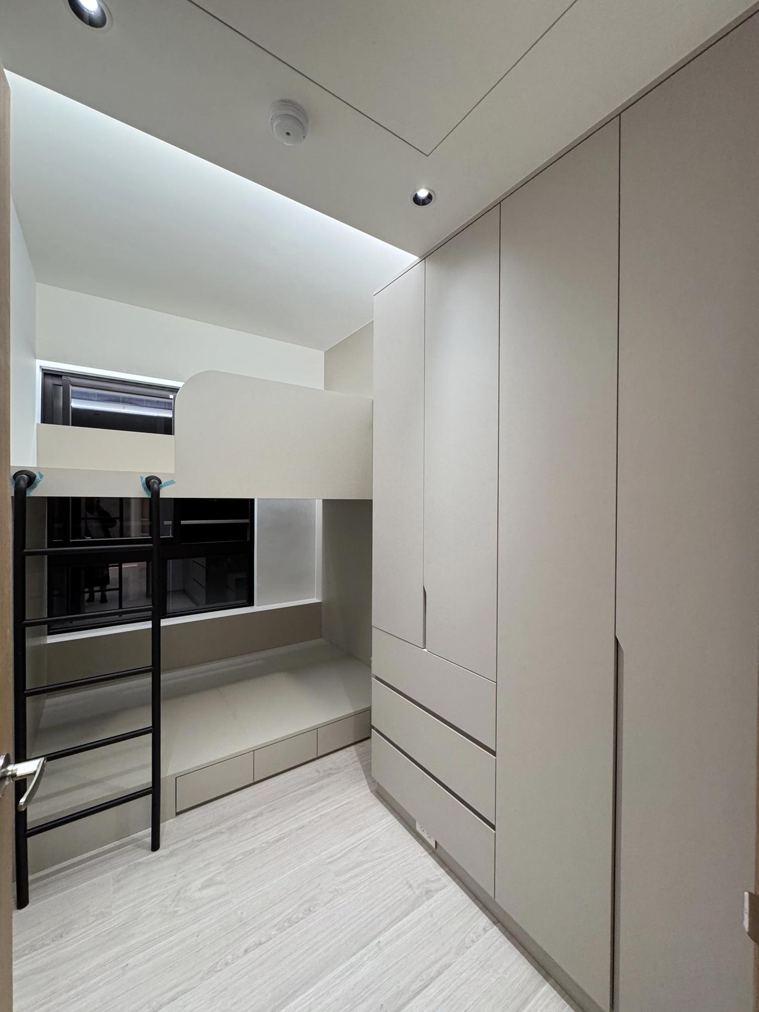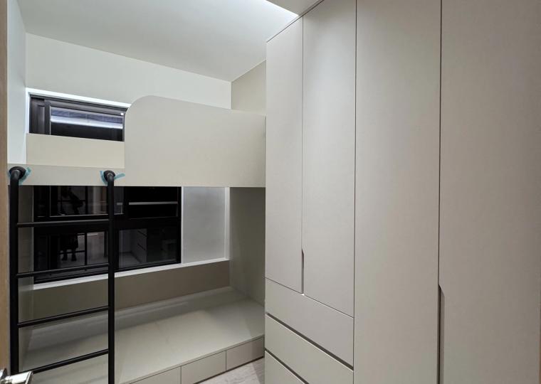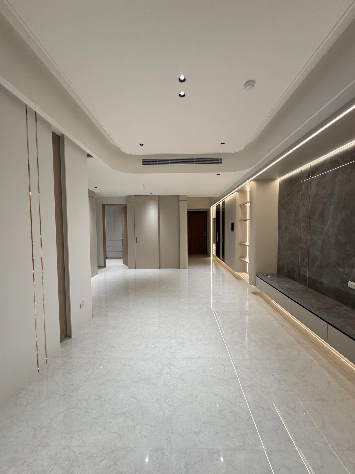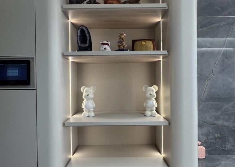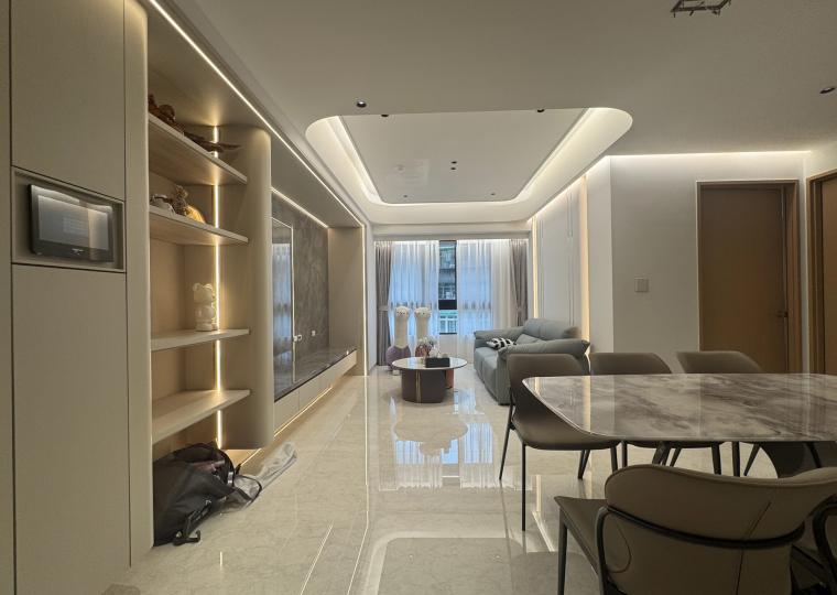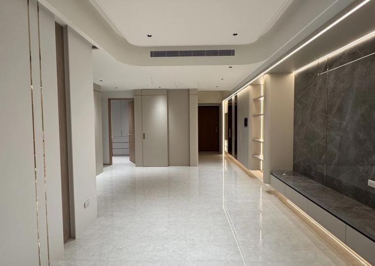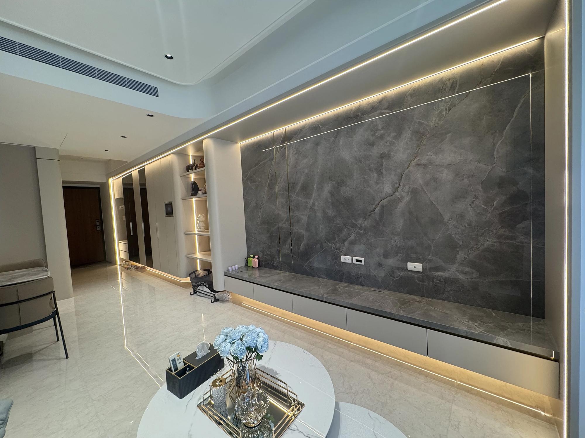 全室以簡約現代設計結合弧形天花板、導圓角與圓弧語彙,搭配系統櫃、金屬鏡面元素、間接燈具照明營造高質感裝潢氛圍。客廳電視牆俐落且實用,餐廳裝修選用柔和色調,兼具展示收納與用餐機能,展現舒適美感,滿足三代同堂的各項需求,打造26坪的自在療癒居所。