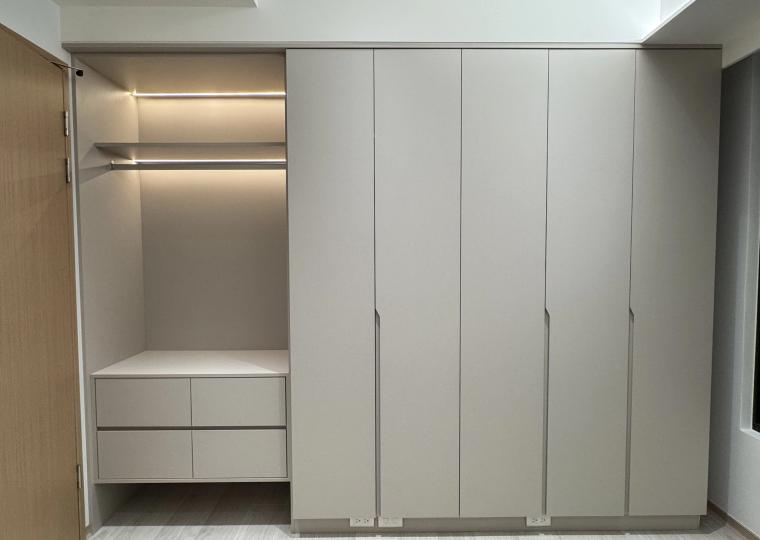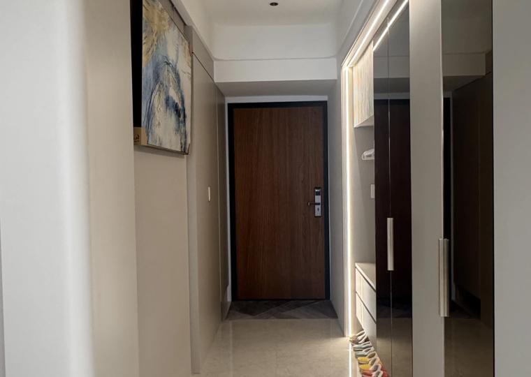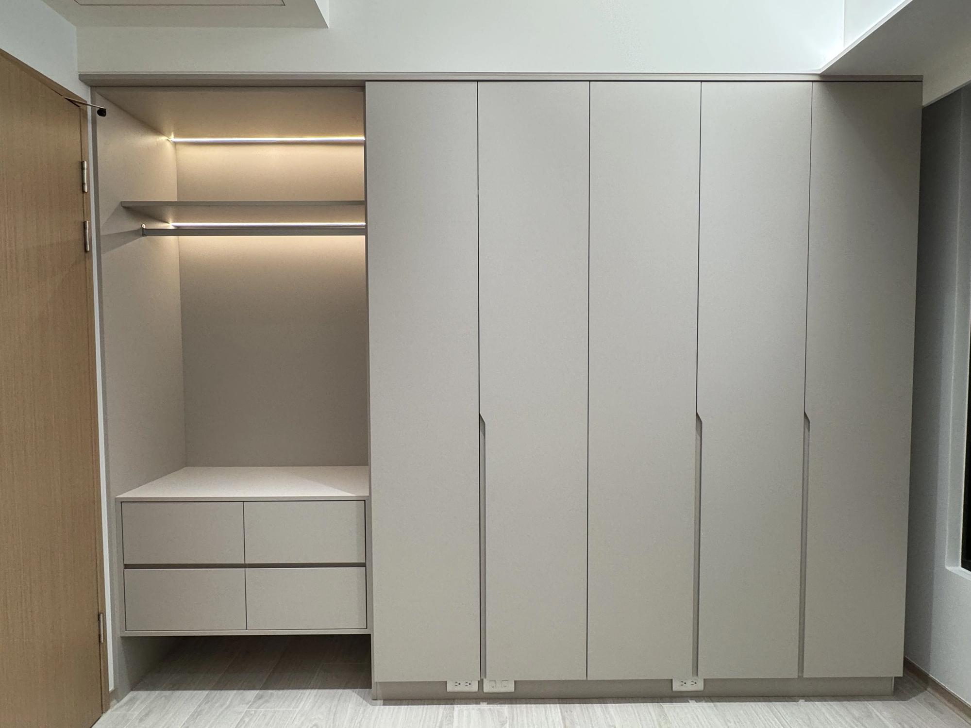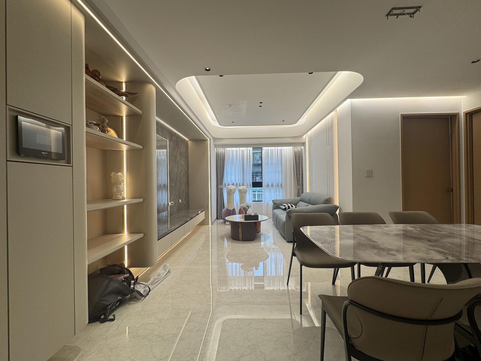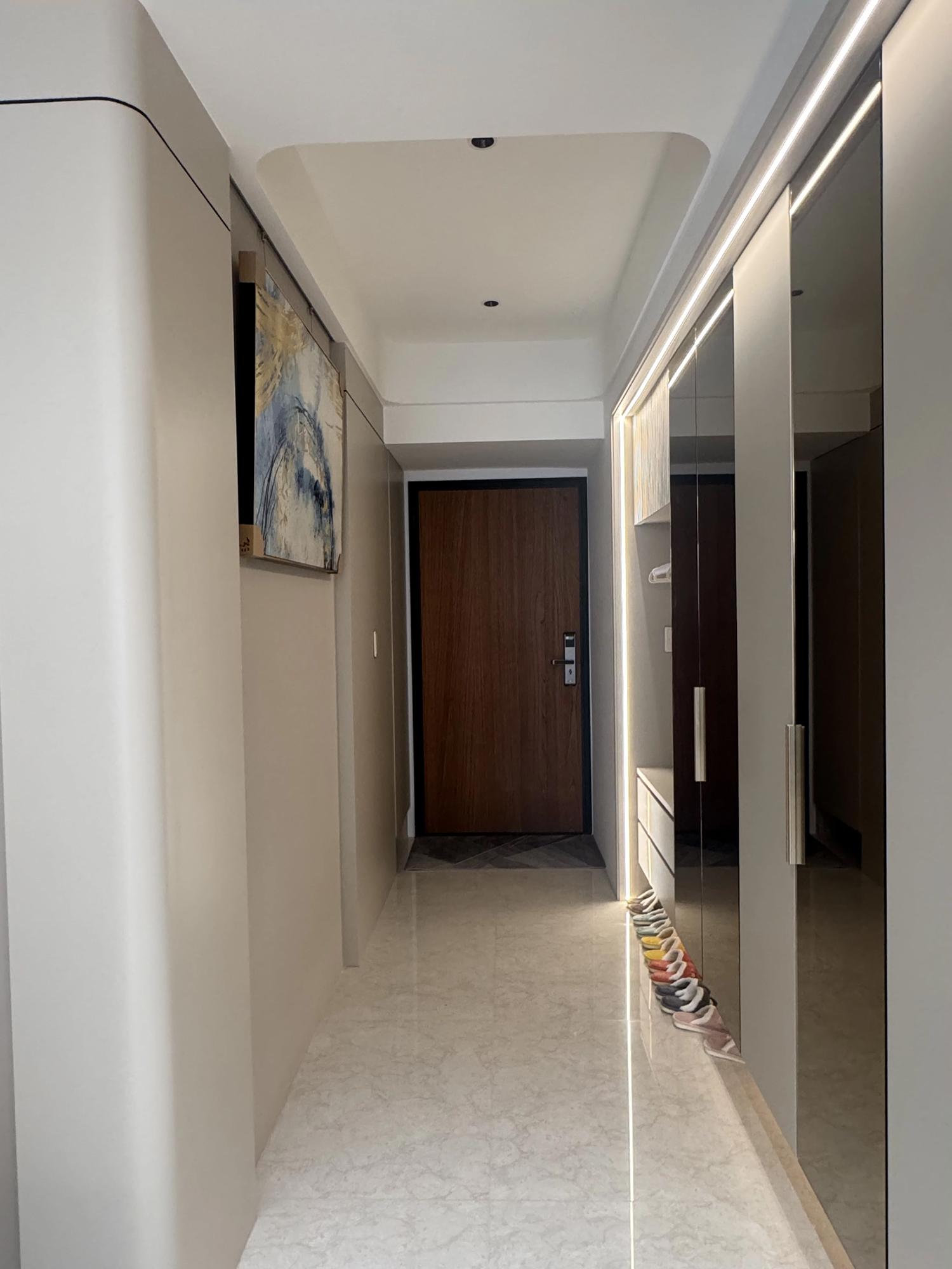 全室以簡約現代設計結合弧形天花板、導圓角與圓弧語彙,搭配系統櫃、金屬鏡面元素、間接燈具照明營造高質感裝潢氛圍。客廳電視牆俐落且實用,餐廳裝修選用柔和色調,兼具展示收納與用餐機能,展現舒適美感,滿足三代同堂的各項需求,打造26坪的自在療癒居所。