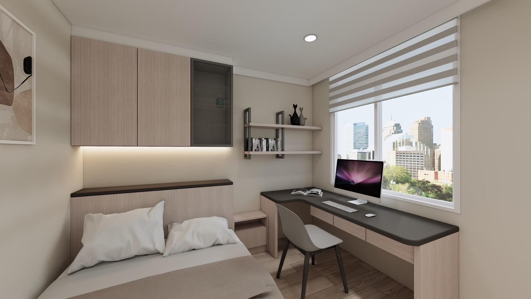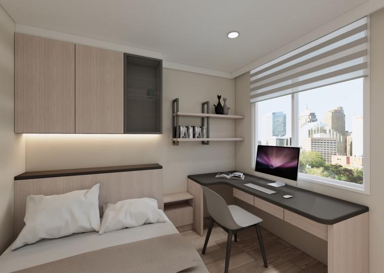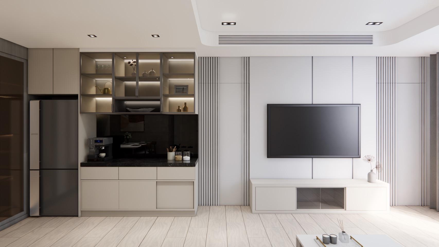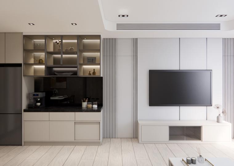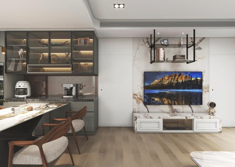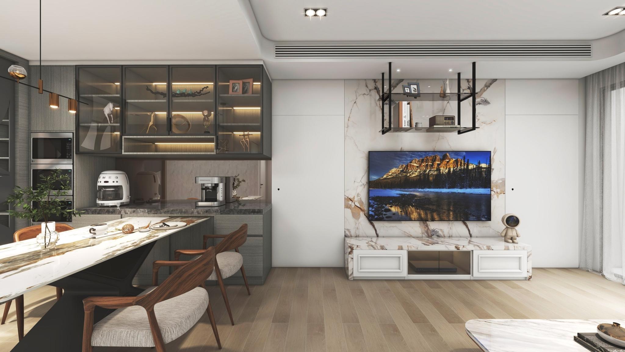 客廳與餐廚區以簡潔線條搭配開放格局,讓自然光成為主角,使空間通透且宜人;臥室與書房則在有限尺度中整合機能,提升空間效率,展現極致的實用美學。電視牆運用大理石紋理與懸浮層架設計,突顯現代工藝美感。