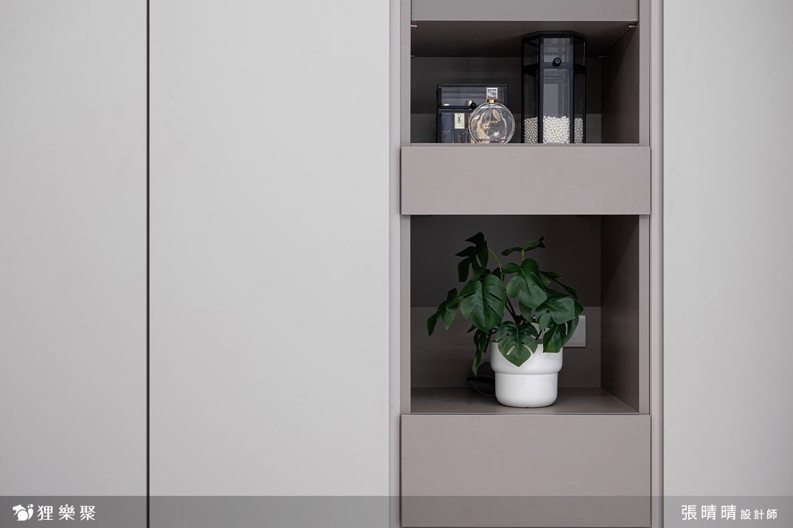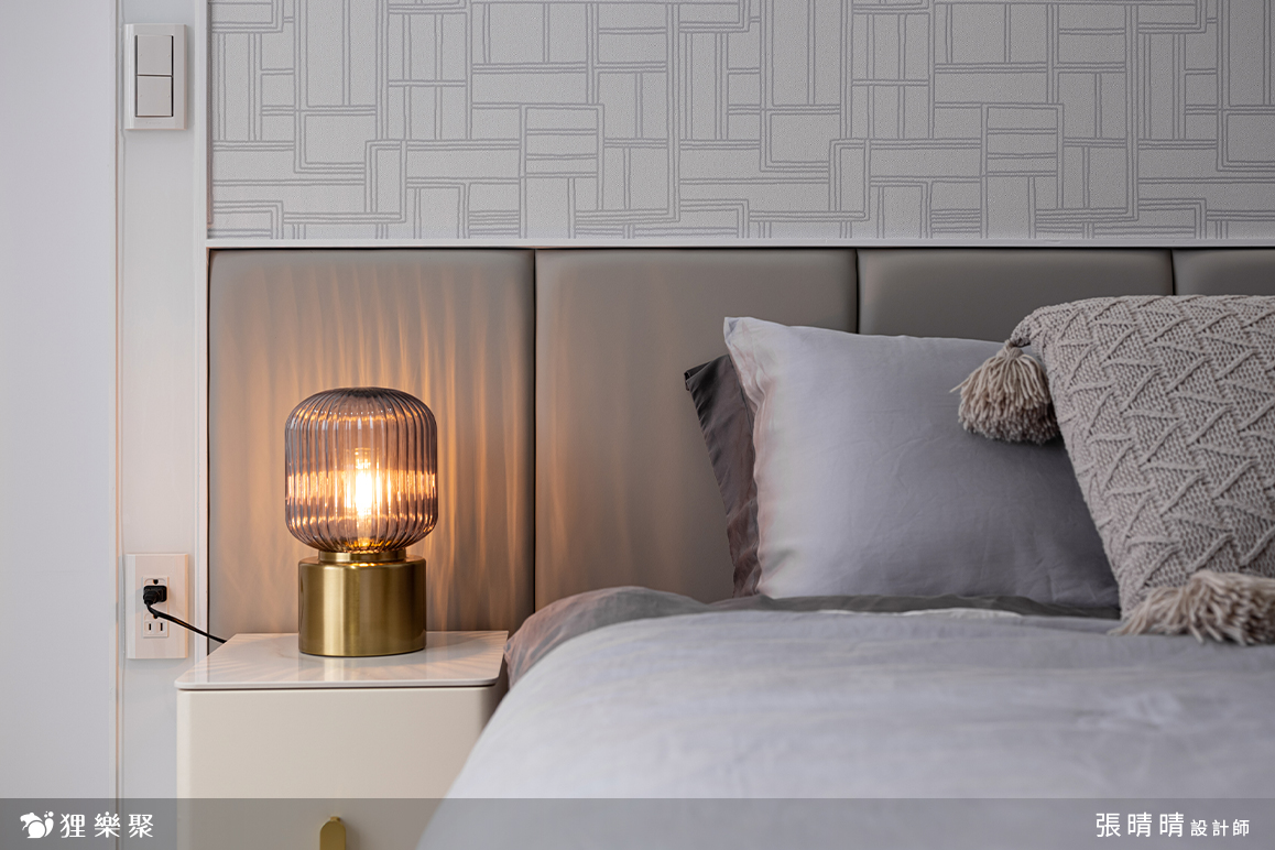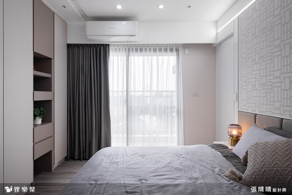 柔和優雅的莫蘭迪色系,將臥室妝點的寧靜自在。白色隱藏門簡化了空間的元素,乾淨完整的臥室除了提高屋主的睡眠品質,也讓滿是喧囂的心更可以沉澱下來。