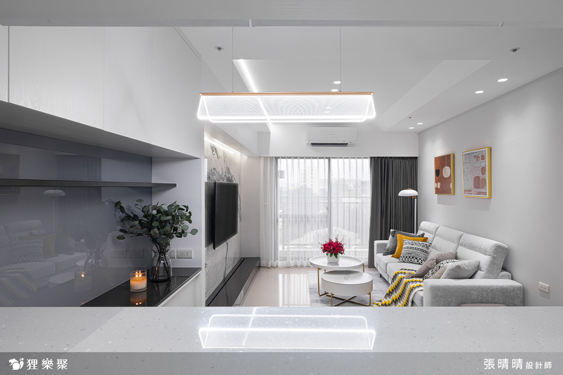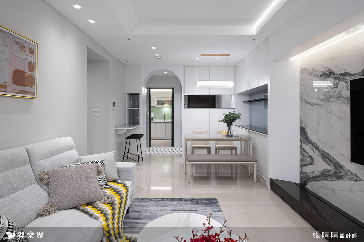 設計師運用適當的比例,打造出氣勢壯麗的石紋陶板電視牆,放大客廳空間感受。加上屋主委請設計師搭配挑選傢俱軟裝,使兩者完整融合,錯落有致的層次堆疊讓小宅舒適開闊,有了全新的樣貌。