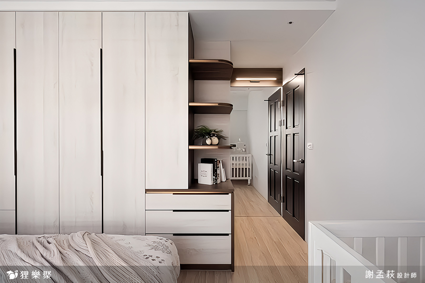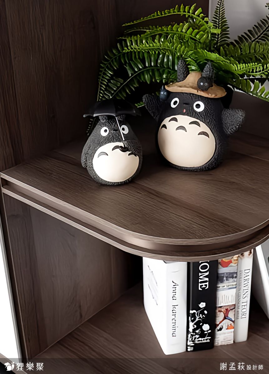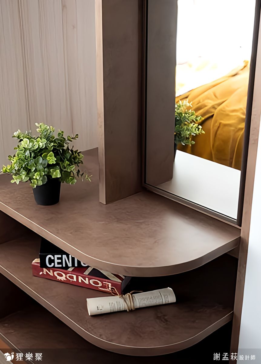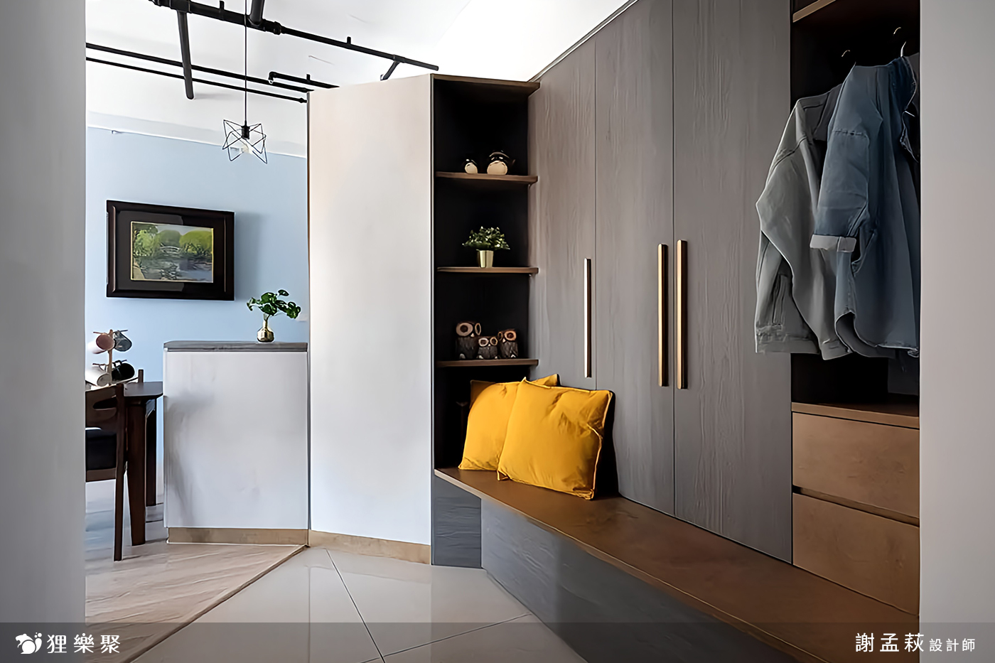 玄關以45度微轉角延伸櫥櫃,巧妙帶出多功能的收納空間,包括儲藏高櫃、電器櫃、吧檯桌、茶水台,並結合穿鞋椅,是個不失機能性的巧妙空間,系統櫃的不再只是垂直水平、90度轉角排列,打破以往人們對系統櫃的印象,利用不同的轉角序列,更能活化空間的搭配。