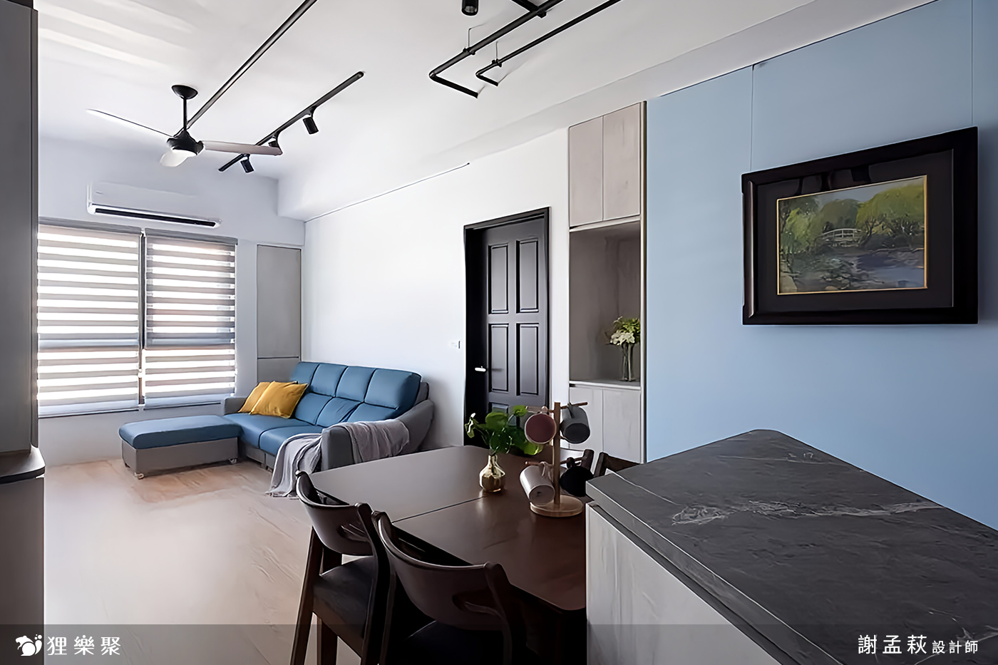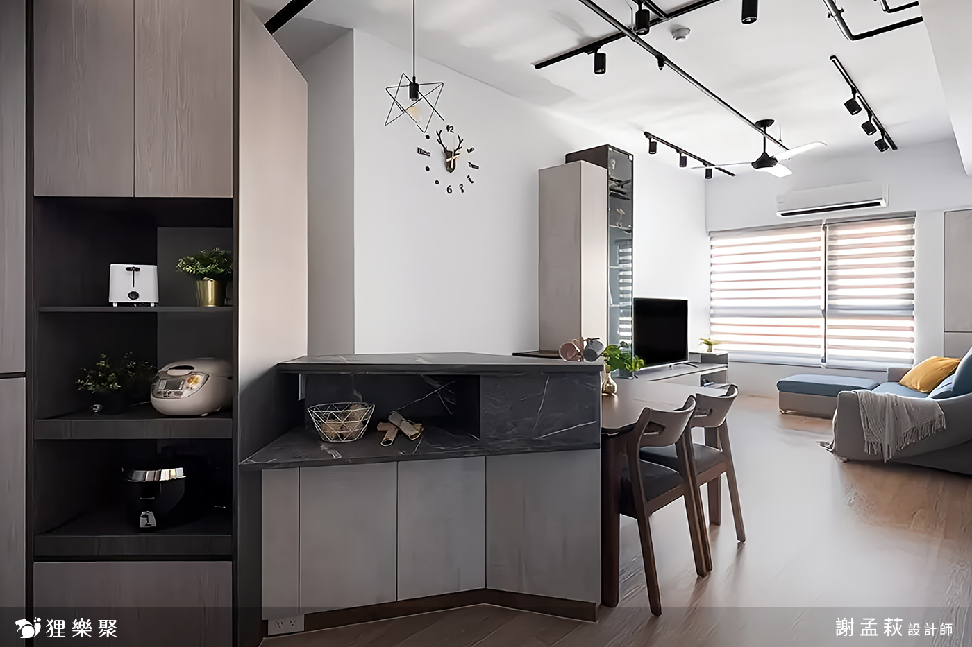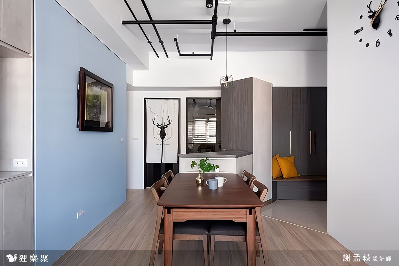 將排水管漆上黑色的漆,搭配上軌道燈,在裸露天花板帶出線條感,同時也能保有空間的高度,減少小坪數空間的壓迫感;在系統櫃和家具的顏色搭配上選擇仿舊感的木紋,營造出工業風的斑駁感,另外,在一些不經意的小細節鑲嵌上金屬邊條,讓家中質感再提升,輕工業風裝潢也能與輕奢感交會。