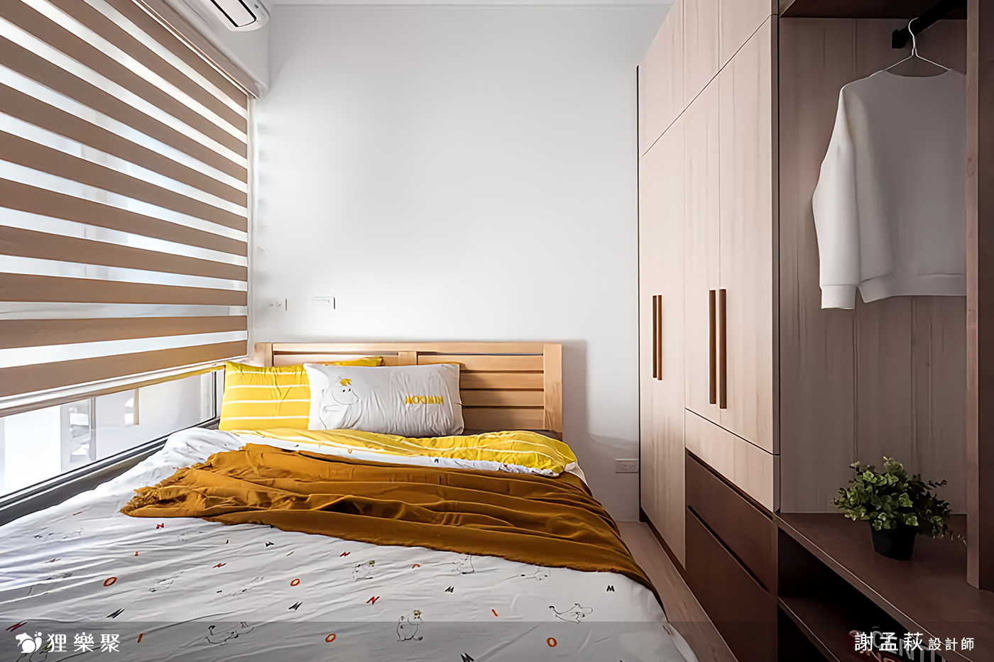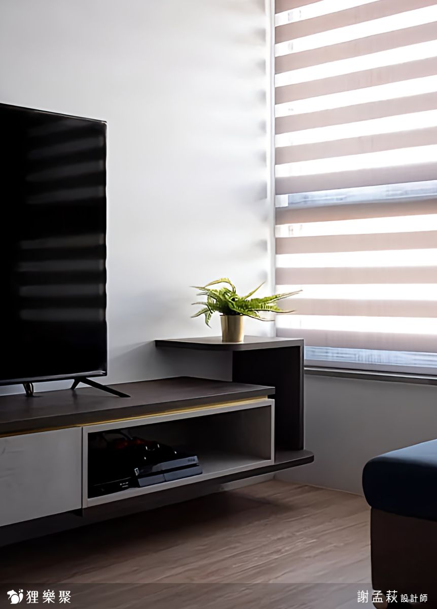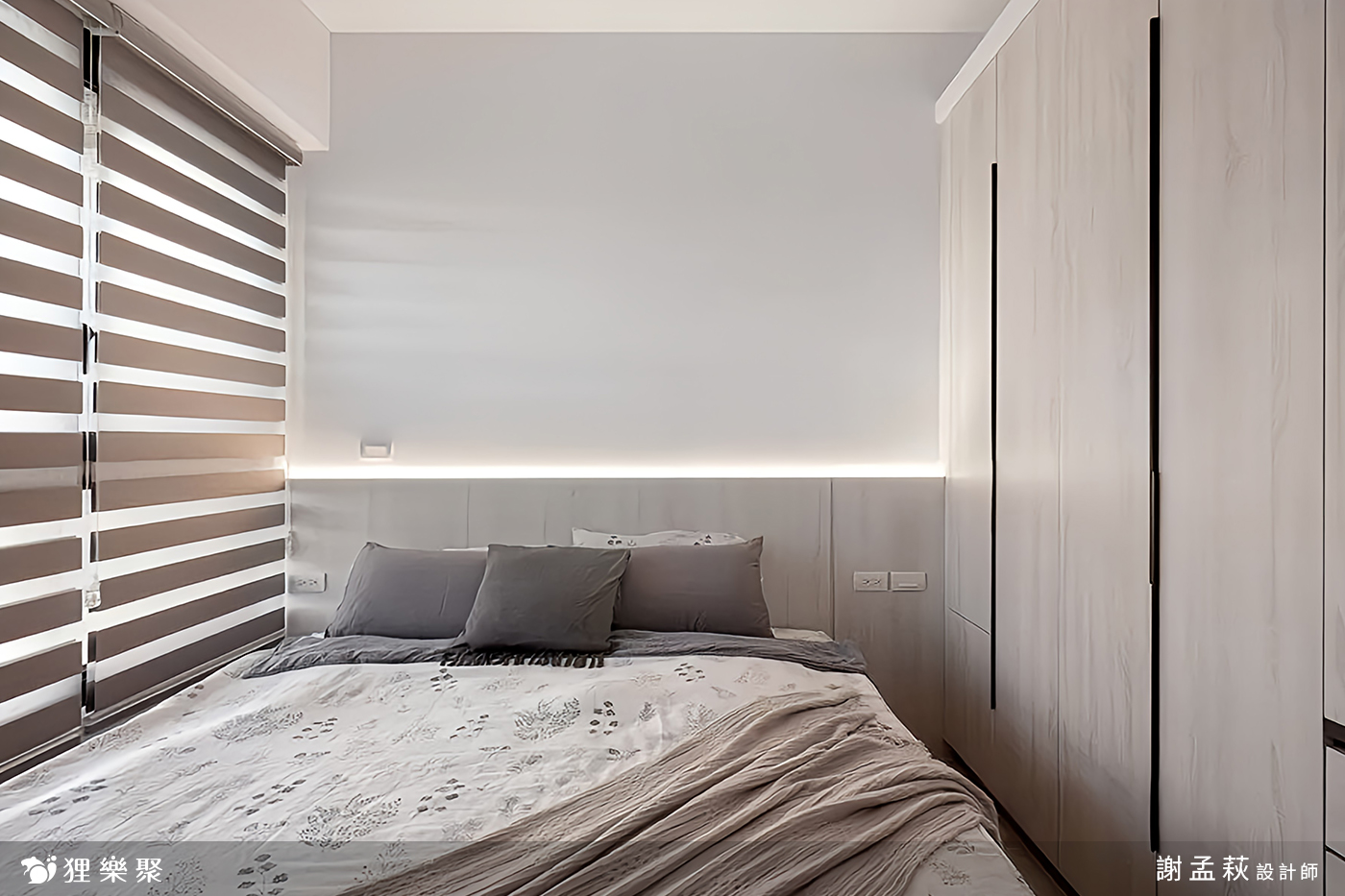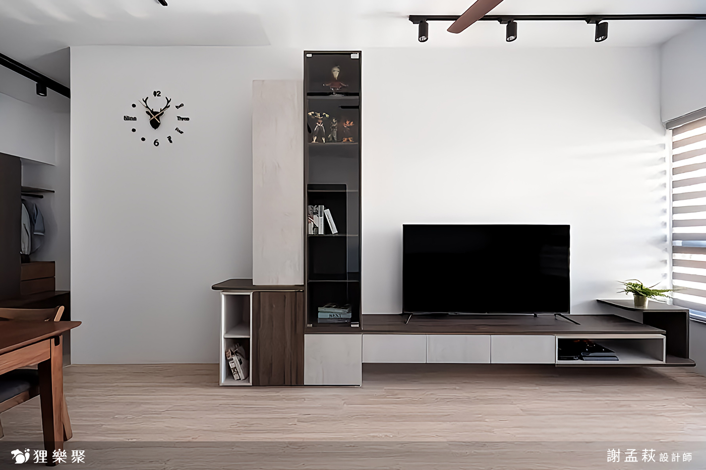 將排水管漆上黑色的漆,搭配上軌道燈,在裸露天花板帶出線條感,同時也能保有空間的高度,減少小坪數空間的壓迫感;在系統櫃和家具的顏色搭配上選擇仿舊感的木紋,營造出工業風的斑駁感,另外,在一些不經意的小細節鑲嵌上金屬邊條,讓家中質感再提升,輕工業風裝潢也能與輕奢感交會。