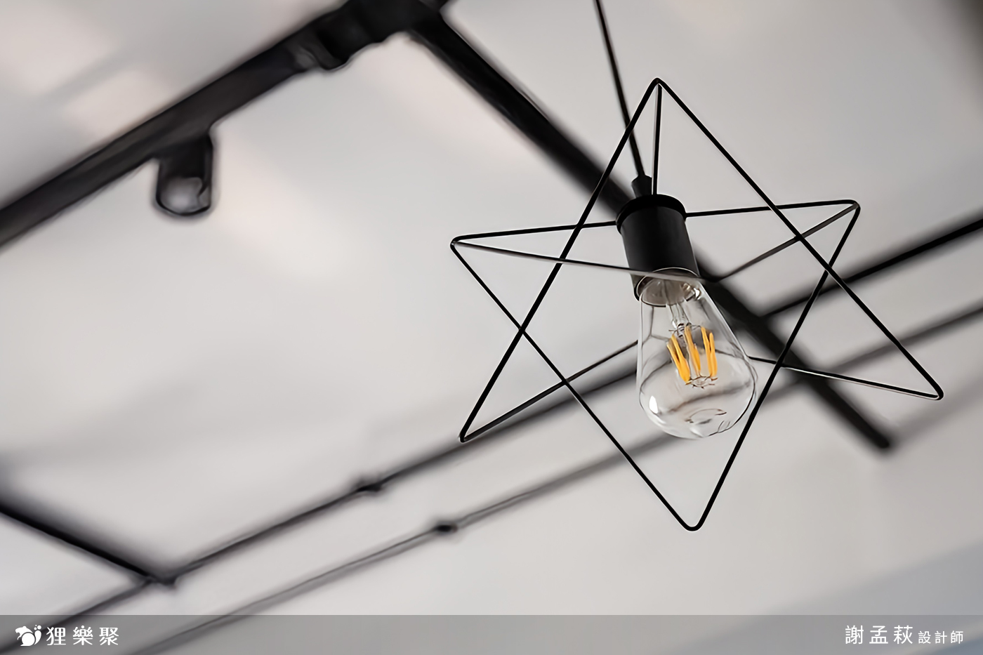 軌道燈是輕工業風設計的經典元素之一,除了作為空間的線條重點外,軌道燈能夠自由調整想照射的區域,對於營造氣氛也是一大得力助手,在吧檯區域搭配用星星造型的簡約吊燈,讓燈具的整體規劃更加一致,呈現出線條俐落簡約輕工業風裝潢。